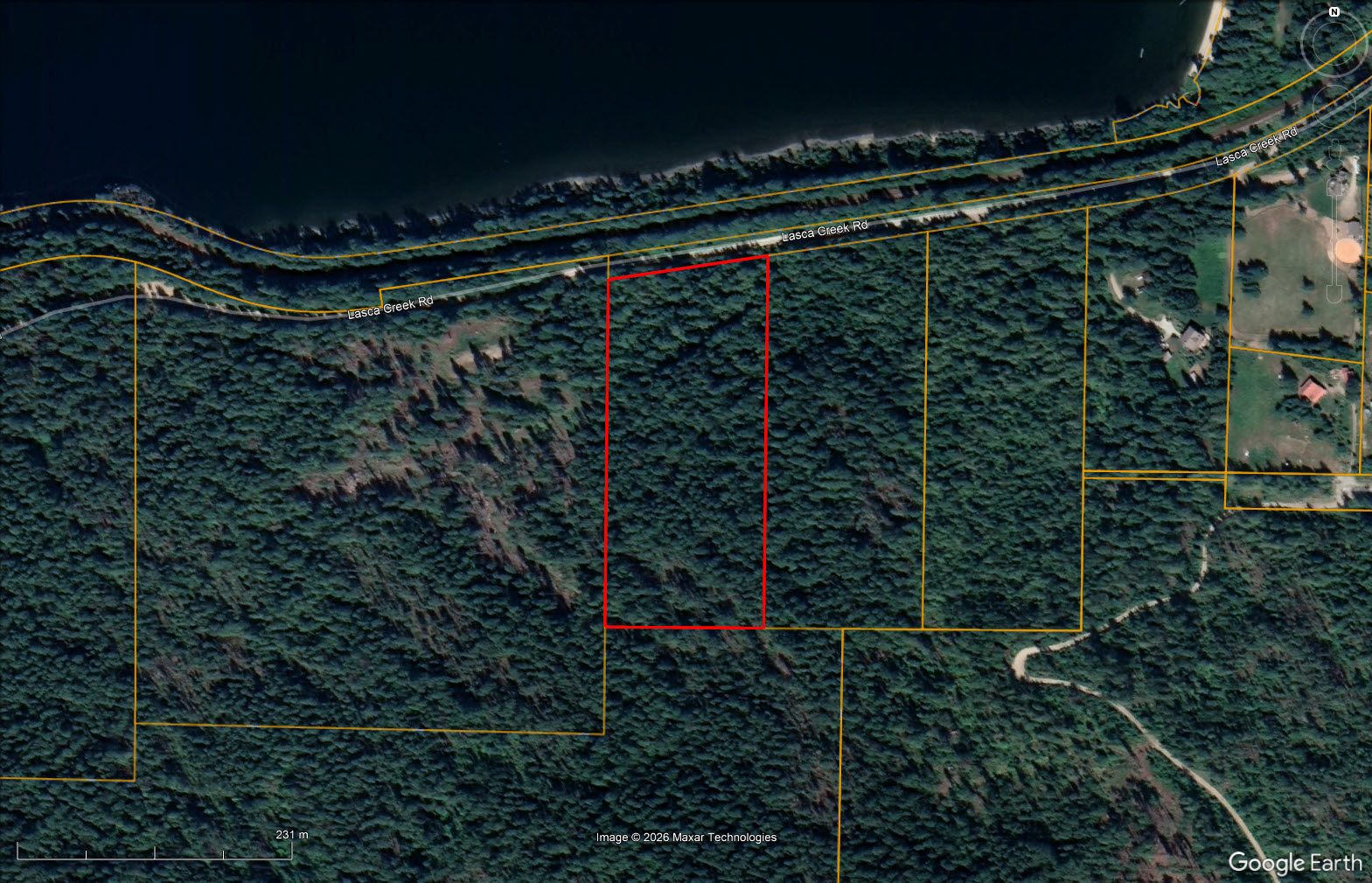Access is via the Harrop-Procter cable ferry, a short 5-minute crossing that runs on demand, 24 hours a day, 7 days a week. The property fronts onto Lasca Creek Road, providing reliable year-round access.