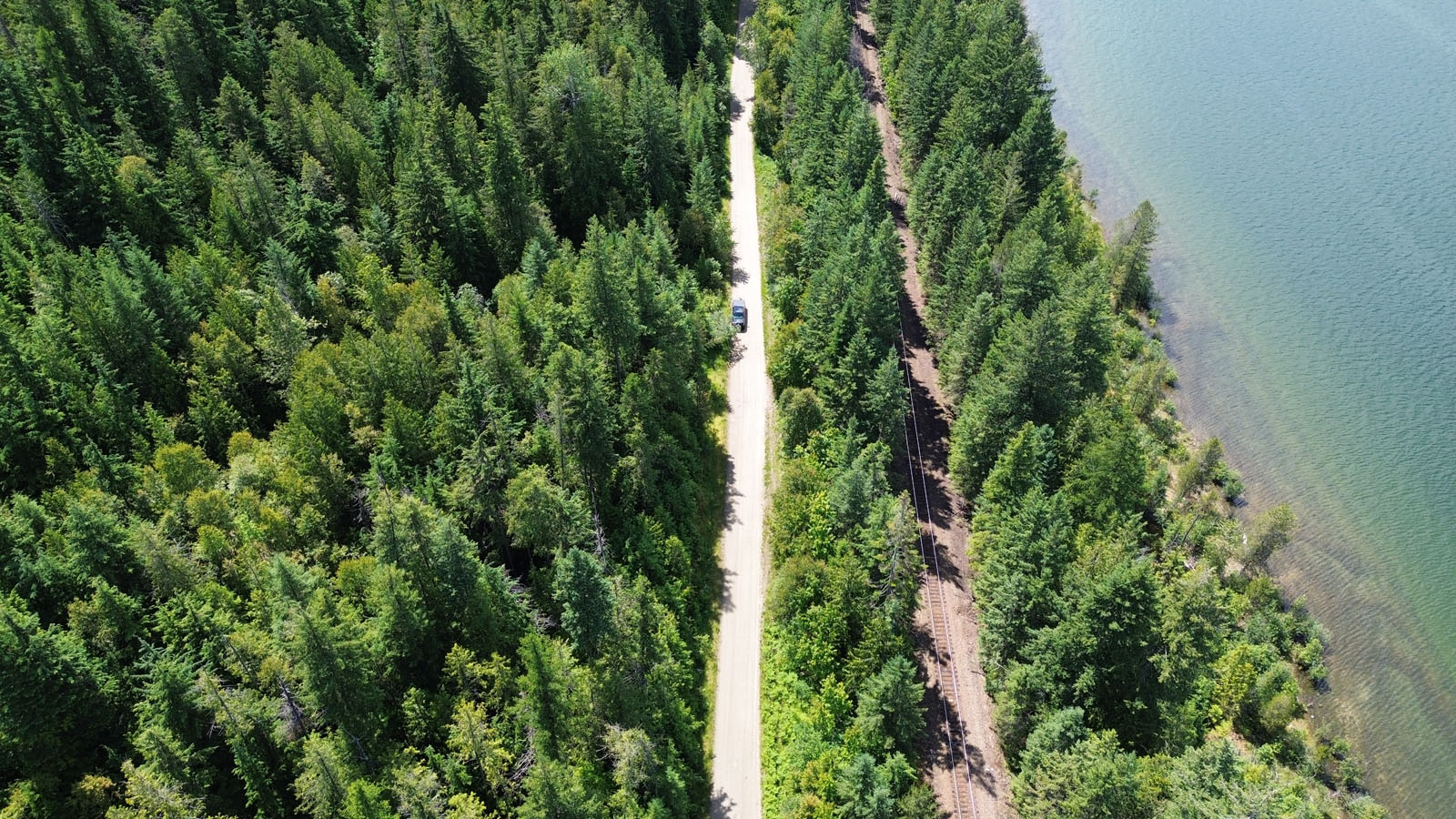 A path across the road and rail line leads to a quiet stretch of Kootenay Lake shoreline, offering convenient access to the water.
