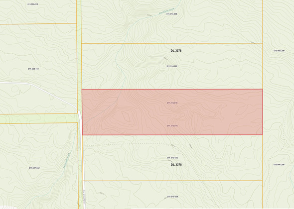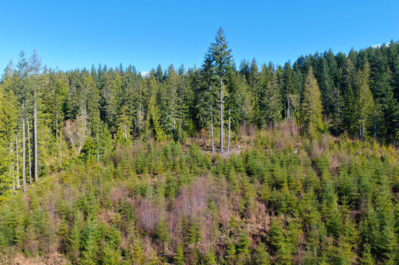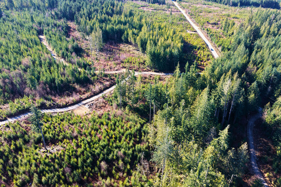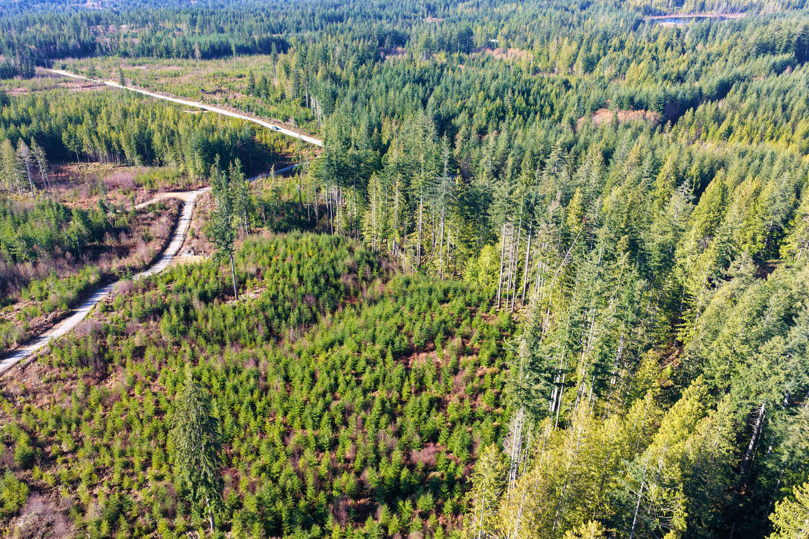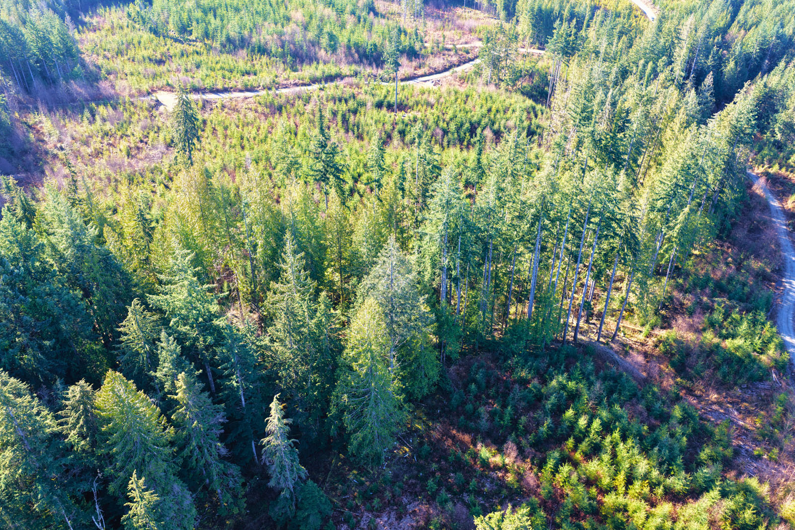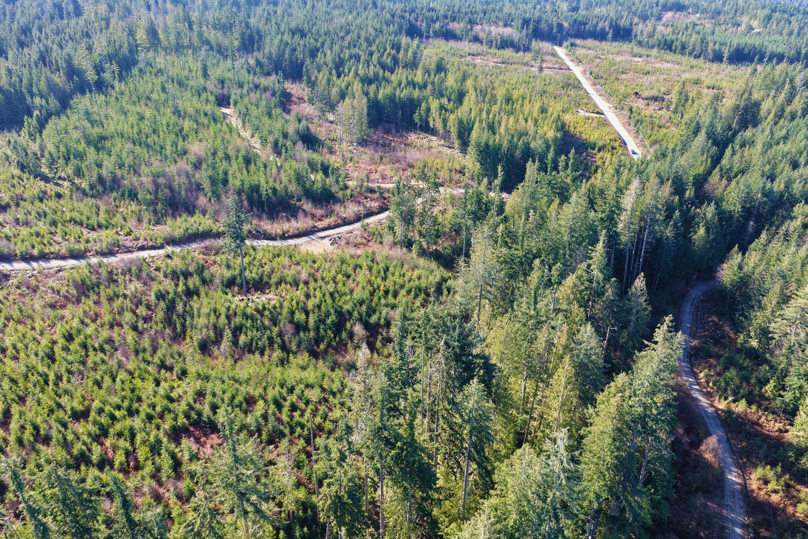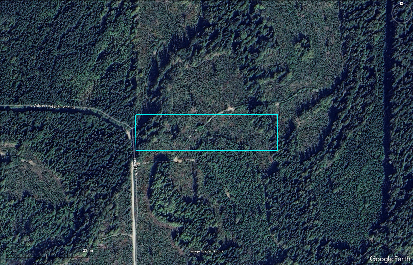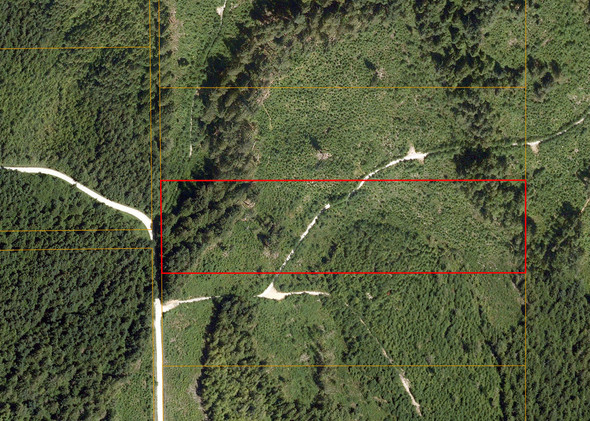 The land is primarily covered in younger forest growth, with the exception of a small creek corridor that runs through a corner of the property, adding a natural feature and variation to the terrain.
