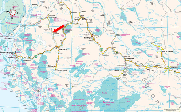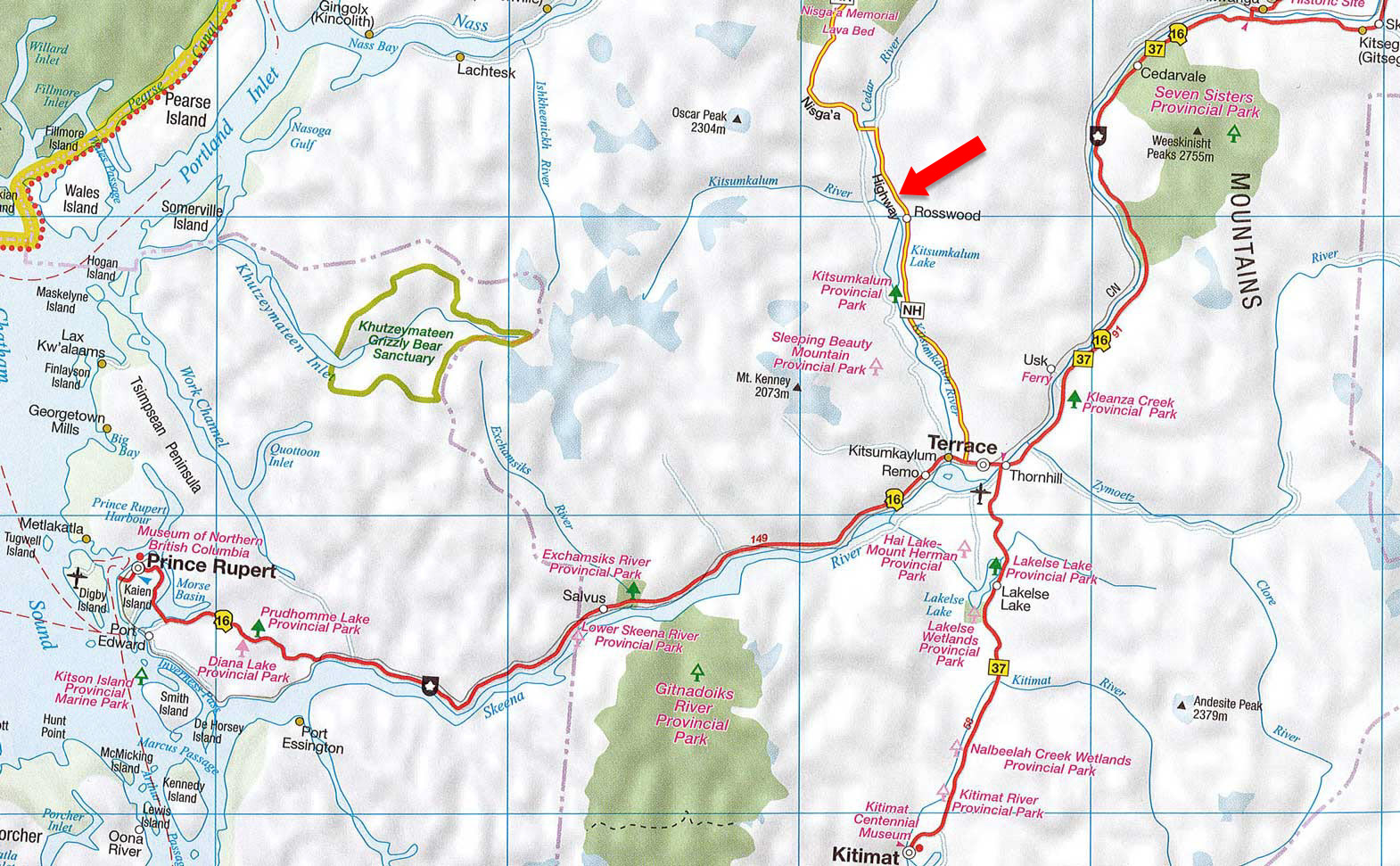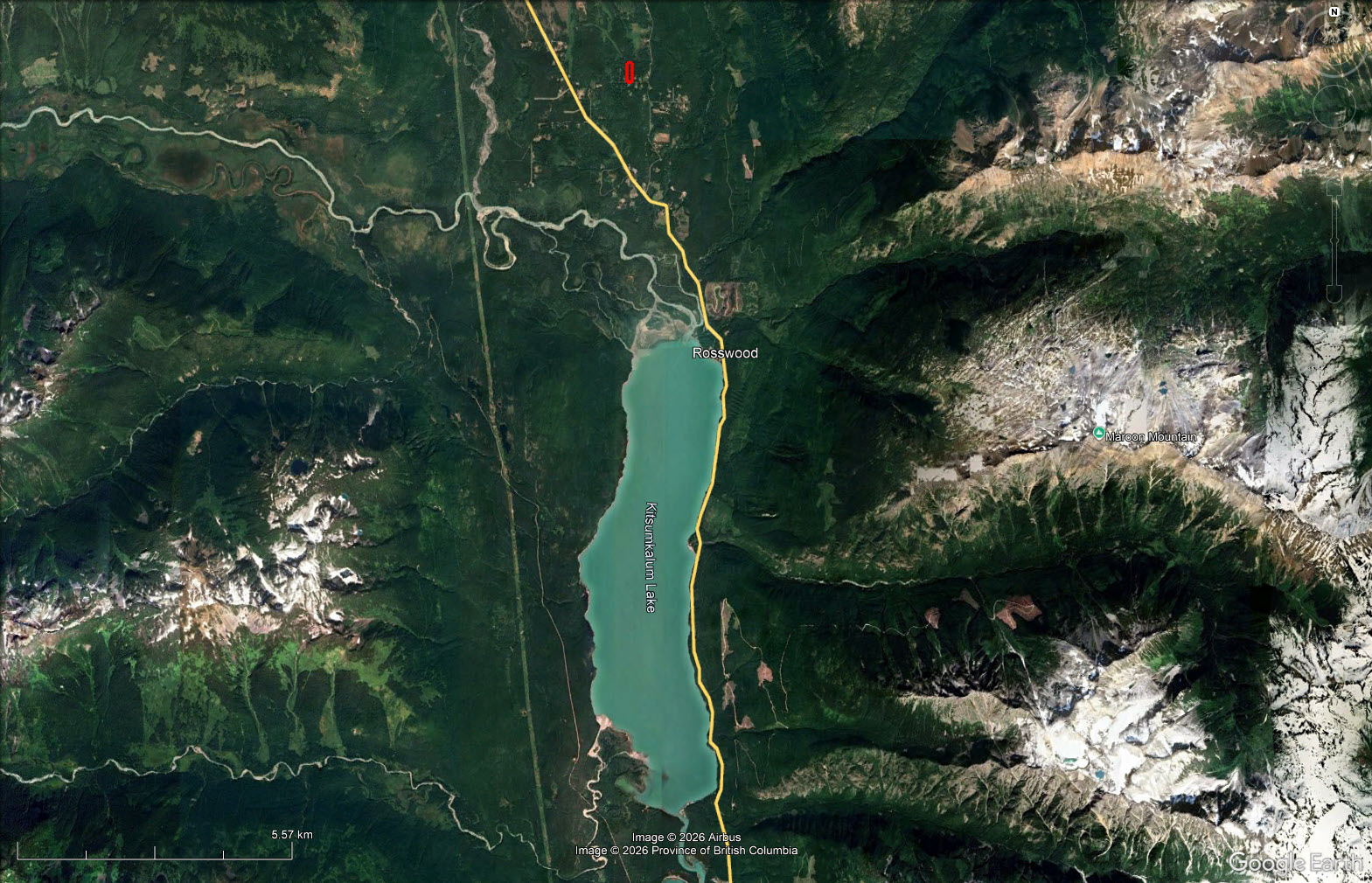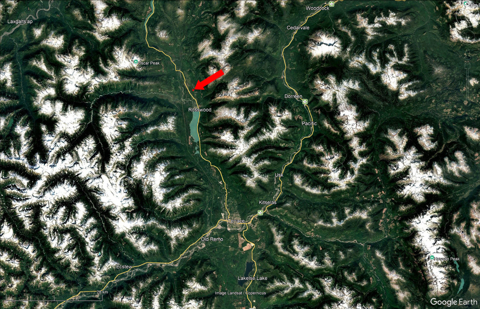 Once in Terrace, head north out of town on Highway 113, also known as Kalum Lake Road or the Nisga’a Highway. Follow this scenic route along the eastern shoreline of Kalum Lake for approximately 35-40 minutes until you reach the community of Rosswood near the lake’s northern end. Turn right onto Egan Road following it for a few minutes then take a left onto Brousseau Road and continue for several hundred yards to arrive at the property.