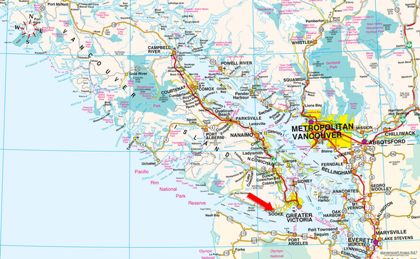 Sooke is located on the southwest coast of Vancouver Island, 50 km from the provincial capital city of Victoria. The Sooke region encompasses the District of Sooke and East Sooke, two communities joined around the sheltered Sooke Harbour and Basin, as well as the outlaying areas of Otter Point and Shirley further west.