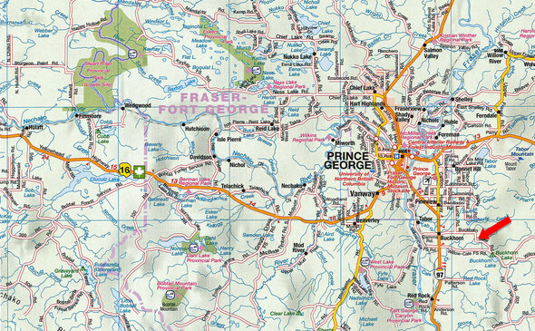 From Vancouver, drive east on Highway 1 or north via Highway 5 and continue to connect with Highway 97 northbound, following it through the Interior and Cariboo region toward Prince George. The drive is approximately 784 km and takes about 8 hours 40 minutes under typical conditions.