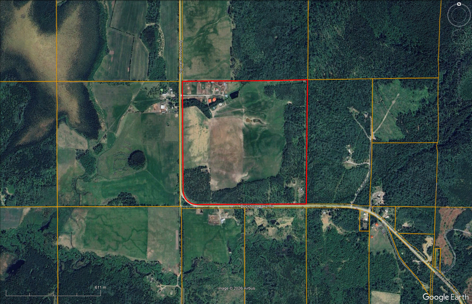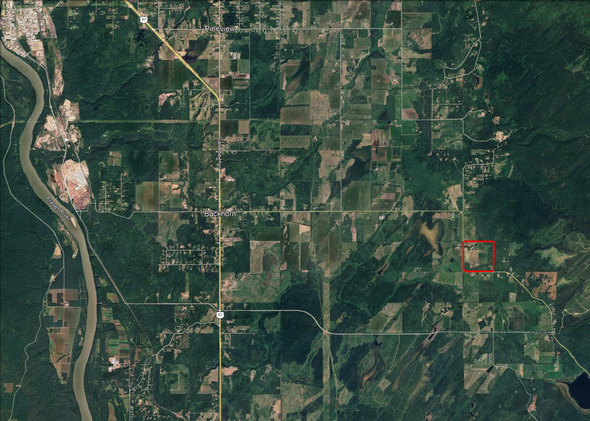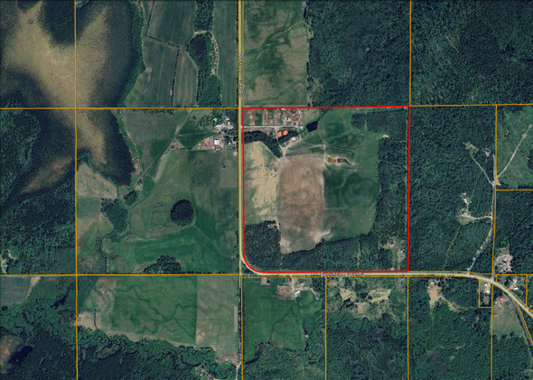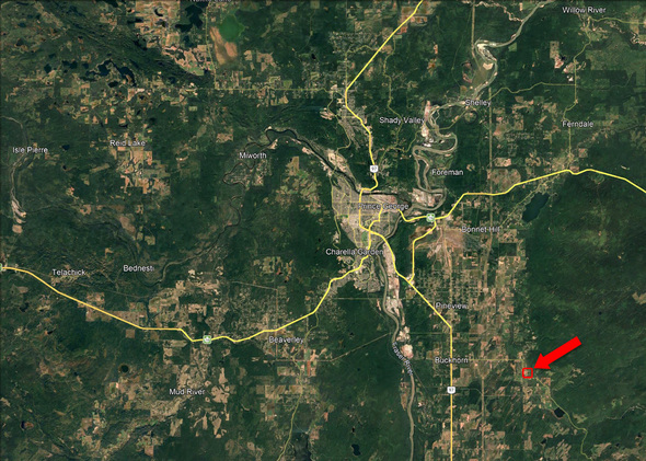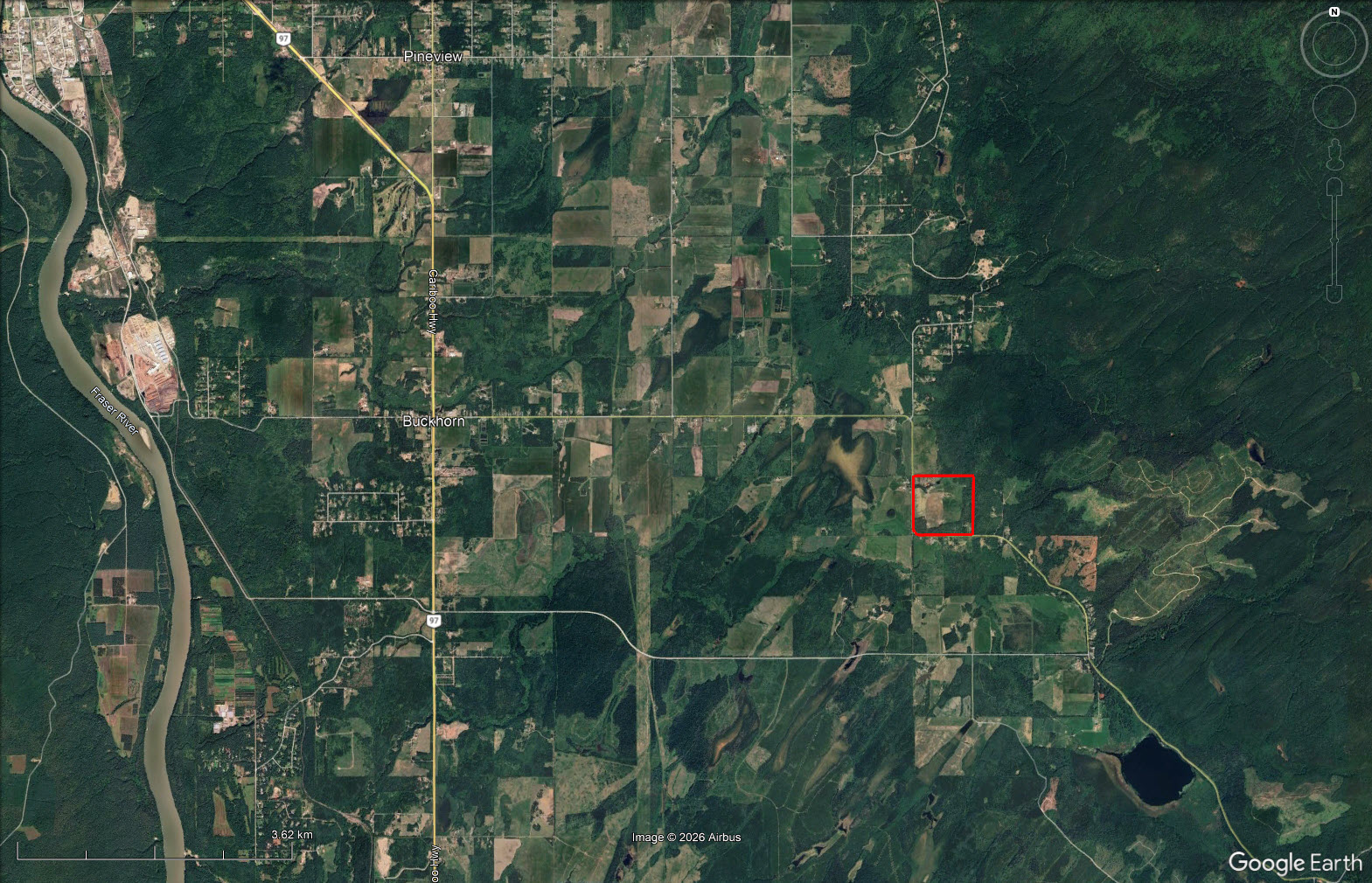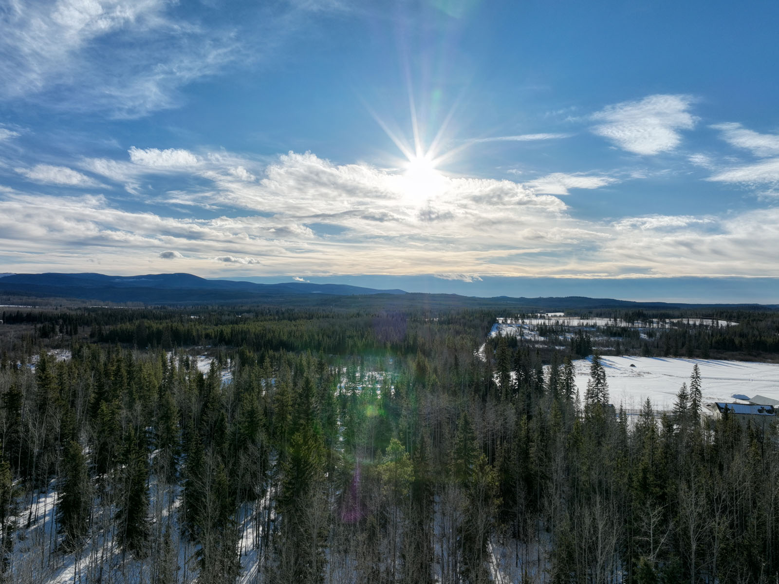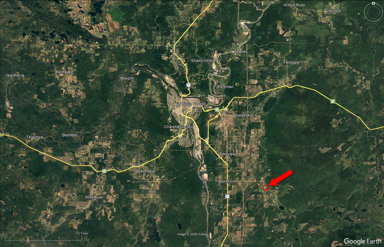 The area surrounding the property is in a rural setting southeast of Prince George, characterized by open countryside, forested Crown land, and agricultural properties. The landscape reflects glacially shaped terrain with low relief plains, stream valleys, and mixed soils supporting spruce, fir, pine, and other boreal forest vegetation, along with warm summers, cold winters, and a short frost-free growing season typical of central British Columbia.