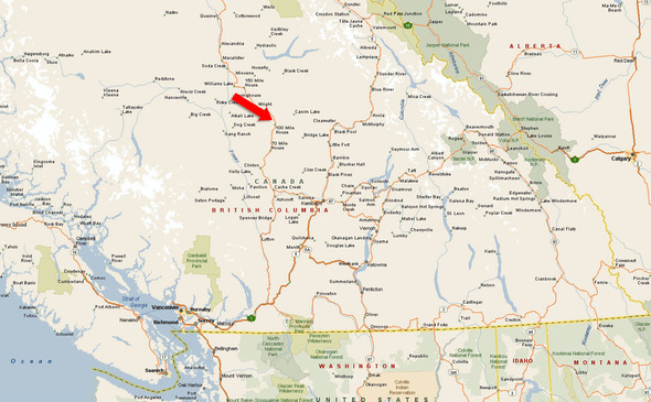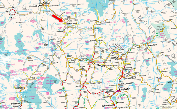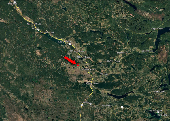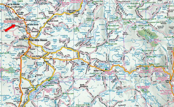 Coming from the south (Clinton, Cache Creek, or Kamloops), take Highway 97 North toward 100 Mile House. Drive through 100 Mile House, continuing past the turnoffs for 101 Mile and 103 Mile. After about 10 minutes (roughly 12 km from 100 Mile House), watch for signs for Lily Pad Lake Road on your left—it branches west off Highway 97 between 103 Mile and 108 Mile Ranch.