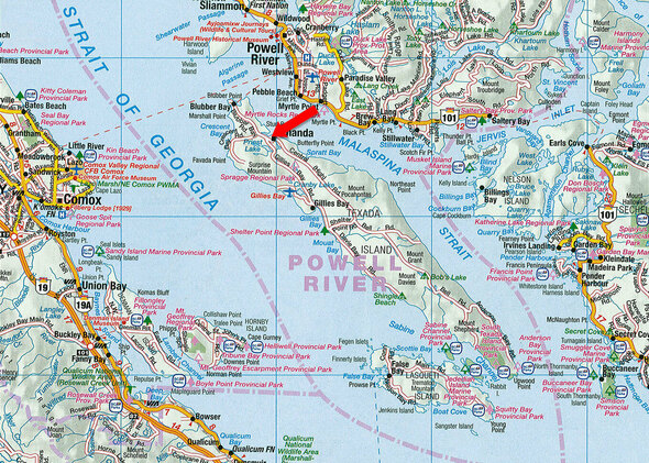 Boat launch facilities are located at Shelter Point Park and Sturt Bay Boat Harbour. There is a government dock with a tie-up float in Van Anda, close to the Texada Farmers Market.