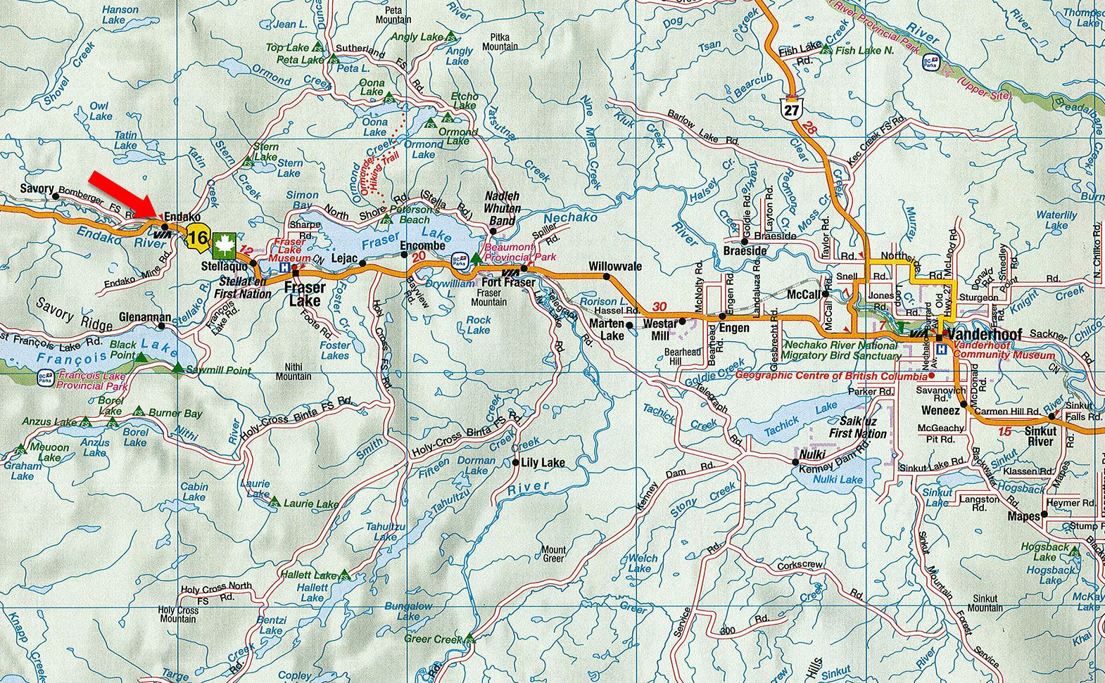 The drive from Vancouver to Endako, BC is about 900 km and takes 10-11 hours. You’ll head east on Highway 1 through the Fraser Valley and Fraser Canyon to Cache Creek, then continue north on Highway 97 through the Cariboo region, passing 100 Mile House, Williams Lake, and Quesnel. From Prince George, take Highway 16 west through Vanderhoof and Fort Fraser until you reach Endako, just east of Fraser Lake.