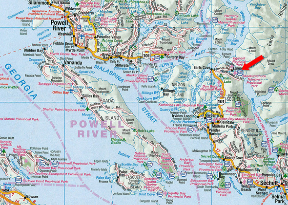 Jervis Inlet, just north of Earls Cove, leads inland from Malaspina Strait to a number of sounds and inlets, including Hotham Sound, Agamemnon Channel, Sechelt Inlet, Prince of Wales Reach, Princess Royal Reach and into Queens Reach. Leading off Queens Reach is Princess Louisa Inlet, at the head of which is Princess Louisa Provincial Park and the stunning Chatterbox Falls. Trips to the falls are available out of nearby Egmont.