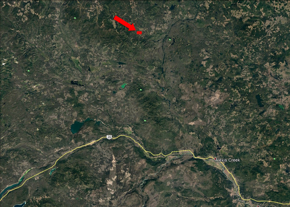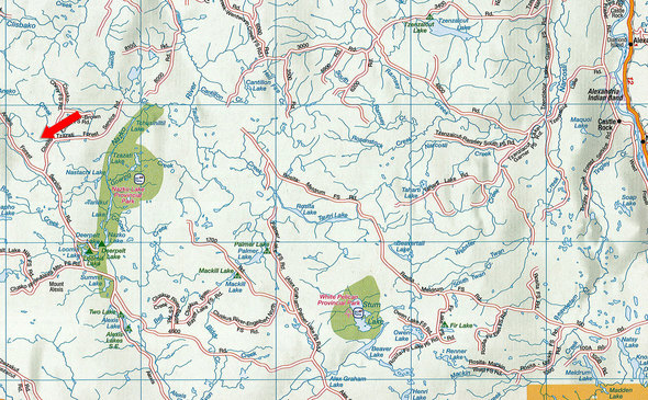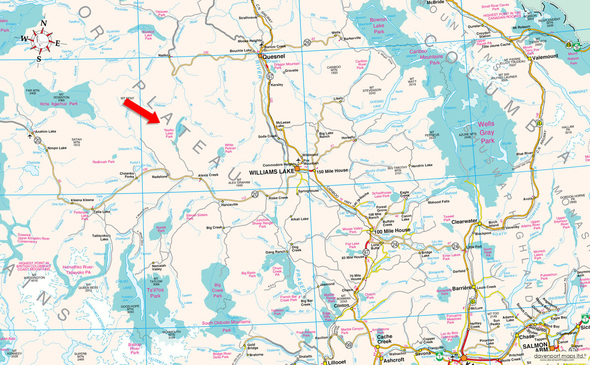 West of Williams Lake about 150 kilometres on Highway 20 and then 73 kilometres north on a maintained gravel road that leads to the Chezacut area.