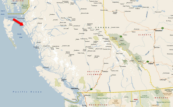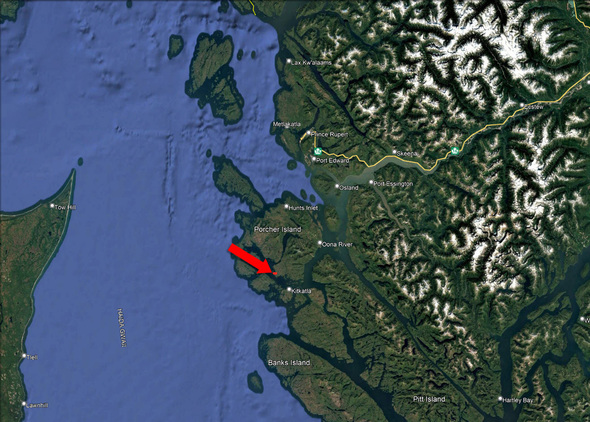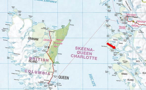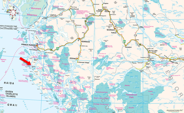 Drive south of Prince Rupert, 16 km to the small village of Port Edward; put the boat in the water and head south down Inverness Passage, into Telegraph Passage, heading south to the Ogden Channel and then to Kitkatla Channel, due west to the property.
