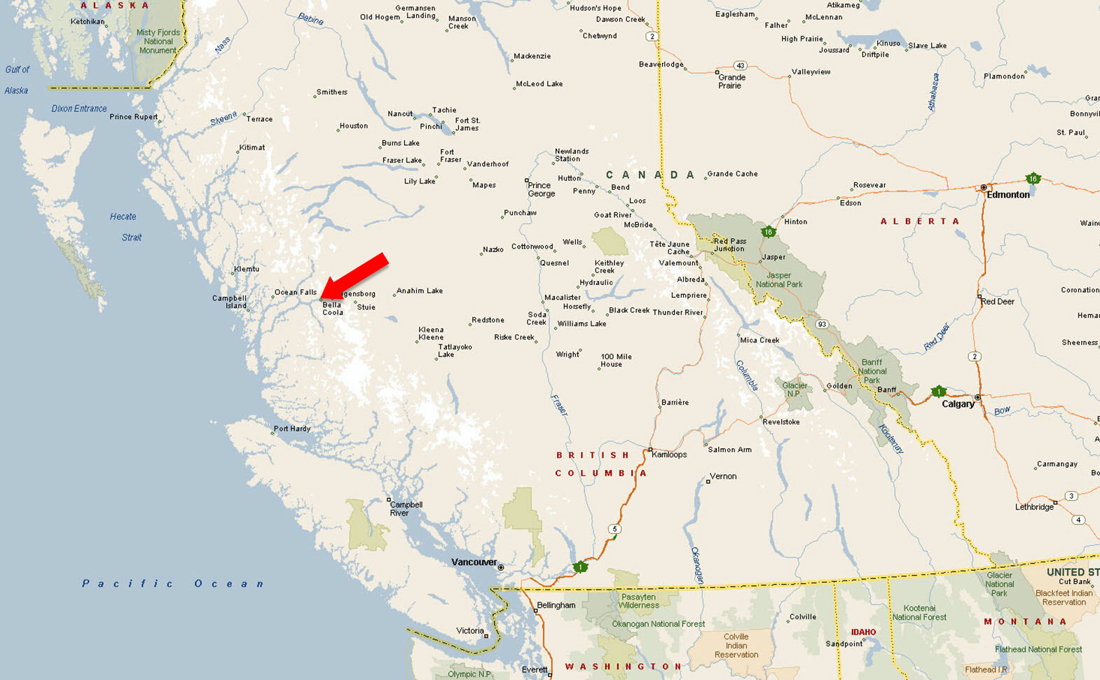 Continue west following the Bella Coola and Atnarko Rivers through Hagensborg. Approximately 20 km past Hagensborg, you will arrive in Bella Coola. 440 Mackenzie Street will be on your right-hand side.