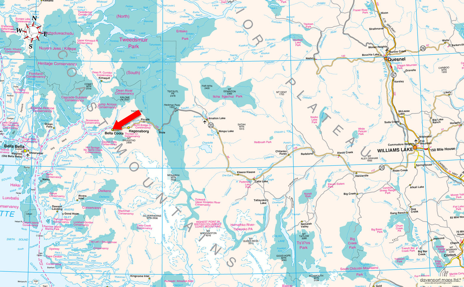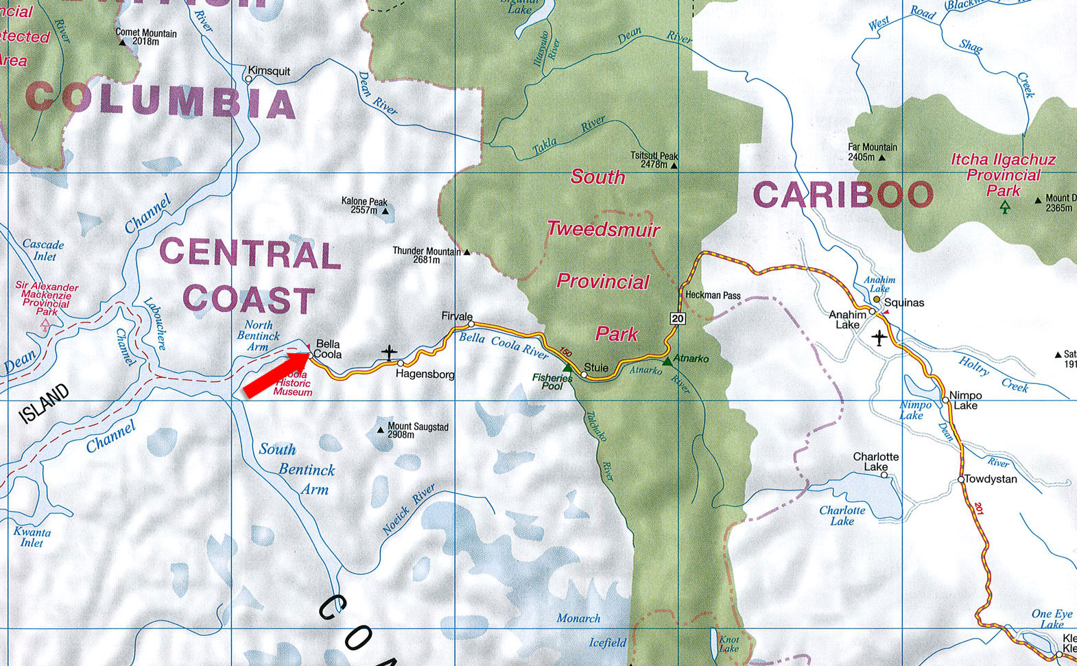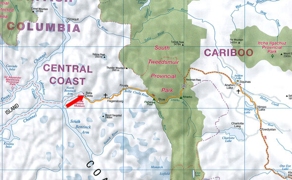 From Williams Lake, travel west on Highway 20 for approximately 477 km. This scenic route crosses the Chilcotin Plateau, passes through Tweedsmuir Provincial Park, and descends the renowned “Hill,” dropping roughly 1,400 metres into the Bella Coola Valley.