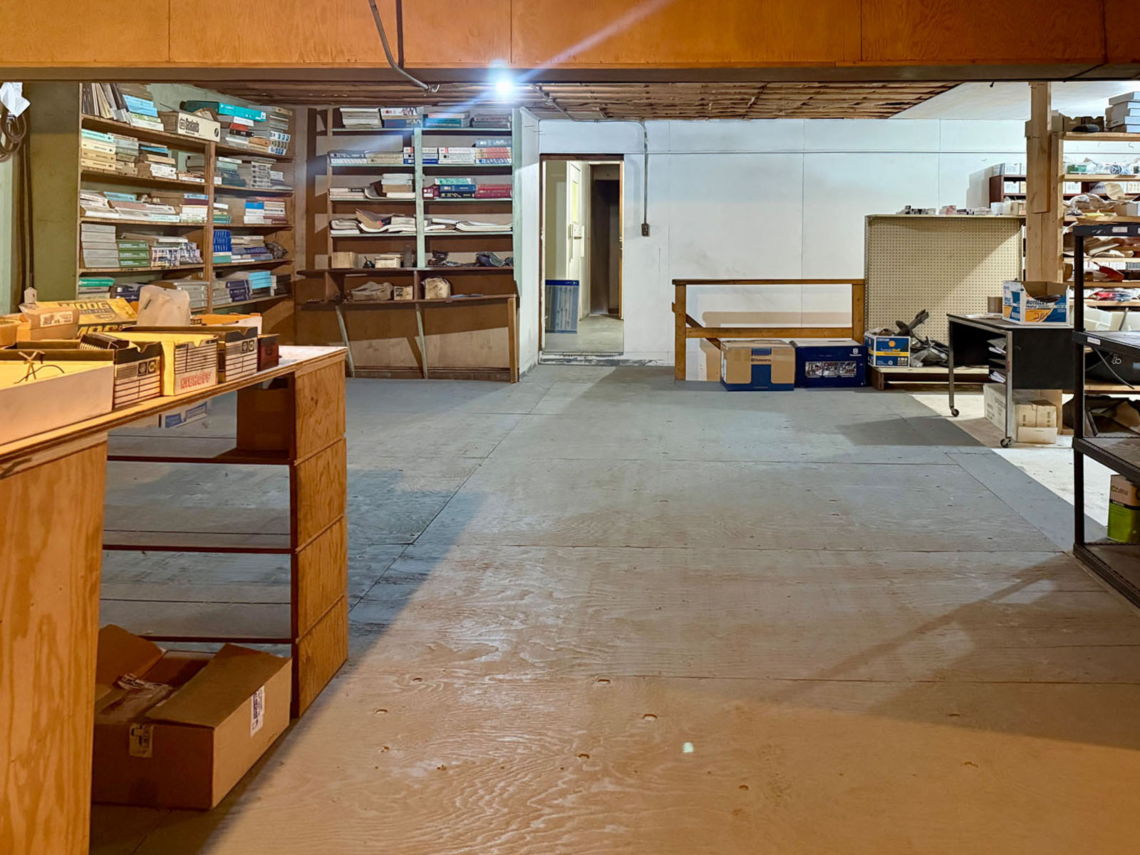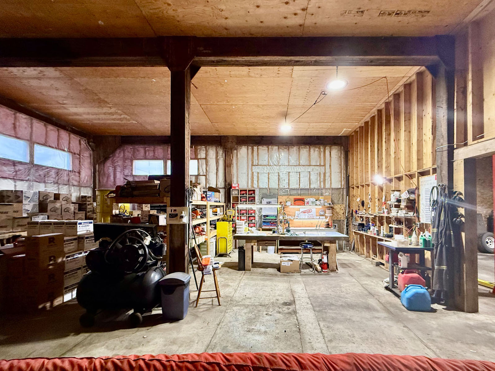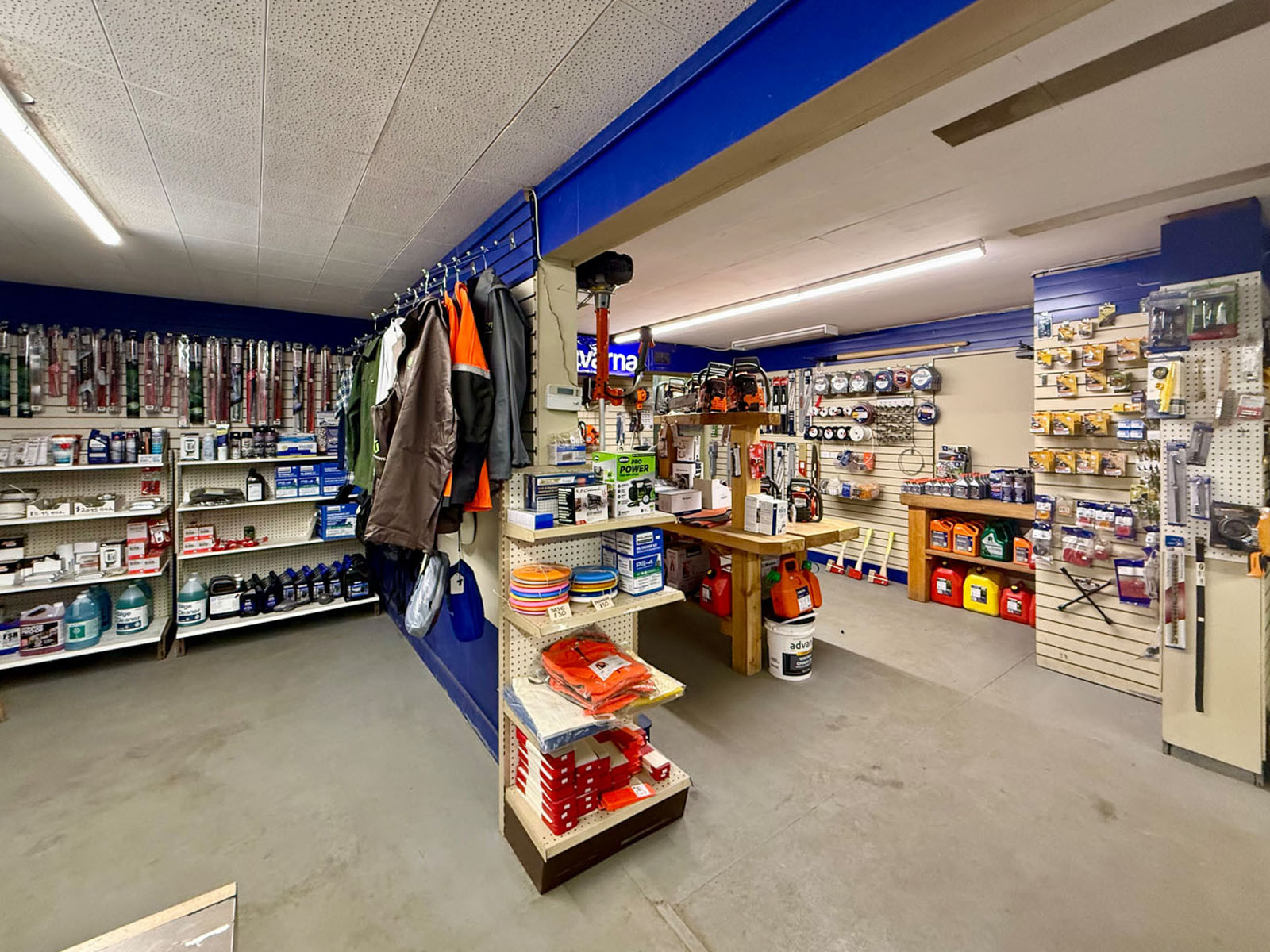 The front of the building houses a well-appointed retail store and office, offering a Husqvarna dealership, marine and boat supplies, oil sales, cleaning products, and related items. There is also leased office space with a private entrance, currently generating $950/month.