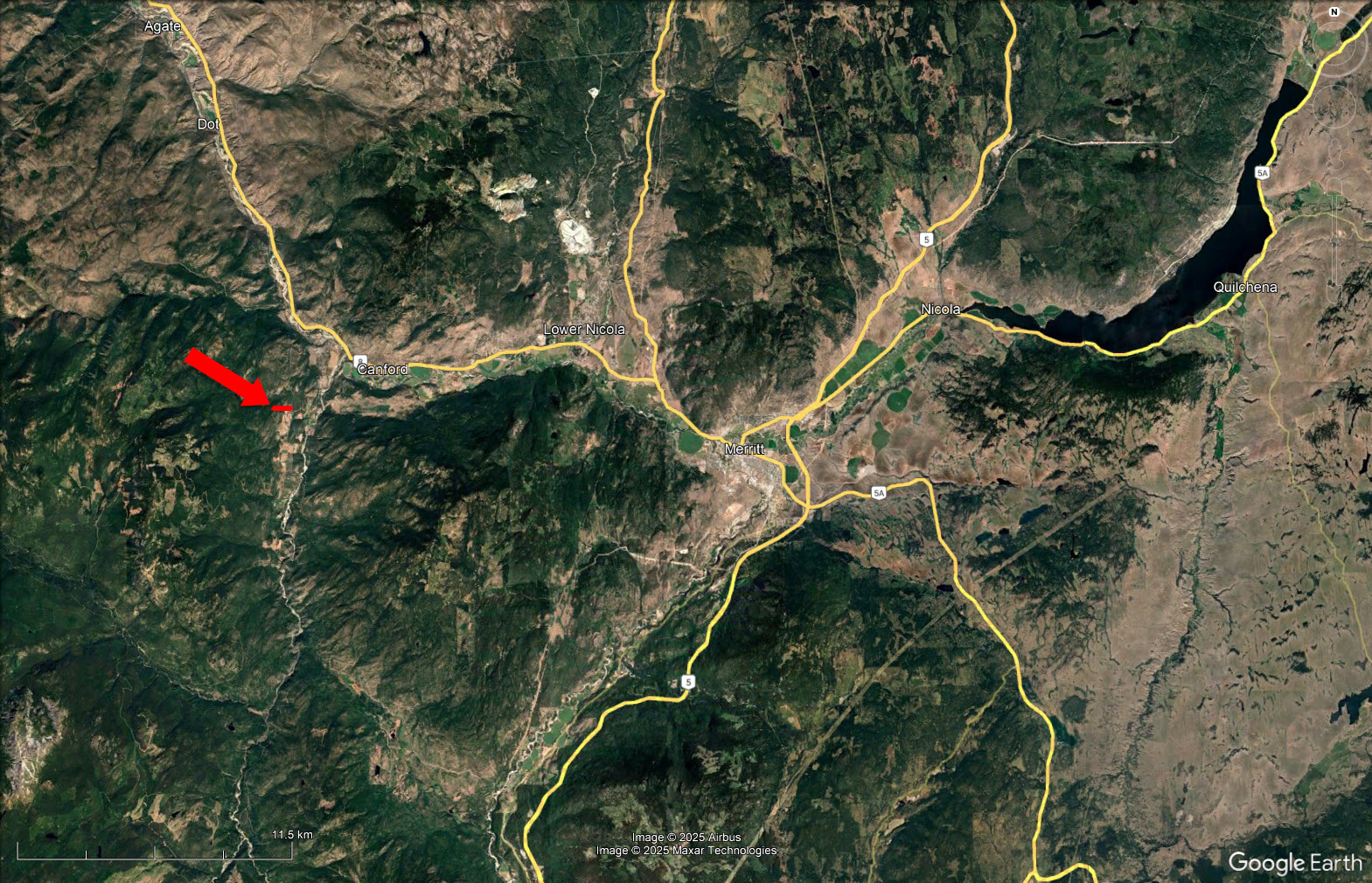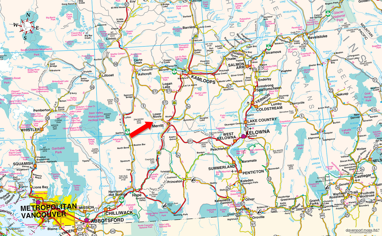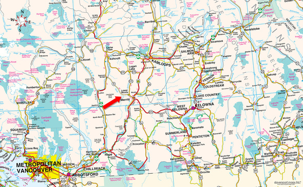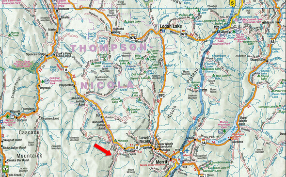 Go west from Merritt on Highway 8 for 18 km, turn left onto Sunshine Valley Road, 1.3 km, then continue onto Spius Creek Road for 900 m. Keep right onto Prospect Creek Road 600 m, turn left onto Petit Creek Road 2.1 km, turn right onto D’Easum Road.
