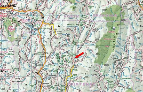Westbridge sits at a point on Highway 33 where a bridge crosses the West Kettle River. On the north side of the bridge, you’ll find the junction to Christian Valley Road, which leads to Christian Valley.