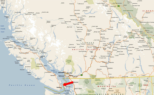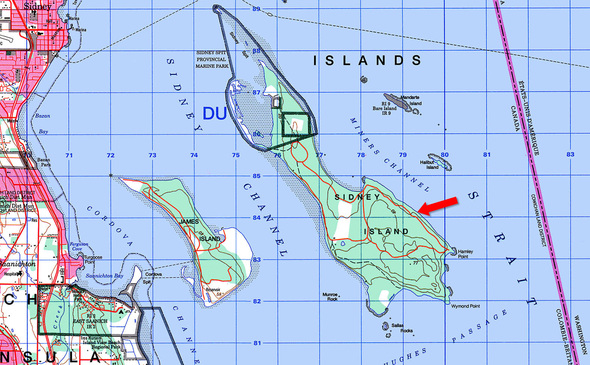 Sidney Island is at the southern end of the Gulf Islands between Vancouver Island and mainland British Columbia. It is about 19 km north of Victoria, 6 km southeast of Sidney on the Saanich Peninsula and 10 km from Roche Harbour on US San Juan Island.