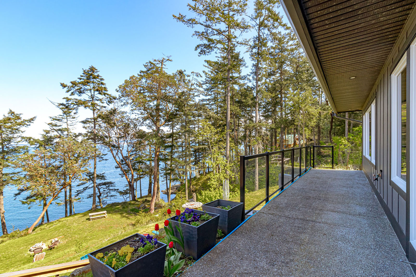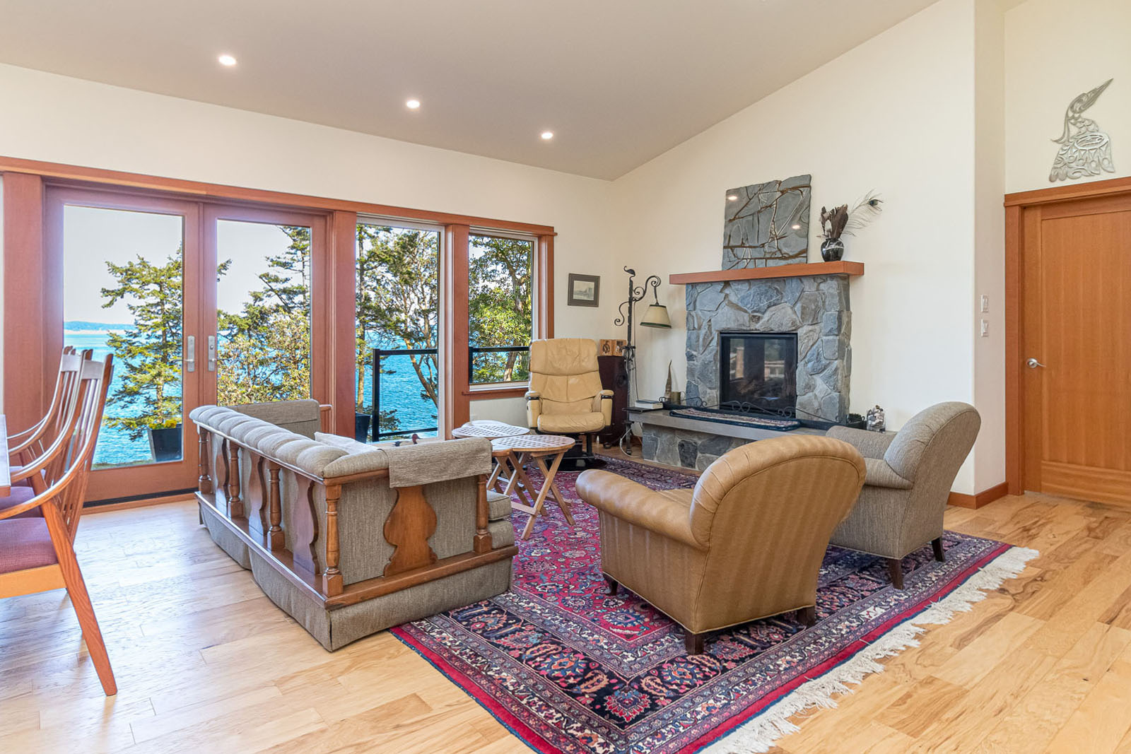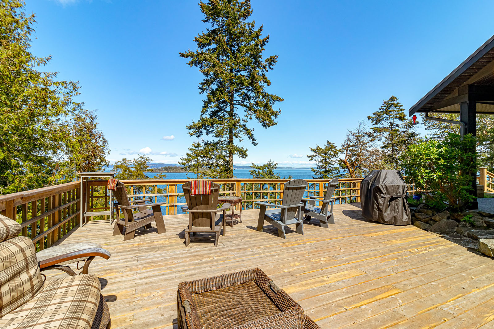 The expansive deck with a propane fireplace invites outdoor living, surrounded by flowers in summer, in Canada’s most temperate climate. The waterfront is easily accessible by a short ladder to launch kayaks and enjoy the beach area at low tide.