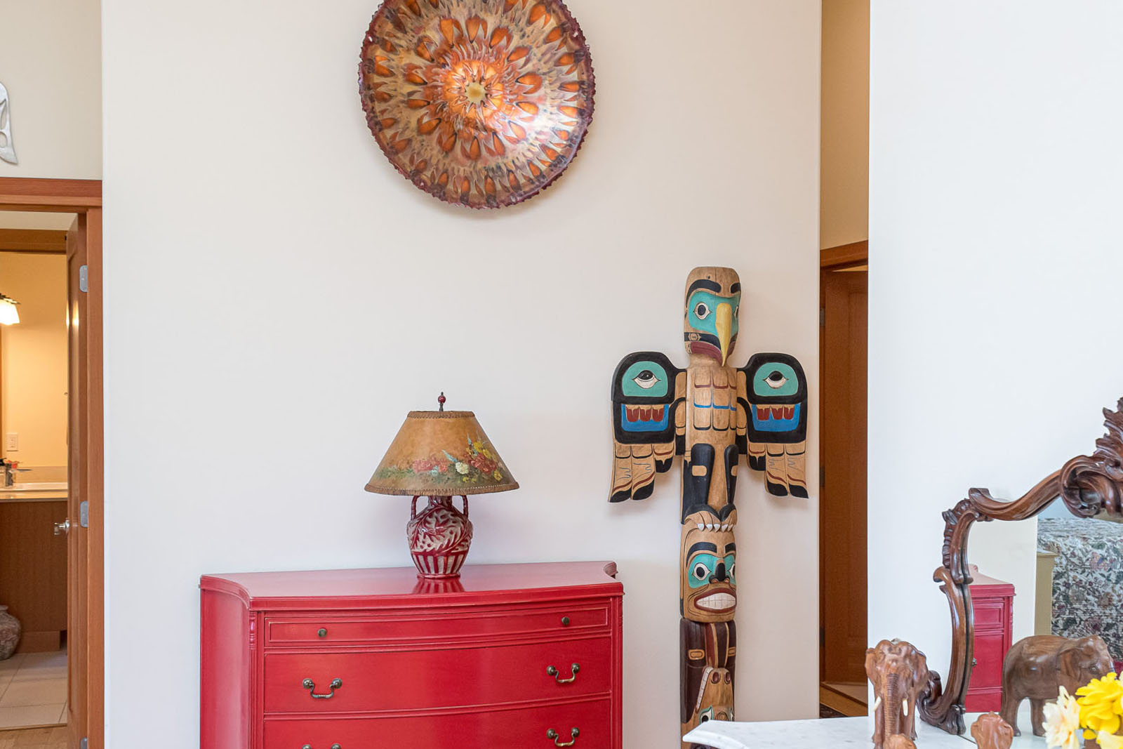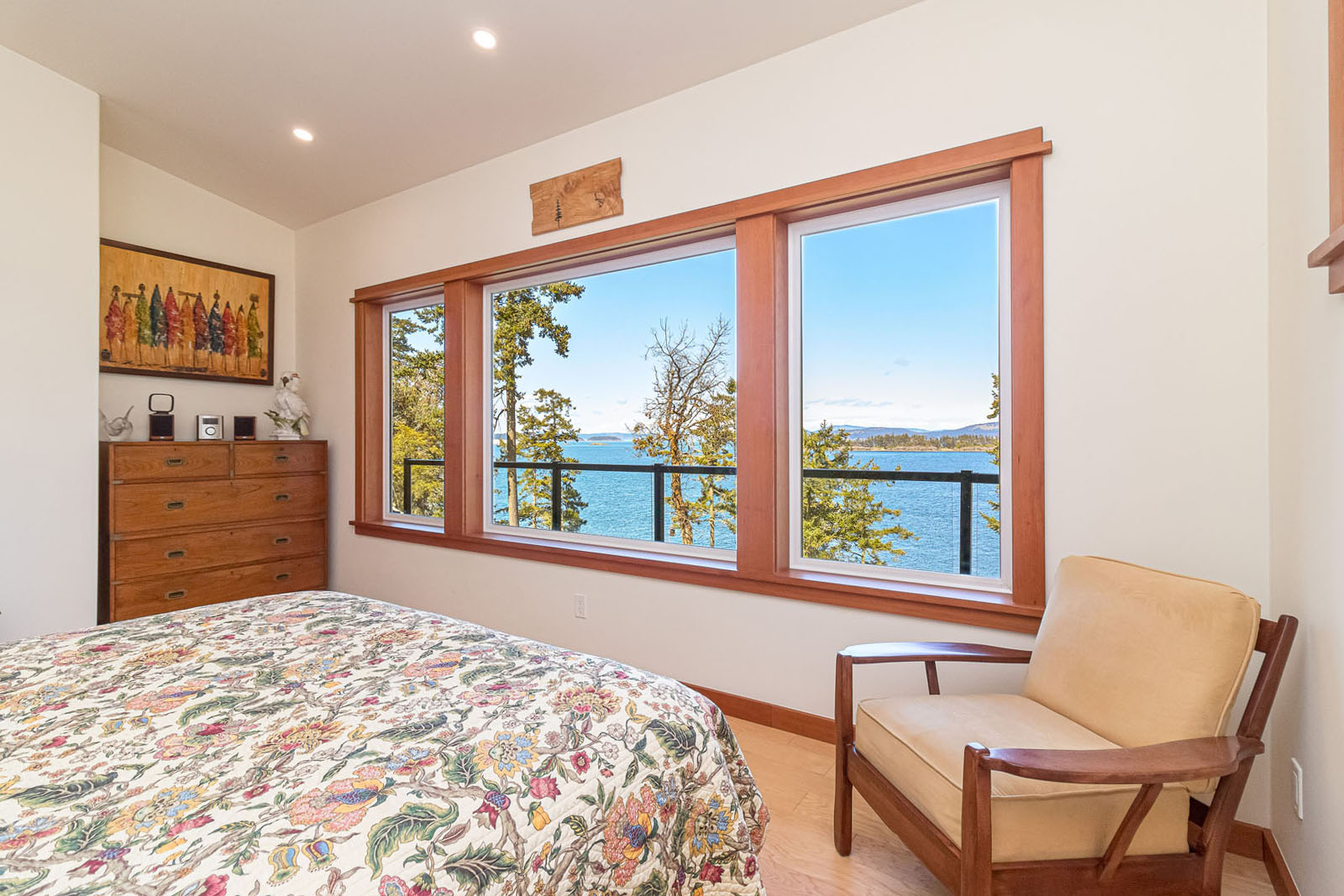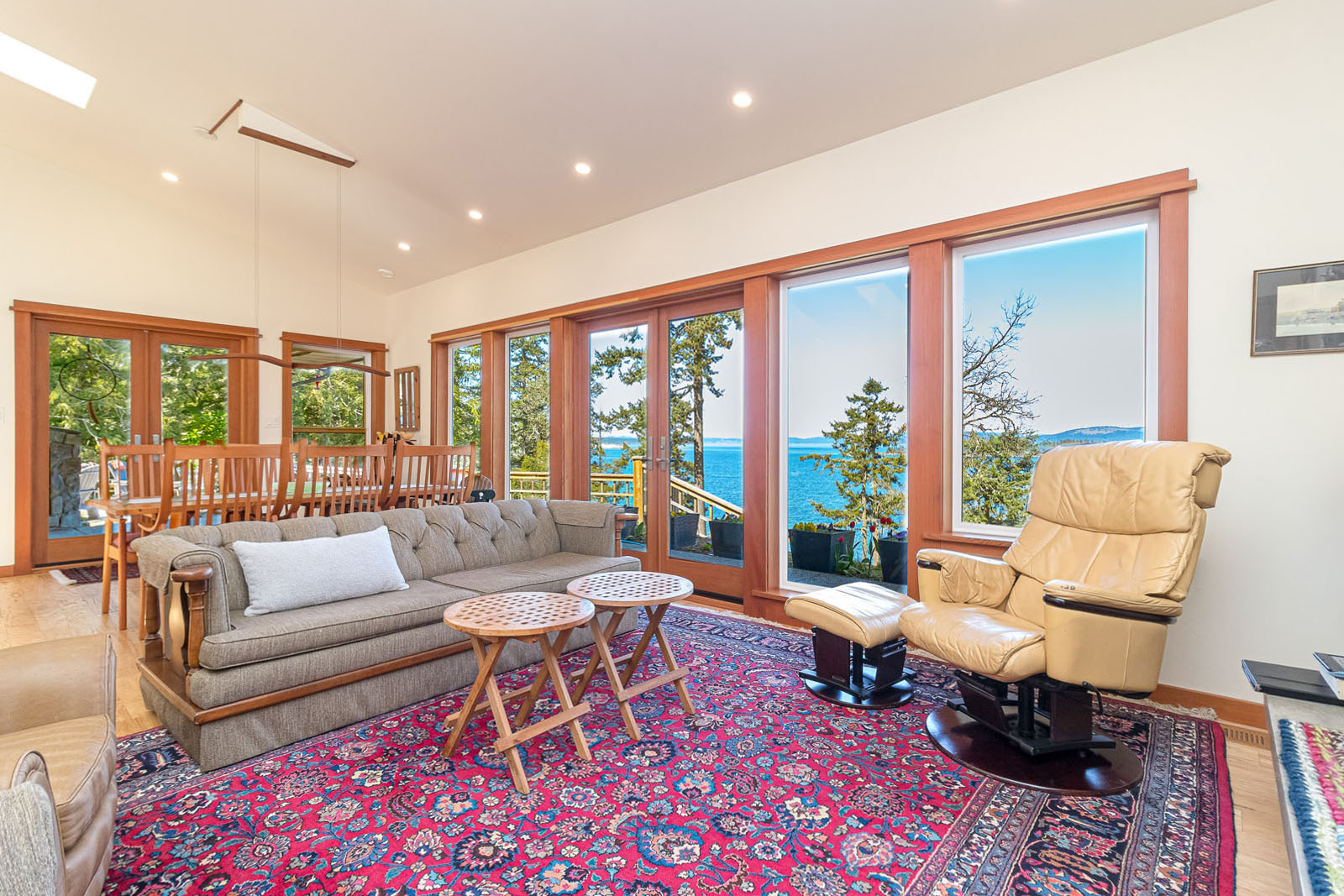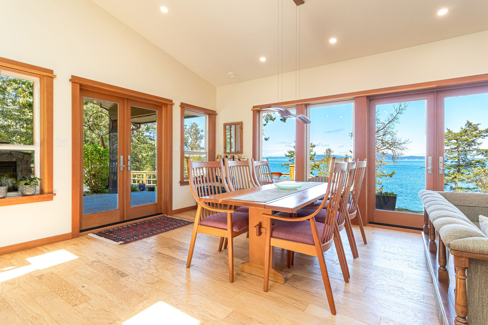 The expansive deck with a propane fireplace invites outdoor living, surrounded by flowers in summer, in Canada’s most temperate climate. The waterfront is easily accessible by a short ladder to launch kayaks and enjoy the beach area at low tide.