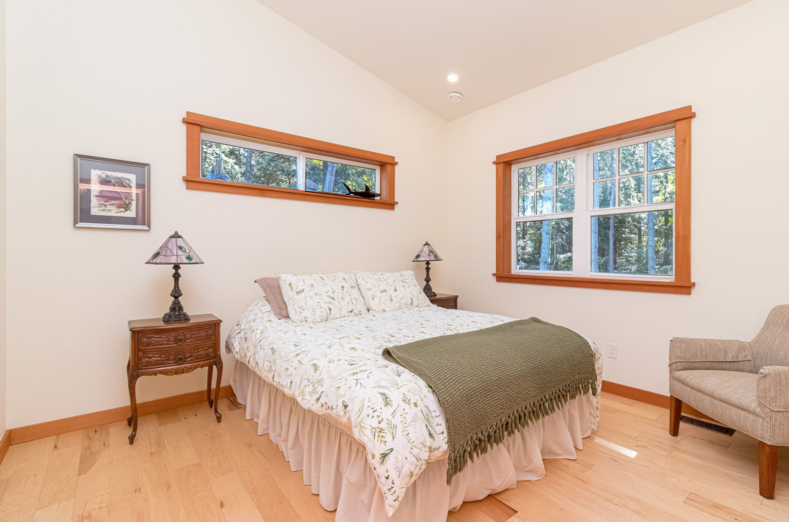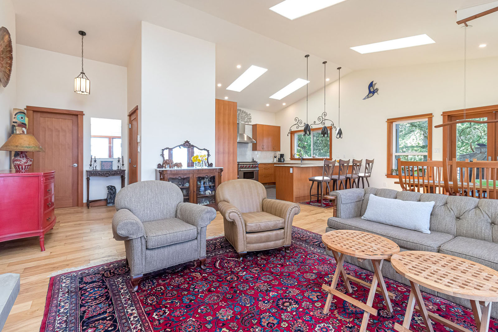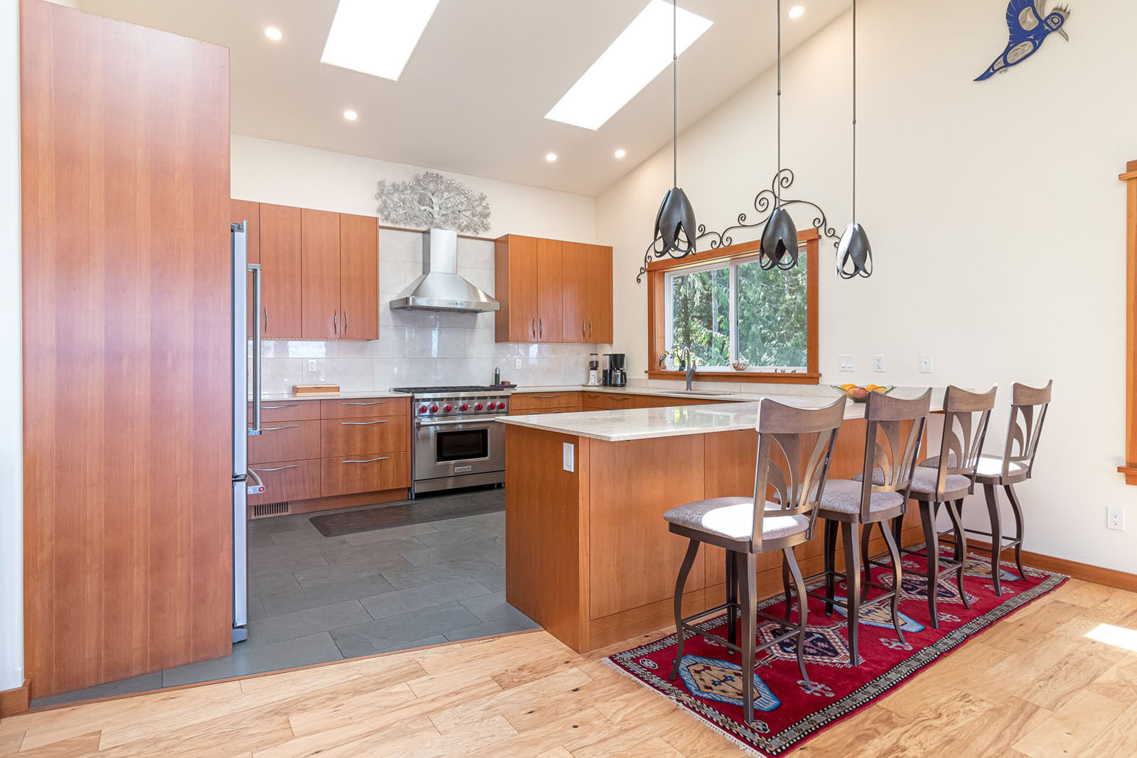The owners have lived full time in the 1,536 sq. ft. 3-bedroom, 2-bathroom home, since their build was complete in 2018. The open, light-filled layout features five skylights, fir accents and hickory hardwood floors. The gourmet kitchen with a 6-burner Wolf range, marble countertops, and stainless-steel appliances is a blend of elegance and function. The thoughtfully designed layout creates a seamless transition between living areas providing comfort and versatility.