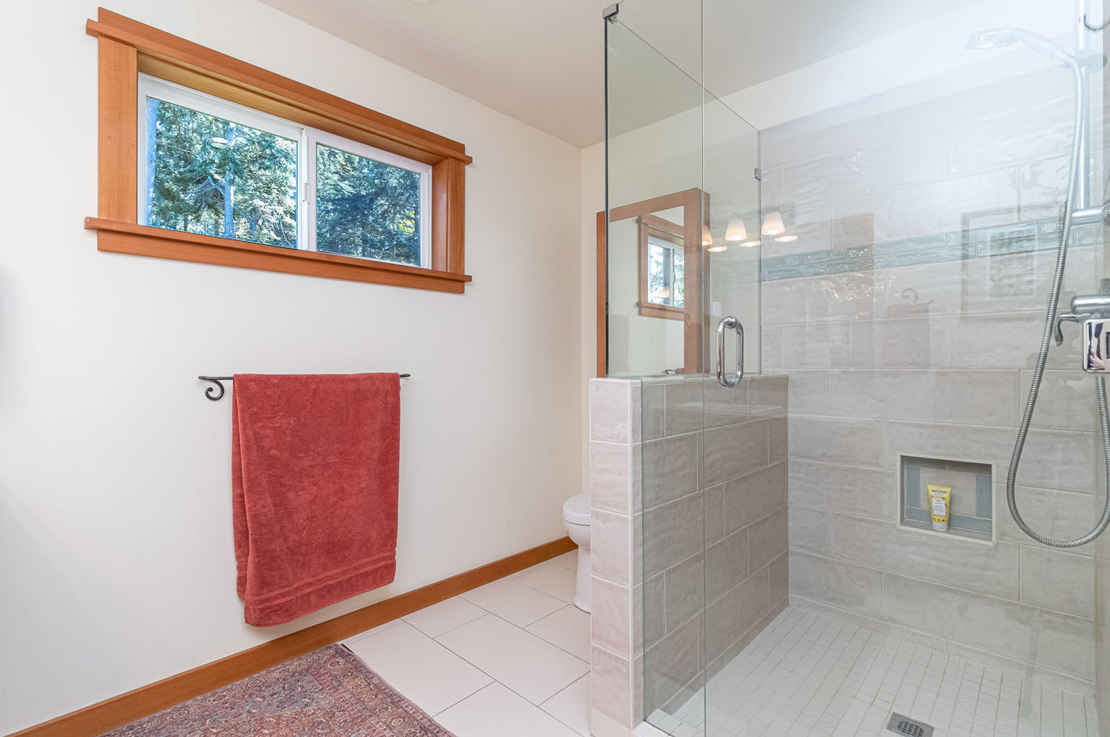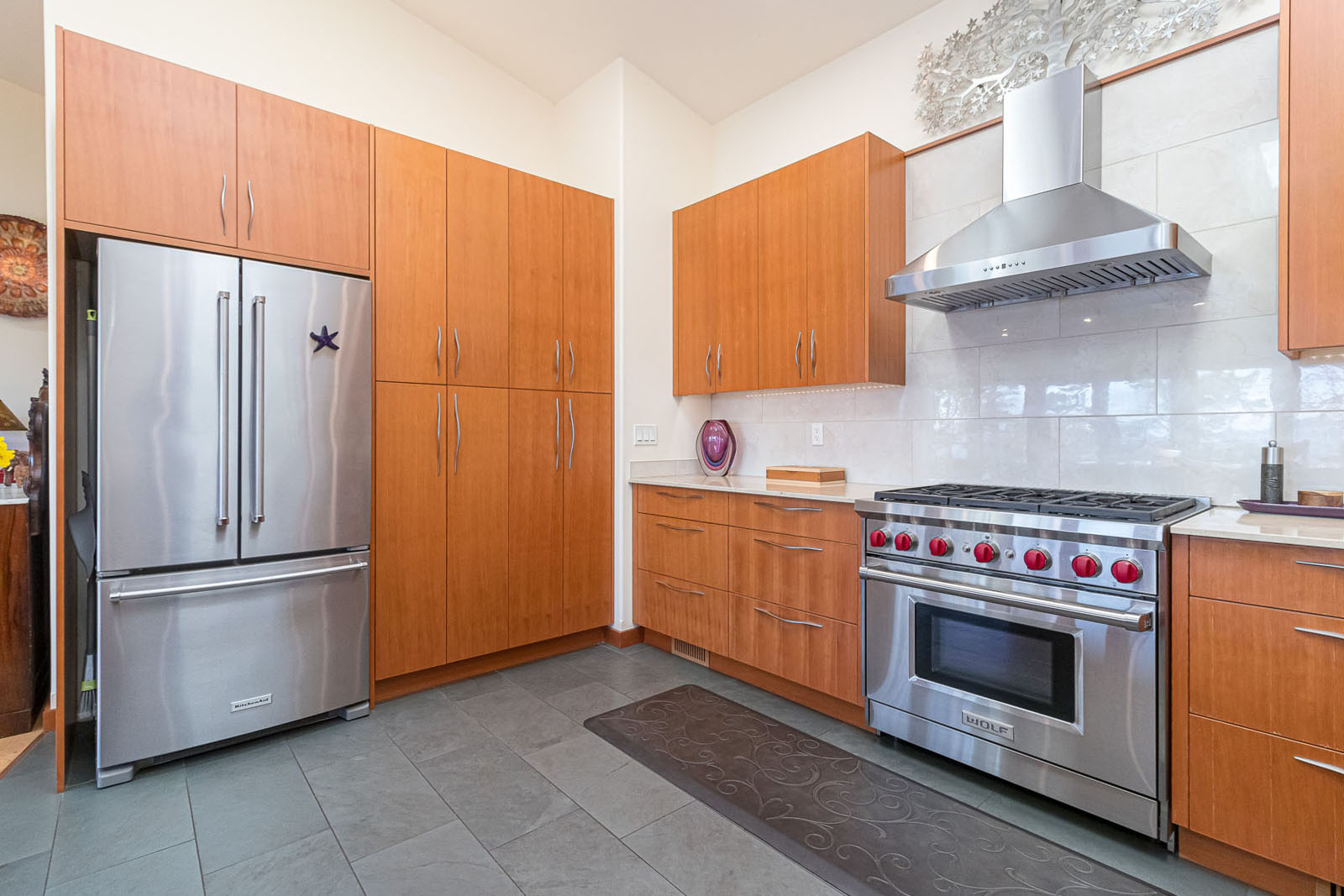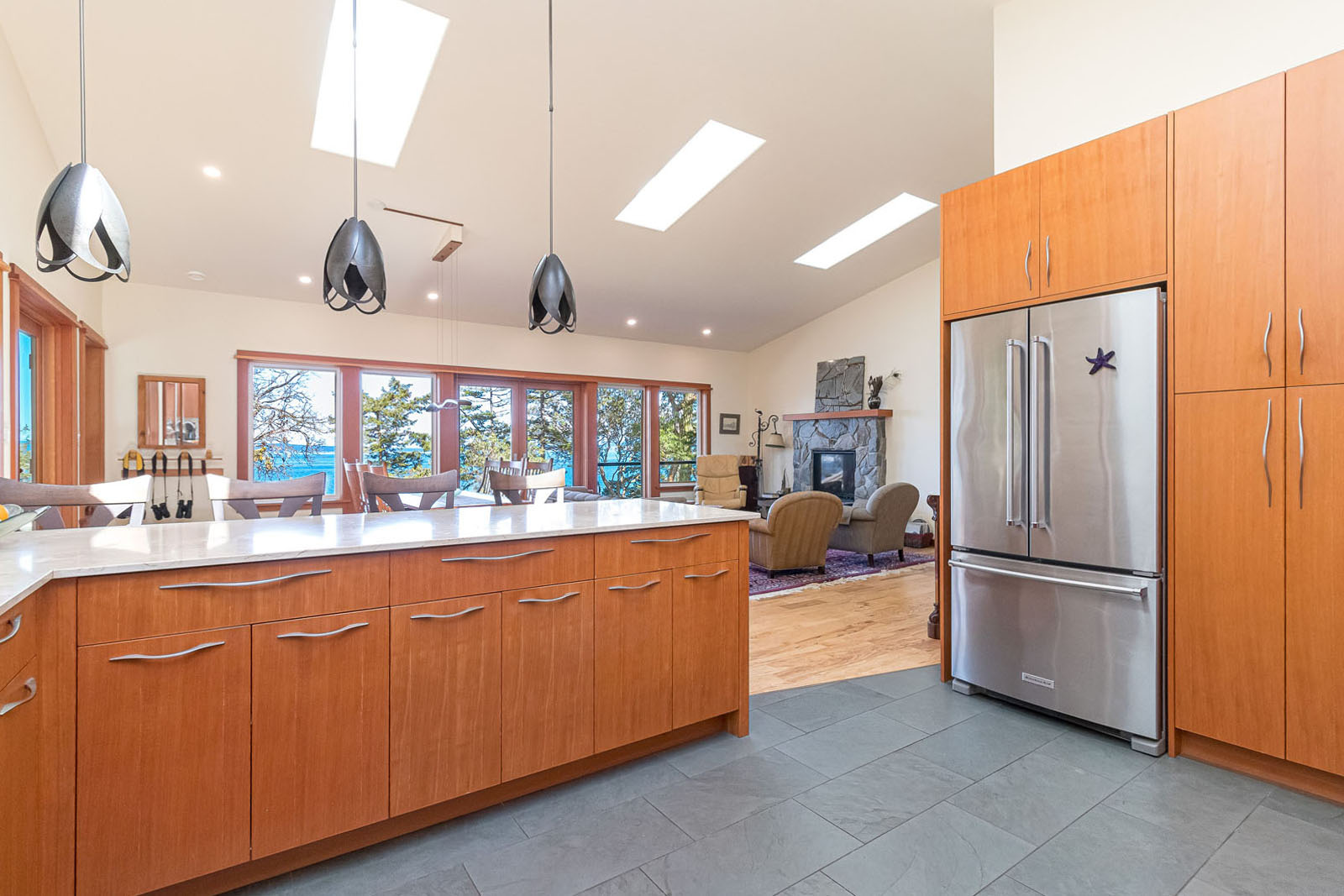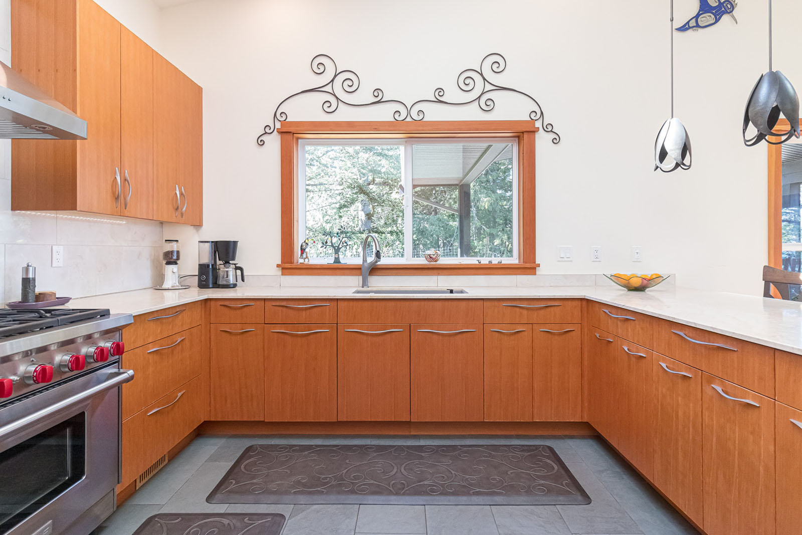 The owners have lived full time in the 1,536 sq. ft. 3-bedroom, 2-bathroom home, since their build was complete in 2018. The open, light-filled layout features five skylights, fir accents and hickory hardwood floors. The gourmet kitchen with a 6-burner Wolf range, marble countertops, and stainless-steel appliances is a blend of elegance and function. The thoughtfully designed layout creates a seamless transition between living areas providing comfort and versatility.