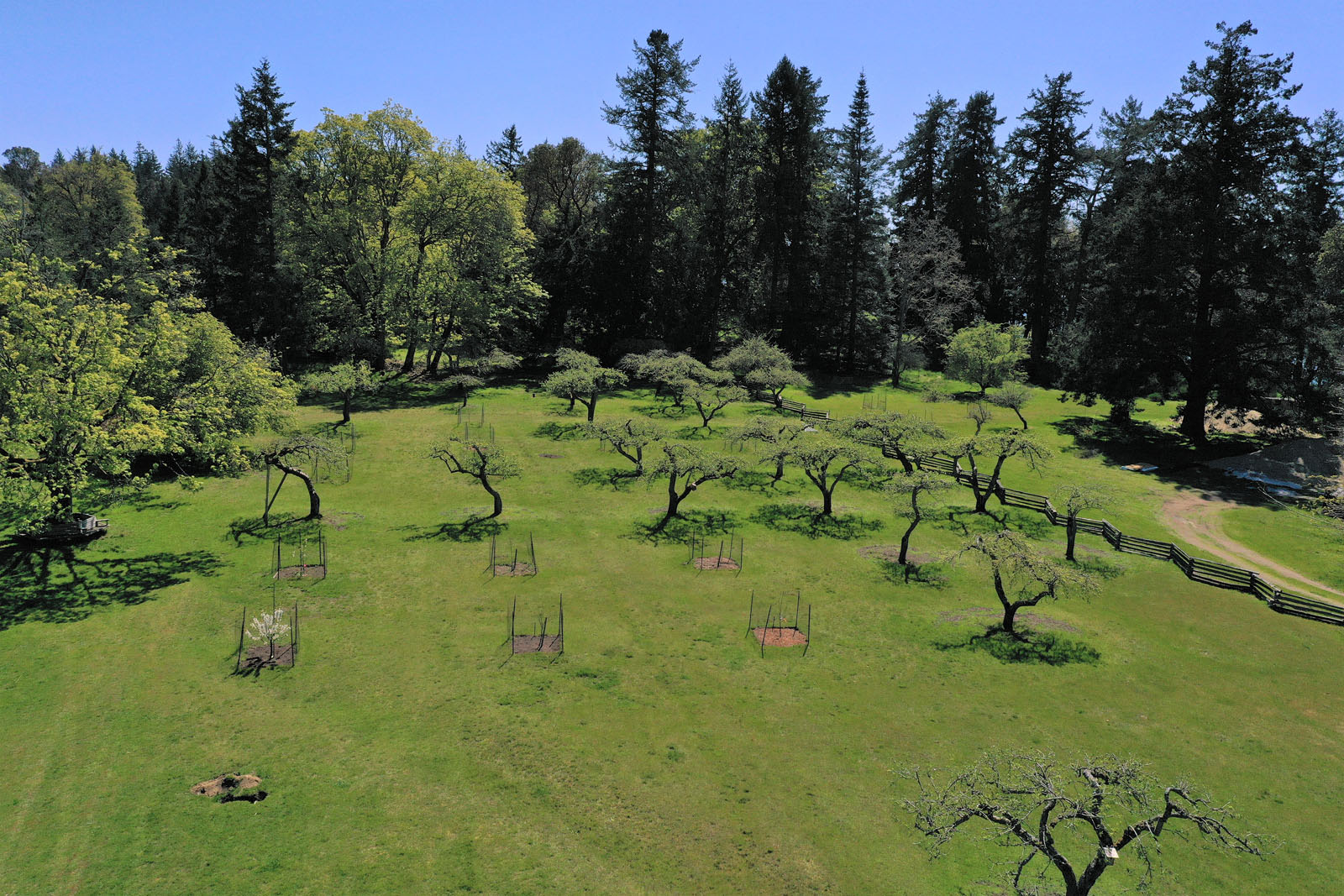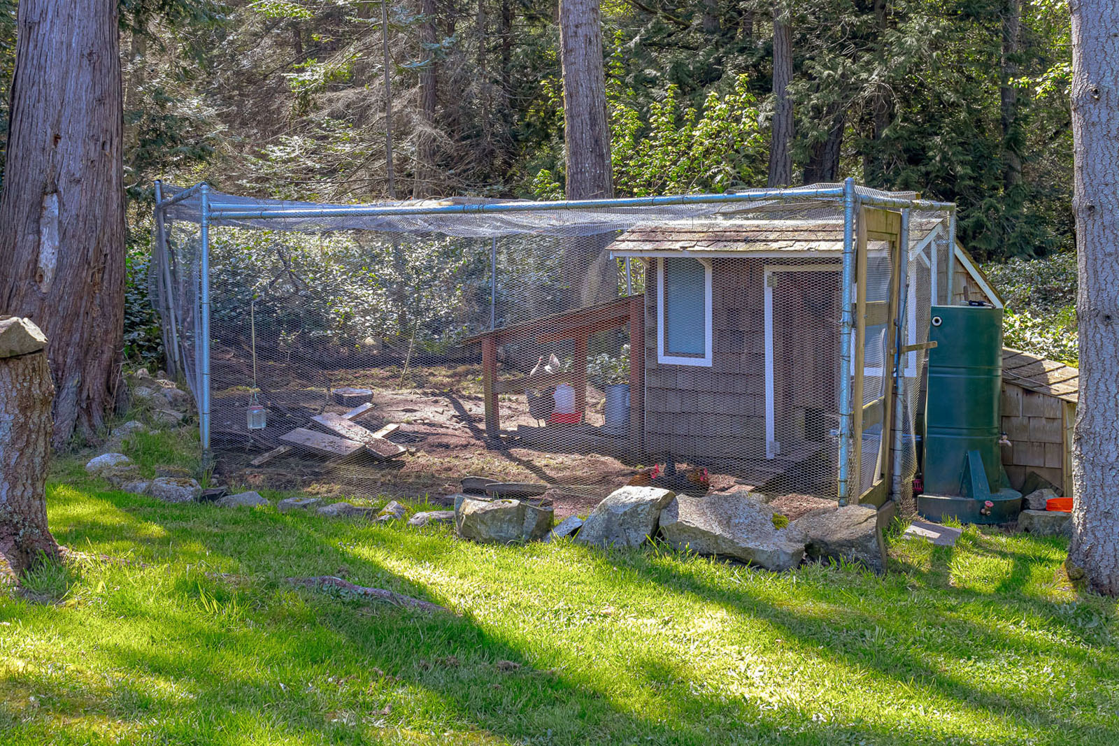 Additional features include a woodshed, chicken coop to provide fresh eggs, and gardens with raised hügelkultur beds for sustainable living.