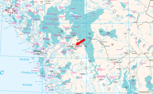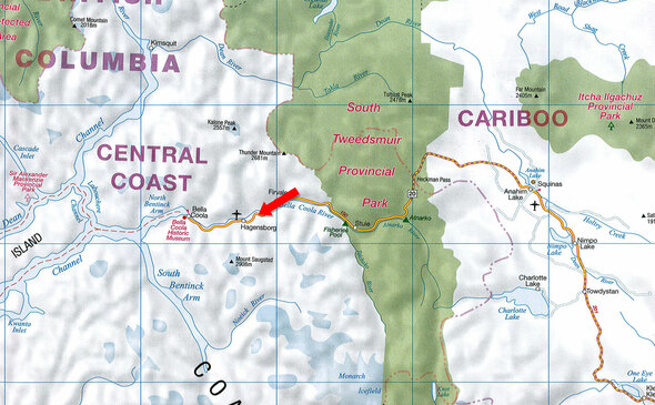 The Bella Coola community is remote in nature and contains a population of approximately 2,000 people. The primary geographical structure of the community, both in terms of physical structures and population distribution is the long, narrow valley. The Chilcotin Highway 20 stretches from the government wharf (on the Pacific Ocean), through the extent of the populated portion of the valley, through Hagensborg and Firvale before climbing to the Chilcotin Plateau. The entire population of the community lives on either side of this road or very near to it.