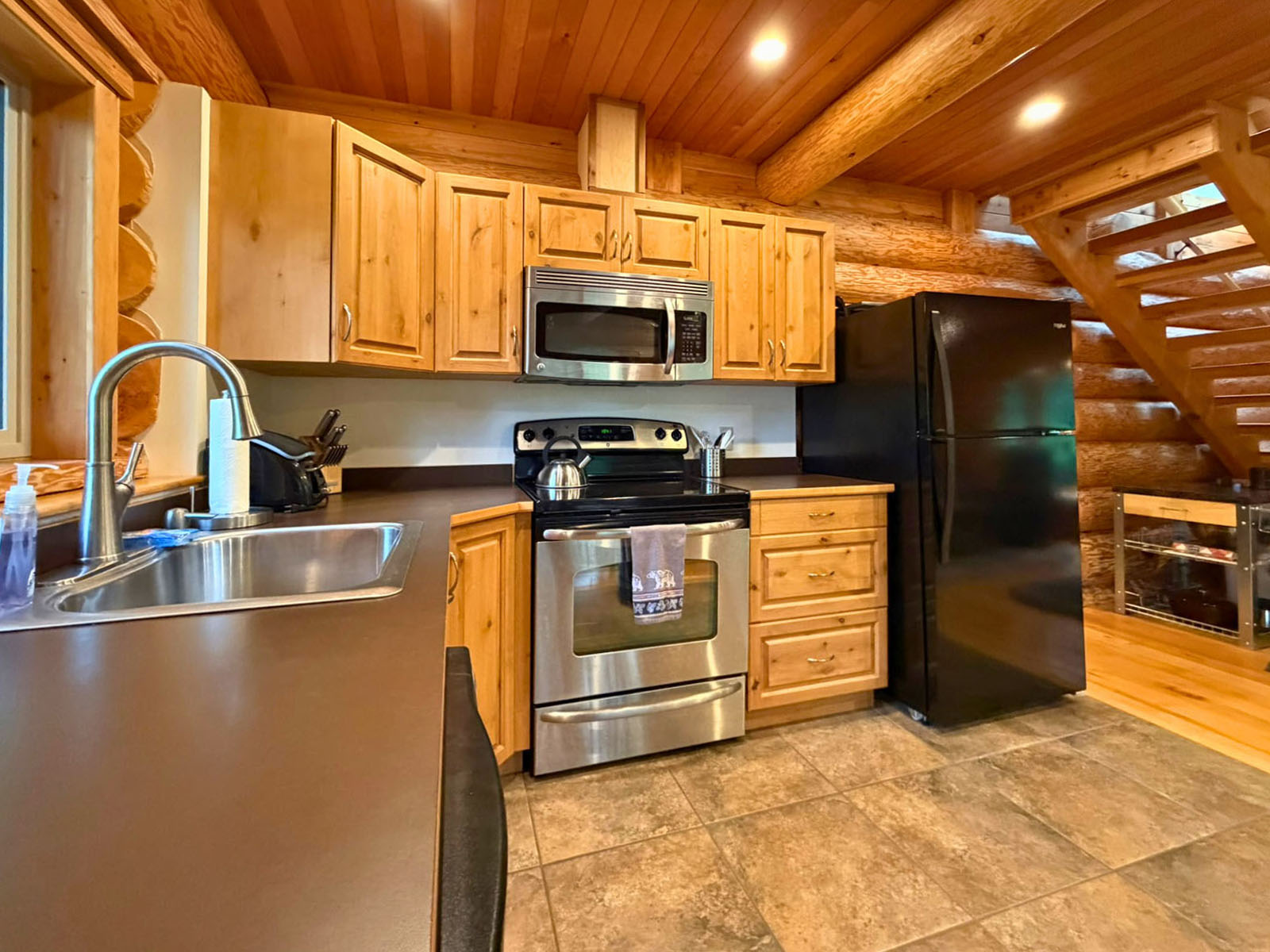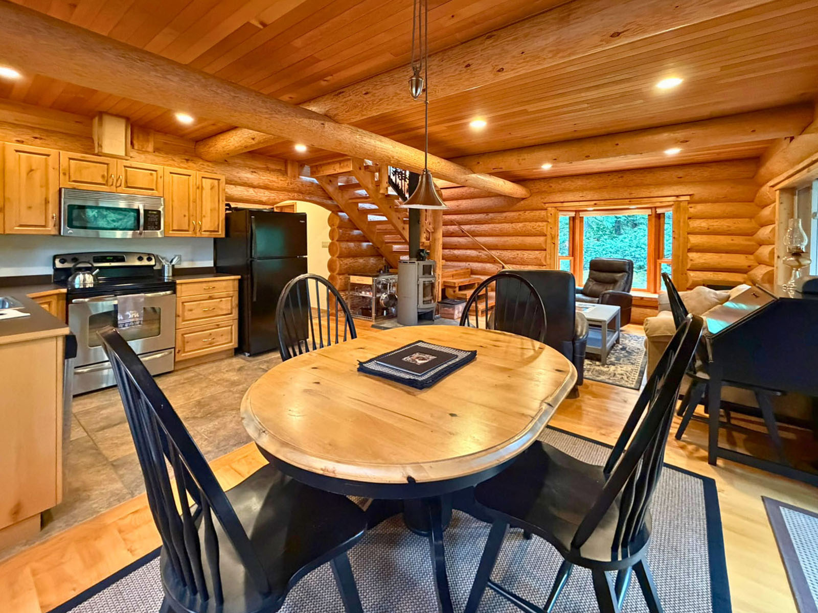 The main floor features an open-concept kitchen, dining, and living area centered around a modern Scandesign wood stove. Maple hardwood floors bring warmth, while radiant tile floors in the kitchen and bathroom add comfort. The well-equipped kitchen includes stainless-steel appliances and ample workspace. A main-floor bedroom enjoys forest views and the 4-piece bathroom features a soaker tub, separate shower, and stacked washer/dryer. Sliding glass doors open to a 24 × 12 ft. sundeck, ideal for outdoor dining.