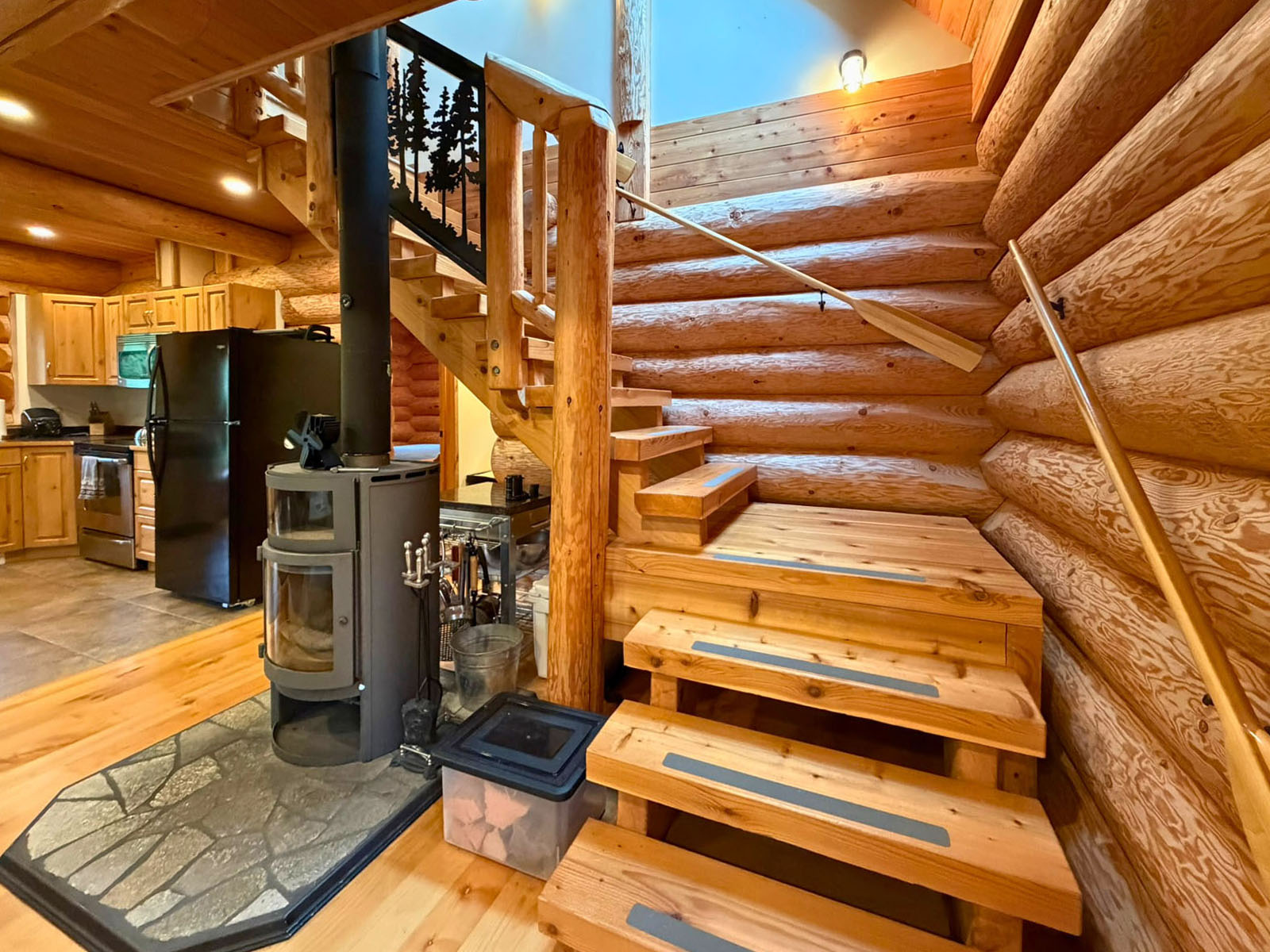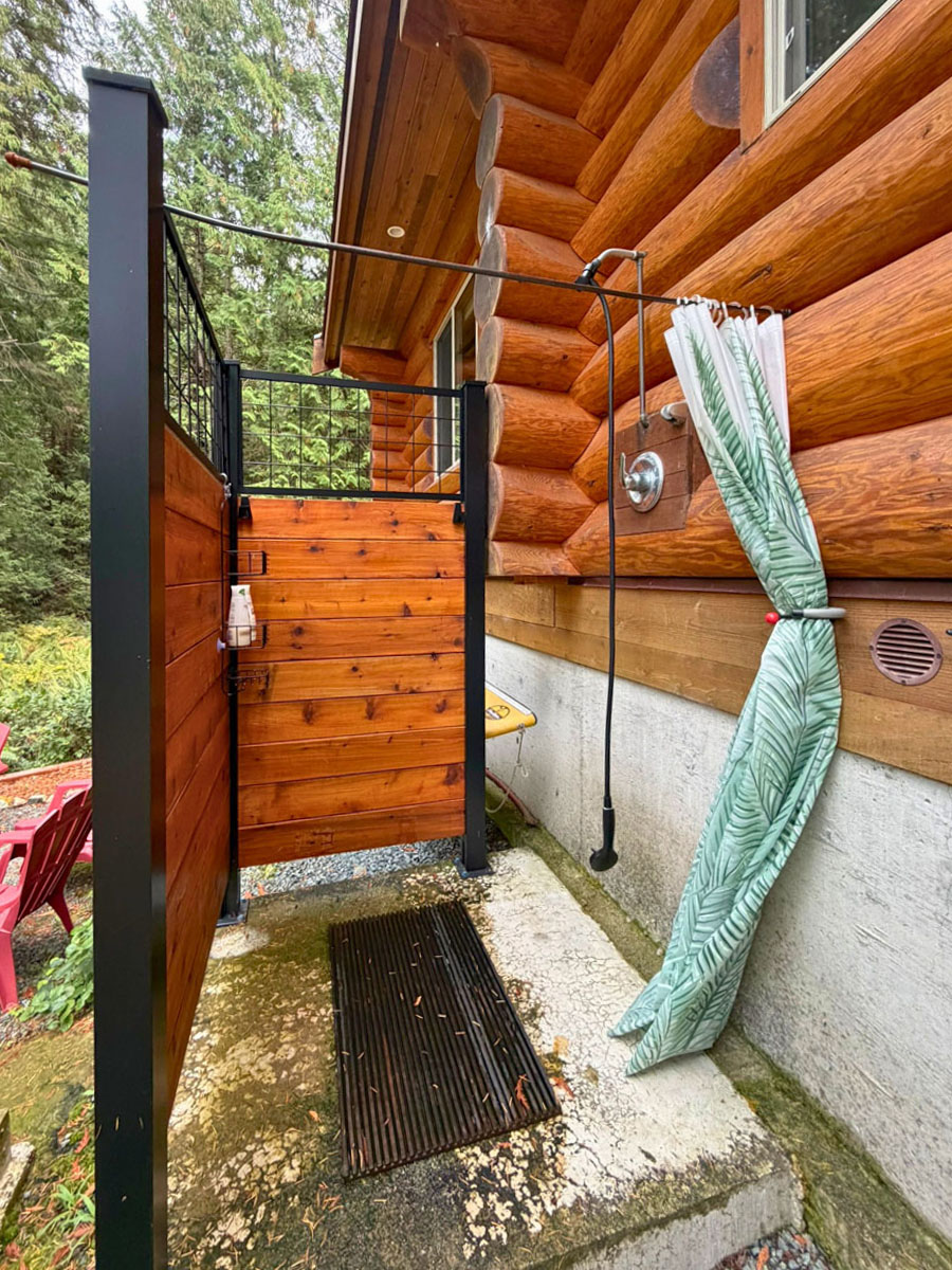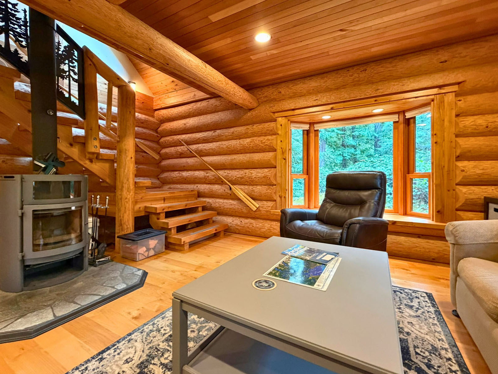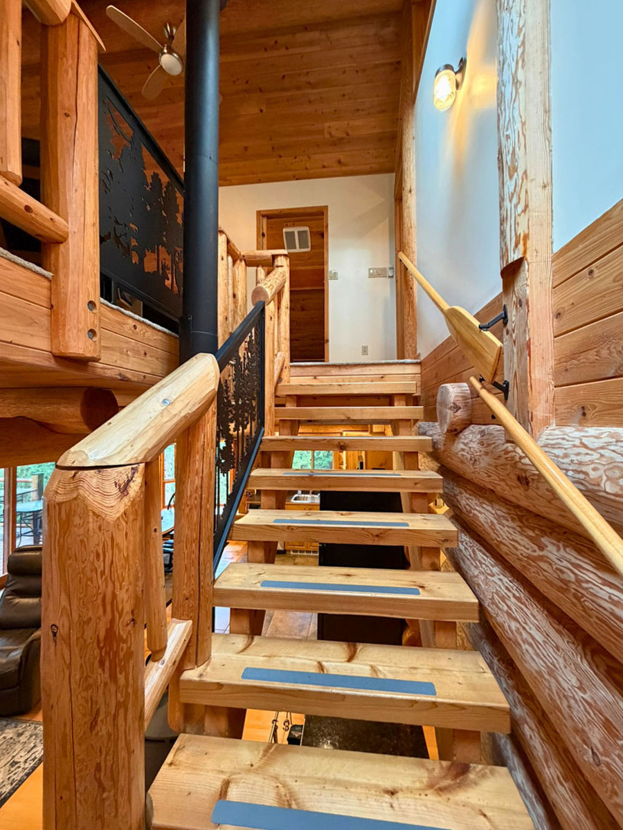 The home includes a 24 x 8 ft deck at the entrance, a metal roof, and a large crawl space for storage. Custom design details include large wooden oars used as handrails and log-framed railings with inlaid metal art of coastal forest scenery, adding unique character throughout. Interior logs are finished with a clear stain, creating a bright, natural feel. Outside, a firepit area and outdoor shower complement the setting.