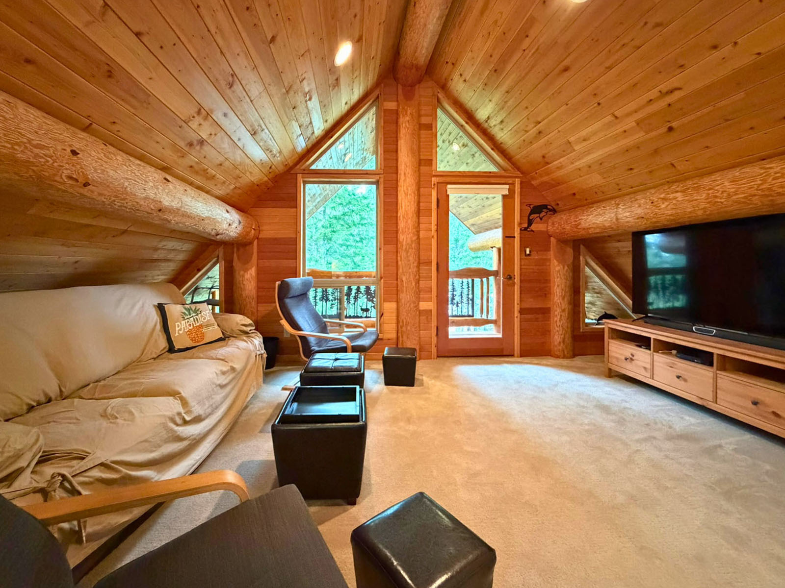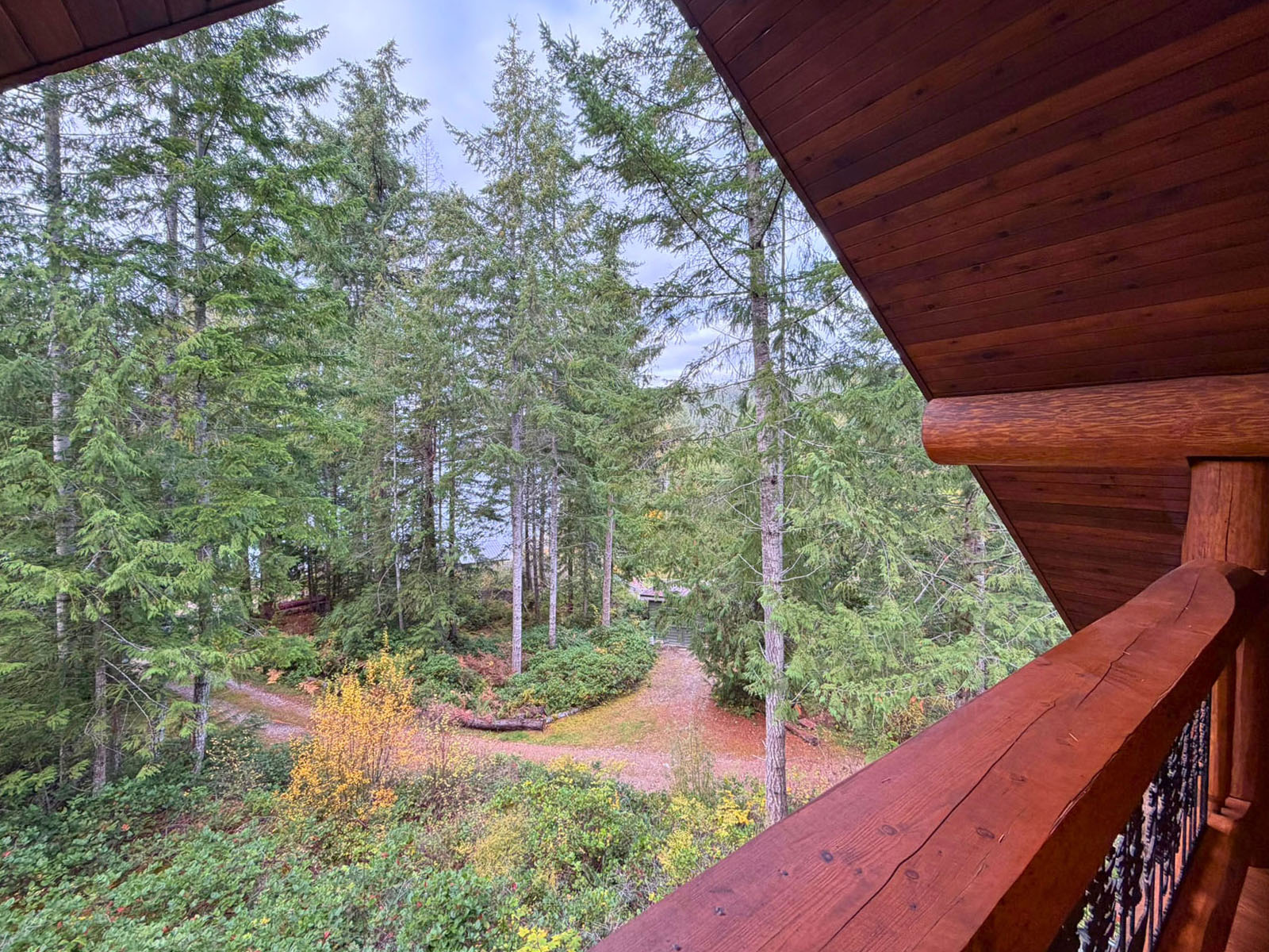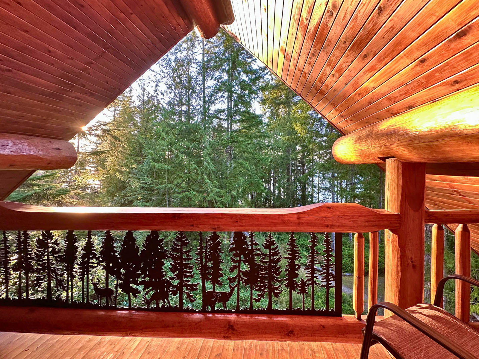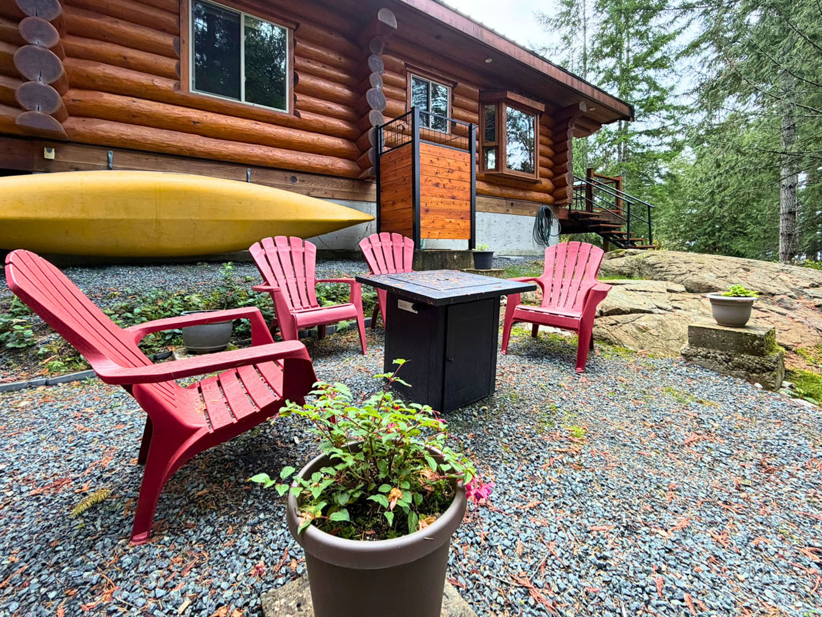 The home includes a 24 x 8 ft deck at the entrance, a metal roof, and a large crawl space for storage. Custom design details include large wooden oars used as handrails and log-framed railings with inlaid metal art of coastal forest scenery, adding unique character throughout. Interior logs are finished with a clear stain, creating a bright, natural feel. Outside, a firepit area and outdoor shower complement the setting.