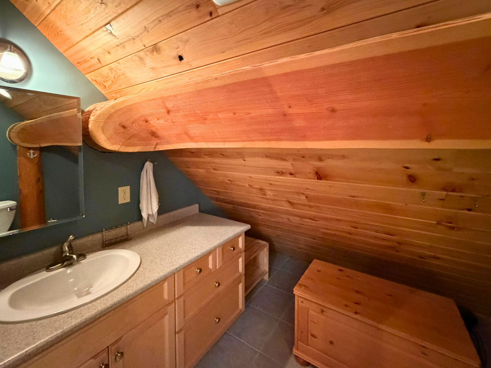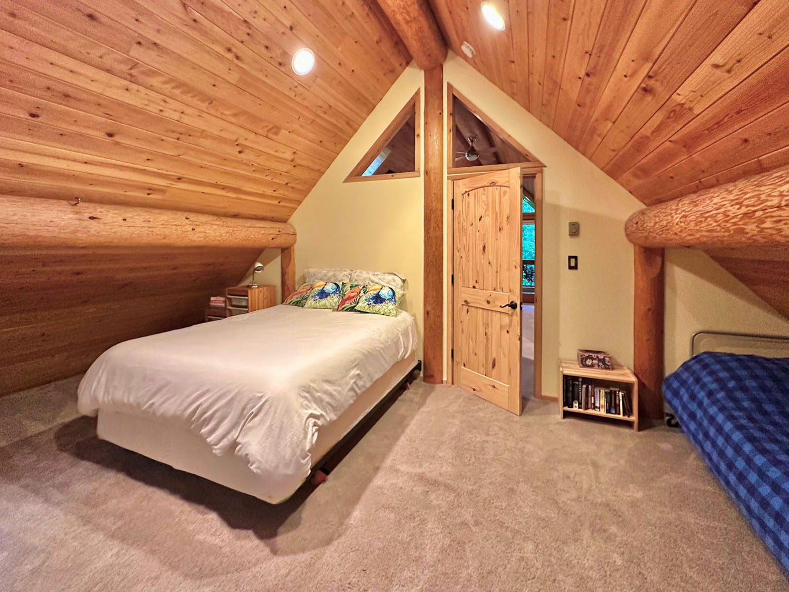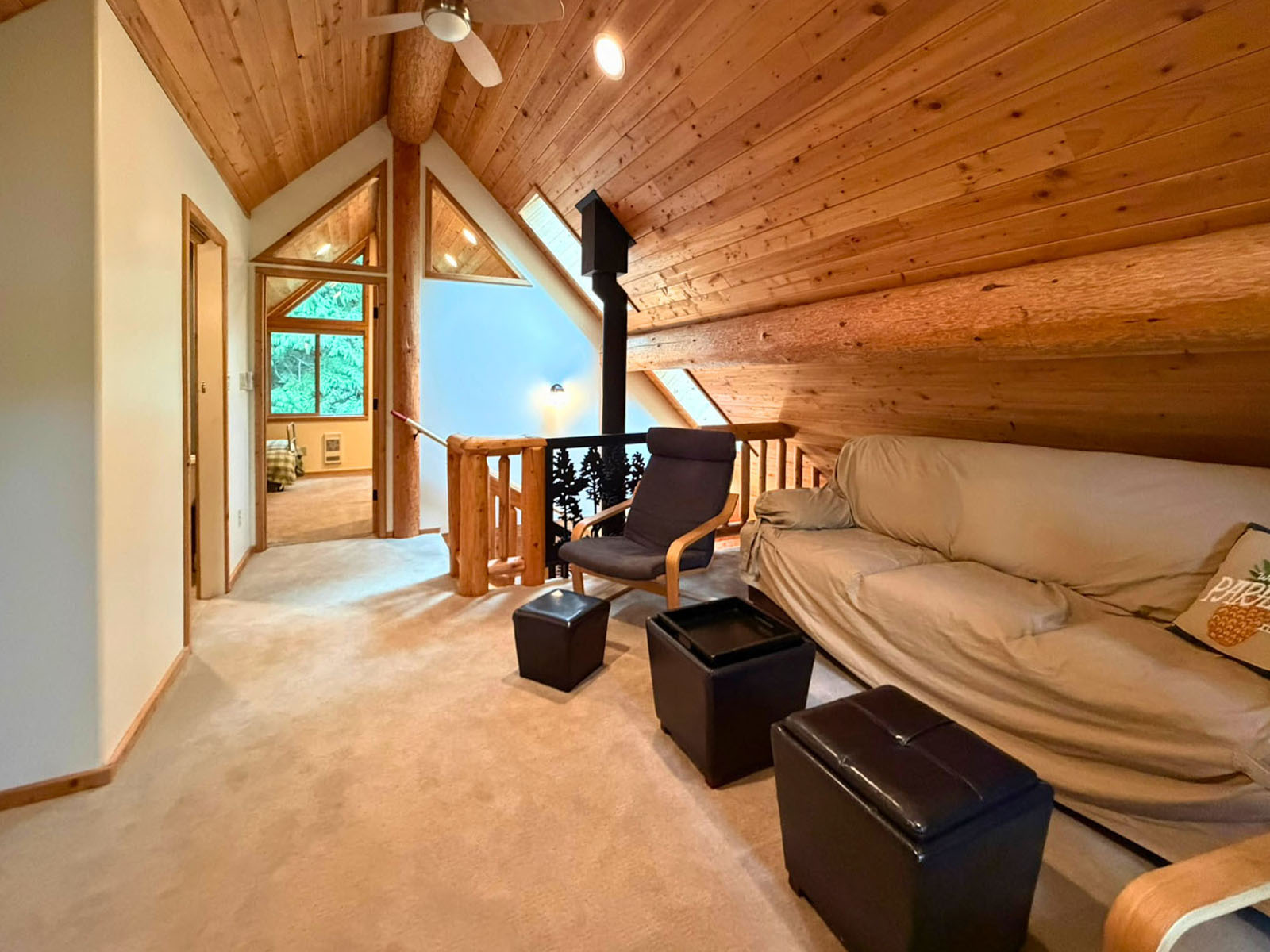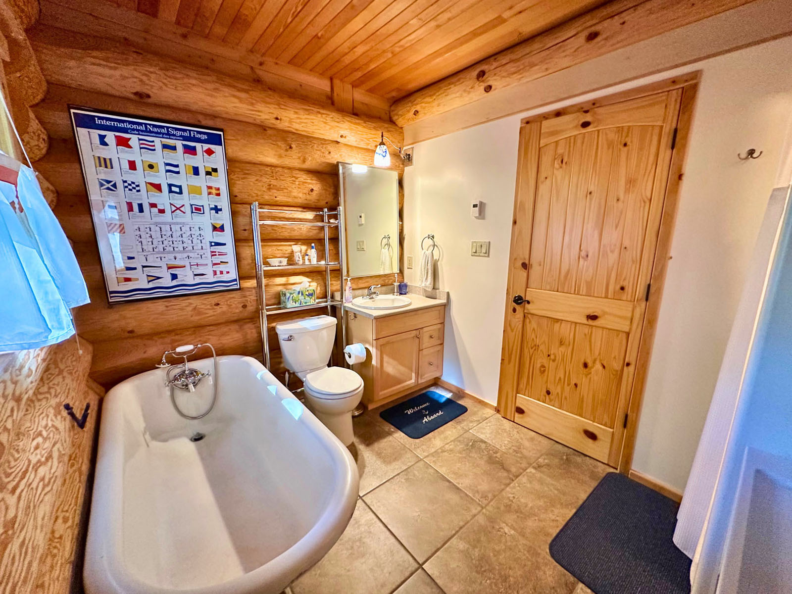 The home includes a 24 x 8 ft deck at the entrance, a metal roof, and a large crawl space for storage. Custom design details include large wooden oars used as handrails and log-framed railings with inlaid metal art of coastal forest scenery, adding unique character throughout. Interior logs are finished with a clear stain, creating a bright, natural feel. Outside, a firepit area and outdoor shower complement the setting.