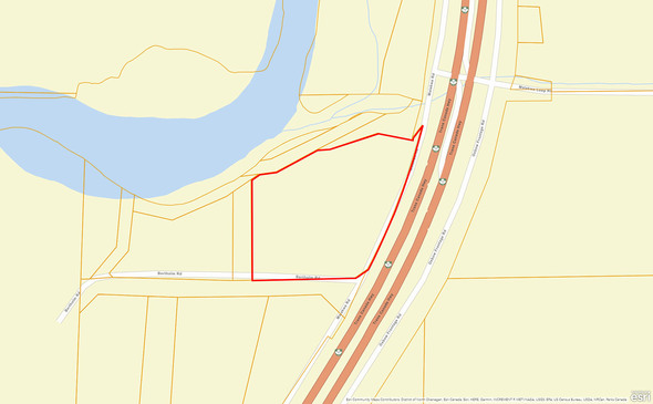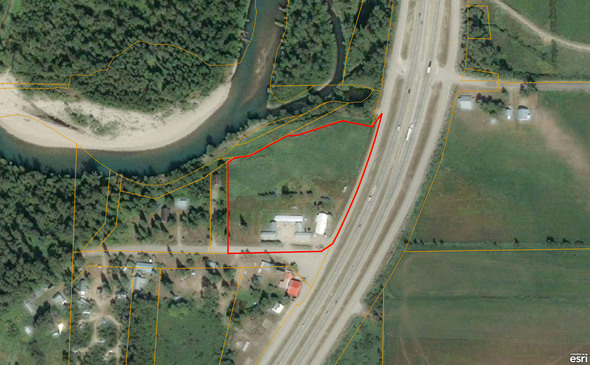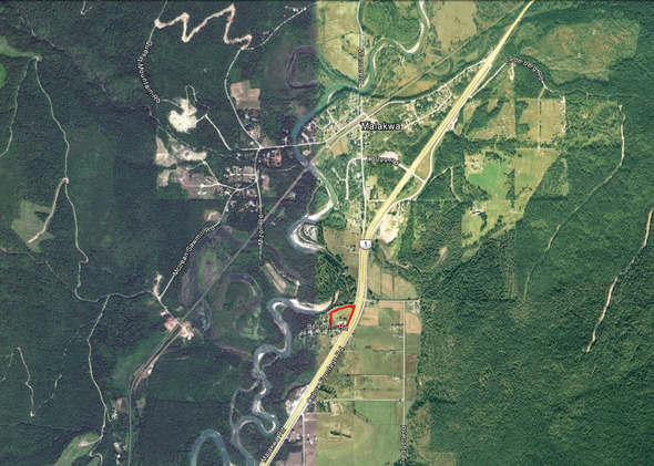 Property is 5.55 acres of flat and cleared land with good access, highway exposure, power and a well. The land has been vacant for many years, its former use (two owners ago) was a motel that has now been removed and is ready for its next chapter. Across the side road is a café, behind the land and towards the Eagle River are a couple of private residences, while across the highway is a larger agricultural property. There appears to be a small strip of Crown land between it and the river—see maps.