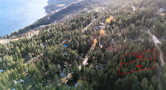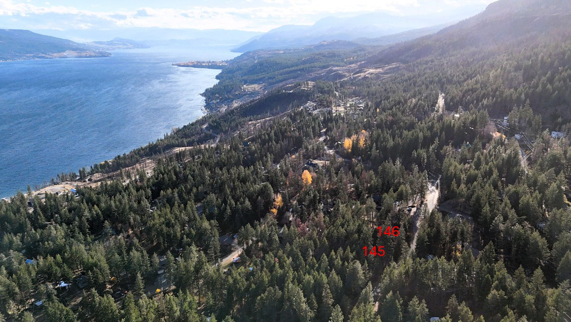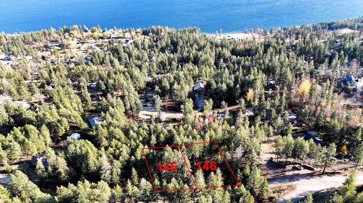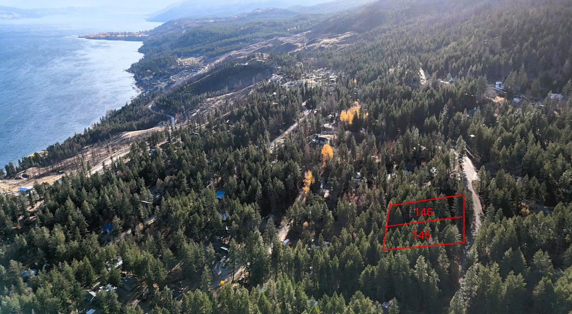 Beautifully treed lots on the west side of Okanagan Lake near Killiney Beach approximately 30 minutes to Vernon or 40 minutes to Kelowna. Both of these lake view lots are 0.51 acres and the lot dimensions are all 100 feet wide at the road and 221.6 feet deep. The lots are listed for sale separately—$84k for Lot 145 and $94k for Lot 146.