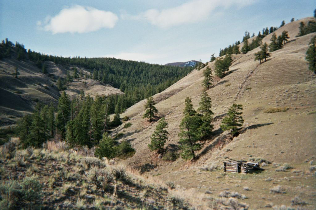The Churn Creek region is one of the most historically significant landscapes in British Columbia’s Interior, shaped by the Fraser River gold rush beginning in 1858 and the subsequent Cariboo gold rush that drew thousands of prospectors inland through Lillooet and across the surrounding plateau. Creeks, benches, and drainages throughout the area were systematically worked by independent miners who traveled by horseback, establishing temporary camps and cabins as they followed gold-bearing watercourses into the backcountry. Simon’s Creek, which transects this property, was among those worked during this period, and the land later came under the stewardship of prospector Simon Phillipine, who packed gold out of the area using horses and relied on the creek’s cold, spring-fed water and nearby benches to support his operations. Remnants of this era remain directly on the property today, including the skeletal remains of two old cabins and a tack storage building tucked beneath a prominent rock outcrop, offering rare, tangible evidence of early gold-rush activity.