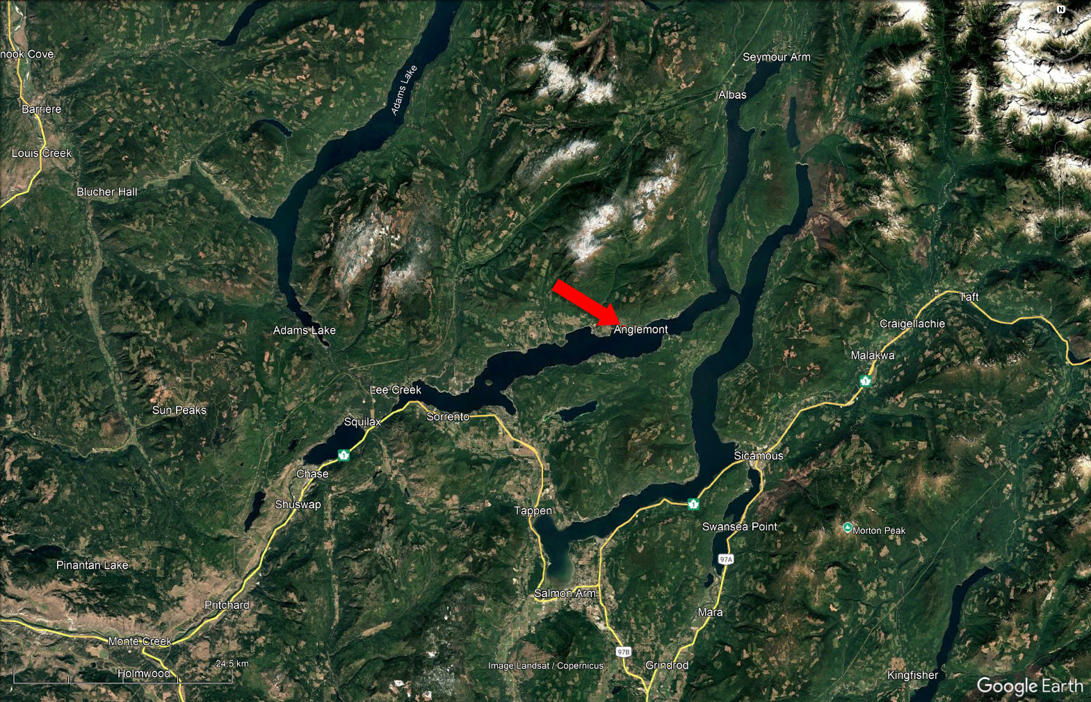 Anglemont is a lakeside community in the North Shuswap, located 1 hour to Salmon Arm and just over an hour the major city of Kamloops. The North Shuswap is made of a string of lakeside communities—Lee Creek, Scotch Creek, Celista, Magna Bay, Anglemont, St. Ives, and Seymour with a year-round population of approx. 3,500 and many more vacation home visitors. The North Shuswap truly is an unparalleled paradise. Mild winters, warm/hot summers, long autumns and short winters make for a perfect BC lifestyle. Rainy periods last hours, not days or weeks and then the sun is out again. A long growing season means that gardeners are some of the happiest people around here. Vineyards (the most northerly in the province), nectarines, apples, cherries, pears, peaches and parsnips grow throughout the area. Local farms produce excellent beef and lamb. (Source: North Shuswap Chamber of Commerce)