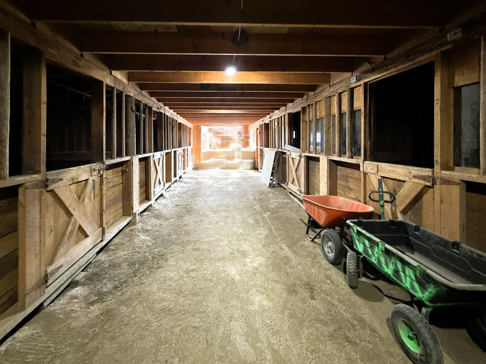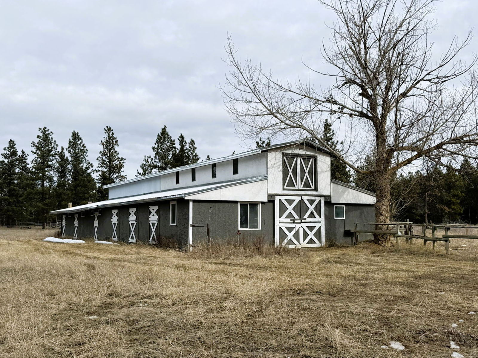 Equestrian infrastructure is well developed, including an 11-stall horse barn with hay loft, tack rooms, and a bunk room, all situated among multiple corrals and paddocks. Additional features include a separate horse shelter with water and several functional storage buildings around the property. An Olympic-size dressage arena is also located on the property; while it has grown over, it could be restored with reasonable work.