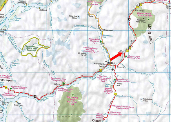 The vegetation around Usk reflects a transition between coastal rainforest influence and interior forest ecosystems, creating a rich and diverse landscape along the Skeena River valley. The area is dominated by mixed coniferous forests, with western hemlock, western red cedar, and Sitka spruce common in wetter sites, while lodgepole pine and interior spruce appear in slightly drier or more open areas. Deciduous trees such as black cottonwood, trembling aspen, and paper birch are often found along riverbanks, floodplains, and in regenerating forest stands.