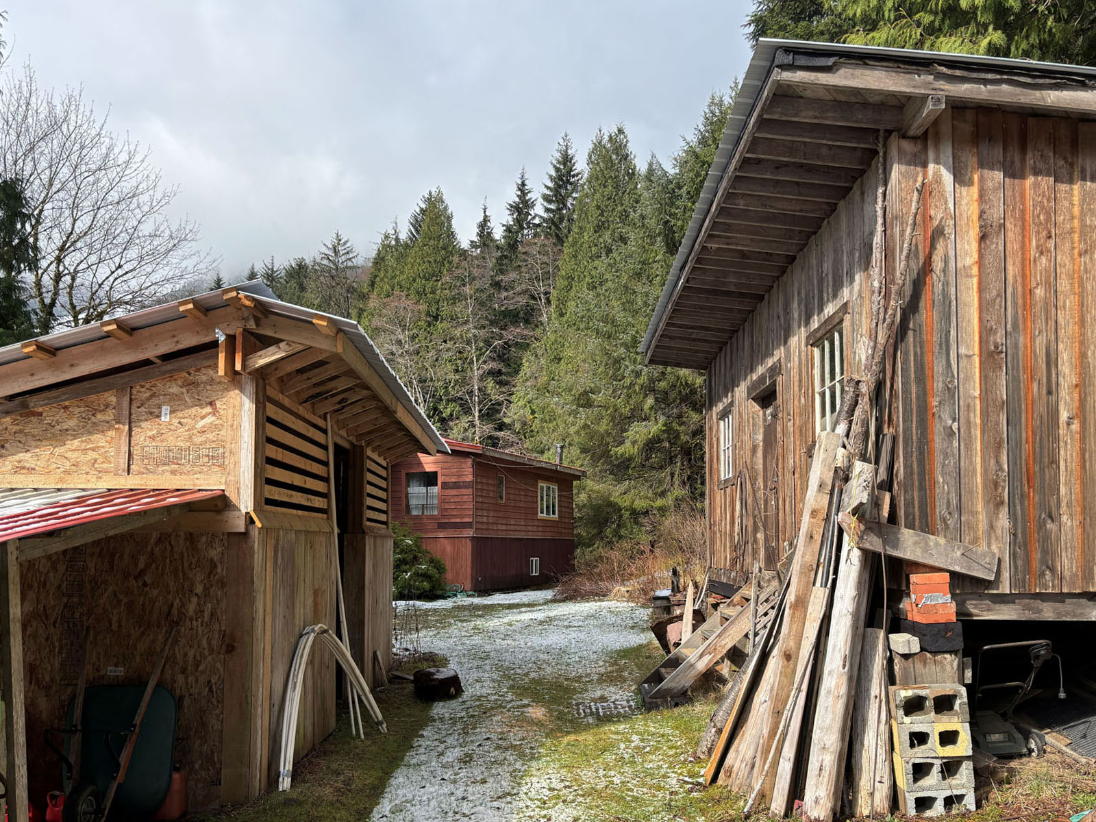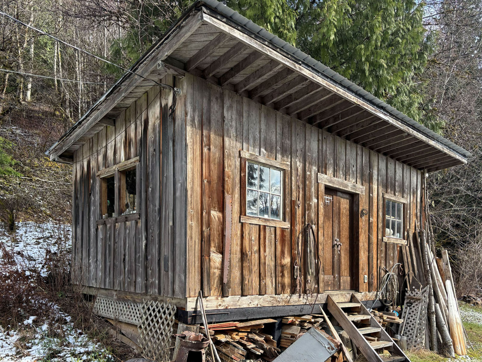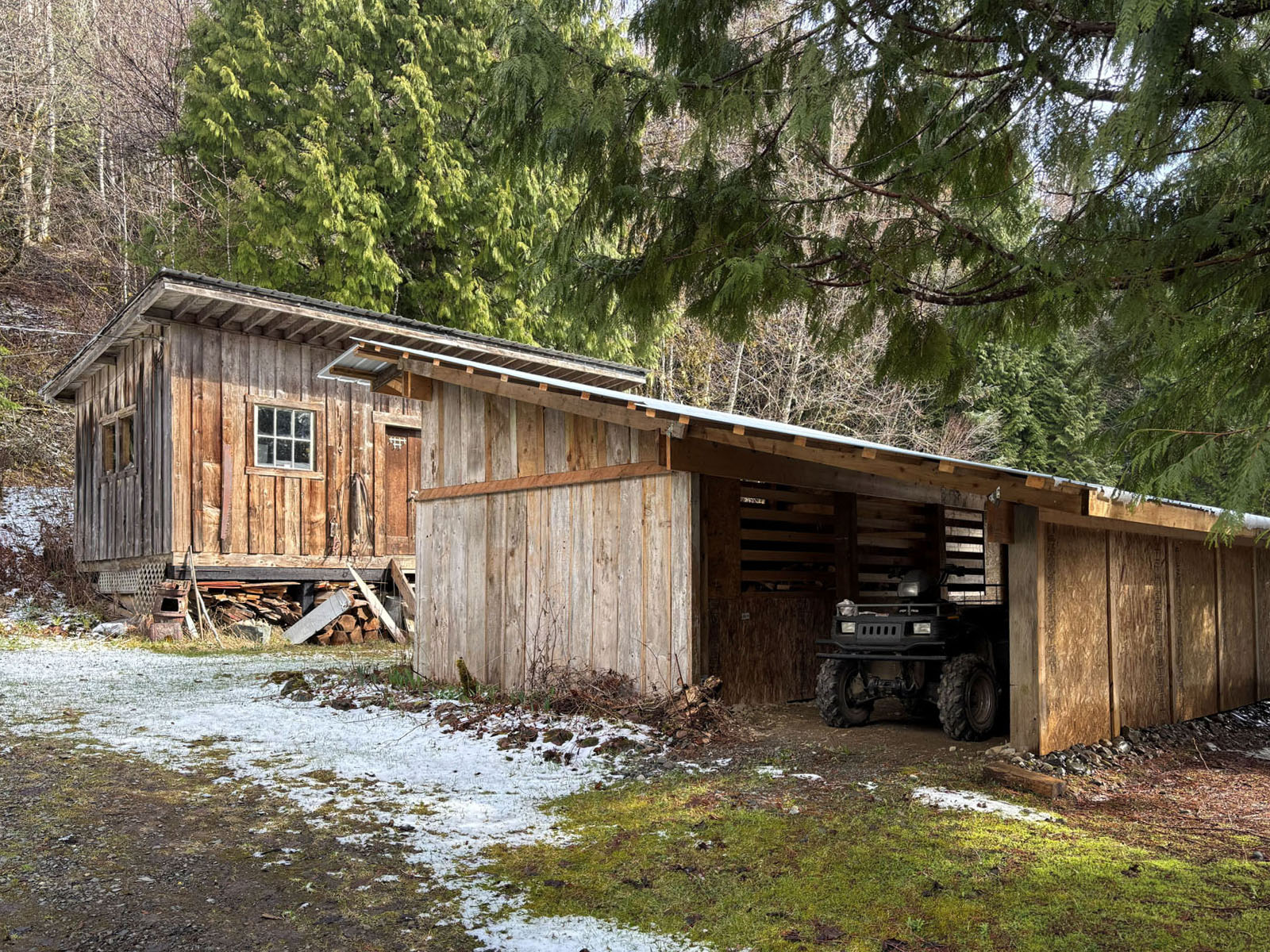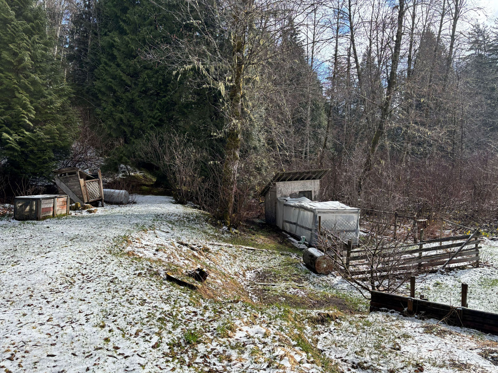 The cozy home has summer cottage vibes and features a wood stove on the main floor, a pellet stove in the basement, and supplemental electric baseboard heating. The main level includes a master bedroom with a nice view over the front of the property, while a second bedroom is located downstairs, along with a functional workshop area, laundry and deep freeze. Outside, the property is well suited for self-sufficiency, with multiple garden plots, raised beds, and a variety of established plants including blackberries, Saskatoon bushes, apple and cherry trees, currants, and natural medicinal species such as stinging nettle and devil’s club. A former chicken coop/goat house currently serves as a greenhouse, and a conveniently plumbed sink is located near the garden beds.