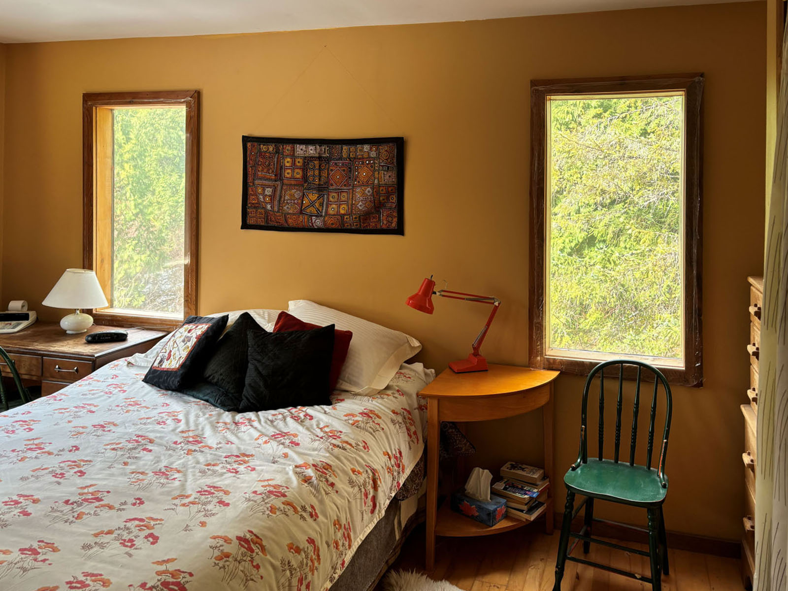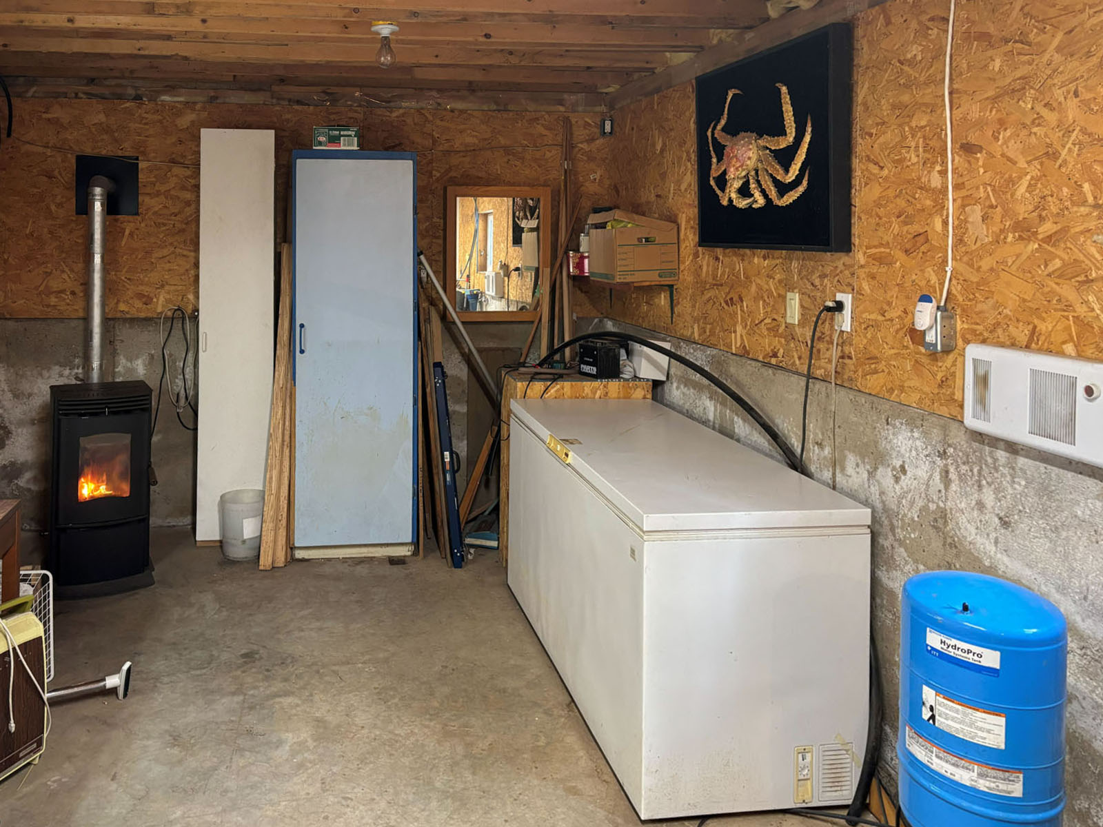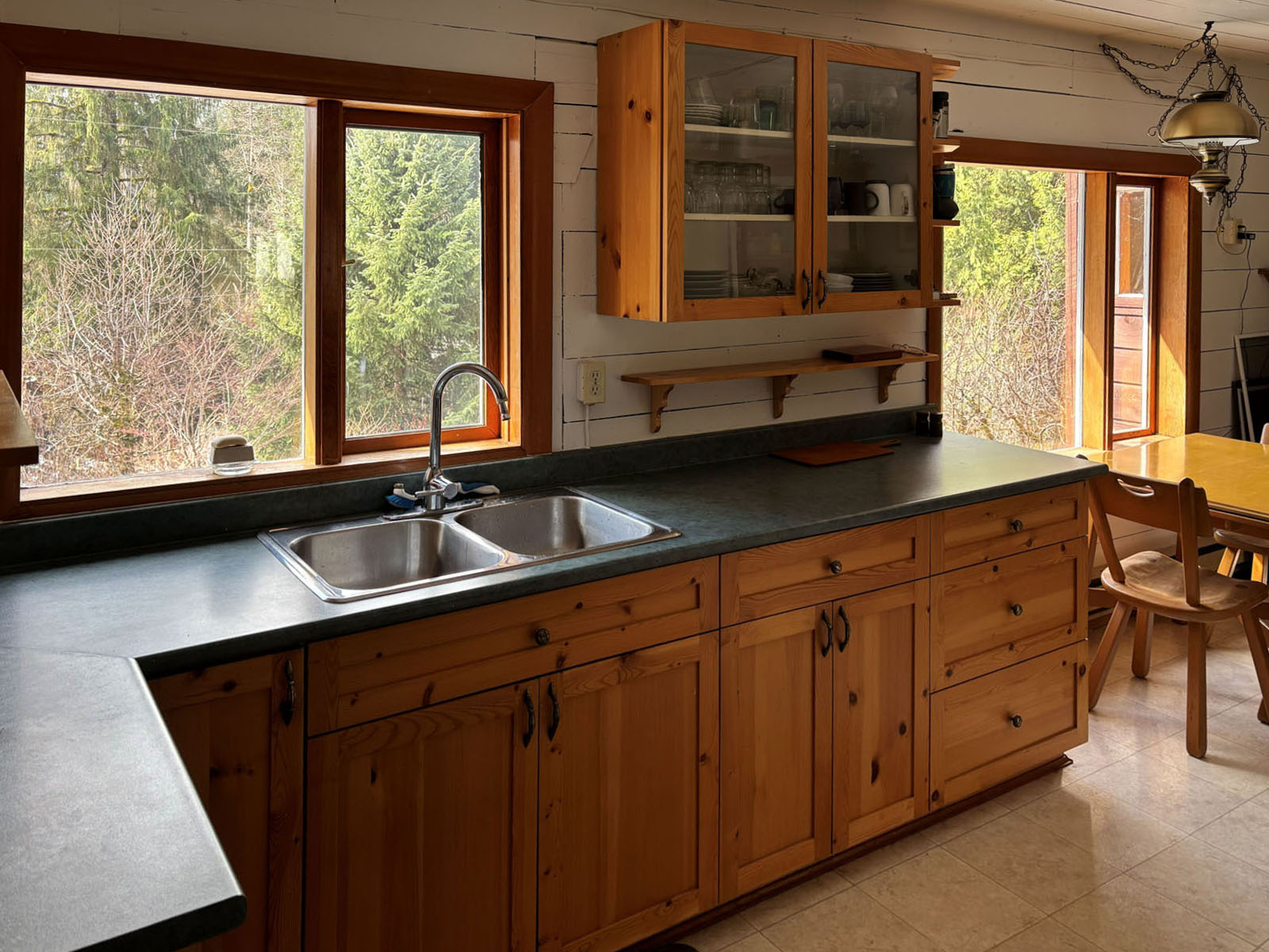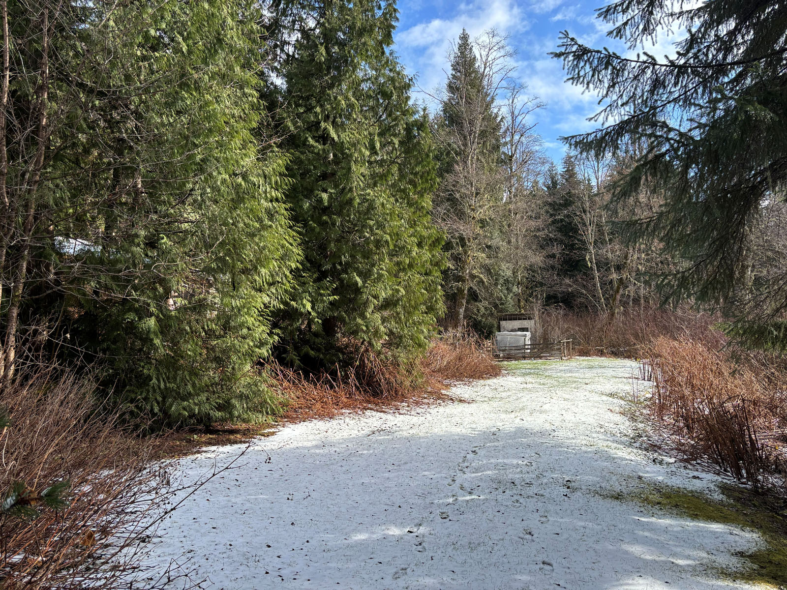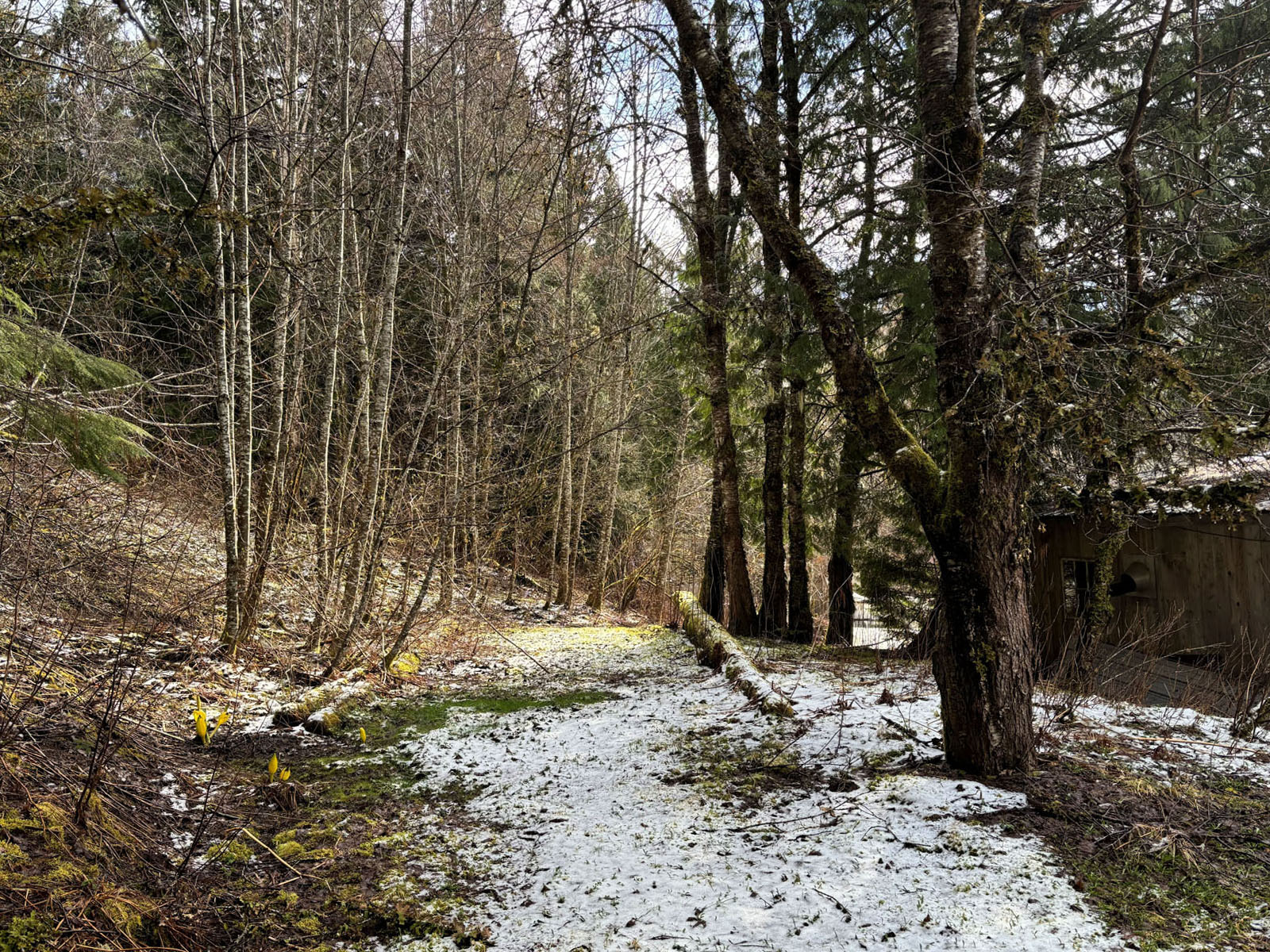 The cozy home has summer cottage vibes and features a wood stove on the main floor, a pellet stove in the basement, and supplemental electric baseboard heating. The main level includes a master bedroom with a nice view over the front of the property, while a second bedroom is located downstairs, along with a functional workshop area, laundry and deep freeze. Outside, the property is well suited for self-sufficiency, with multiple garden plots, raised beds, and a variety of established plants including blackberries, Saskatoon bushes, apple and cherry trees, currants, and natural medicinal species such as stinging nettle and devil’s club. A former chicken coop/goat house currently serves as a greenhouse, and a conveniently plumbed sink is located near the garden beds.