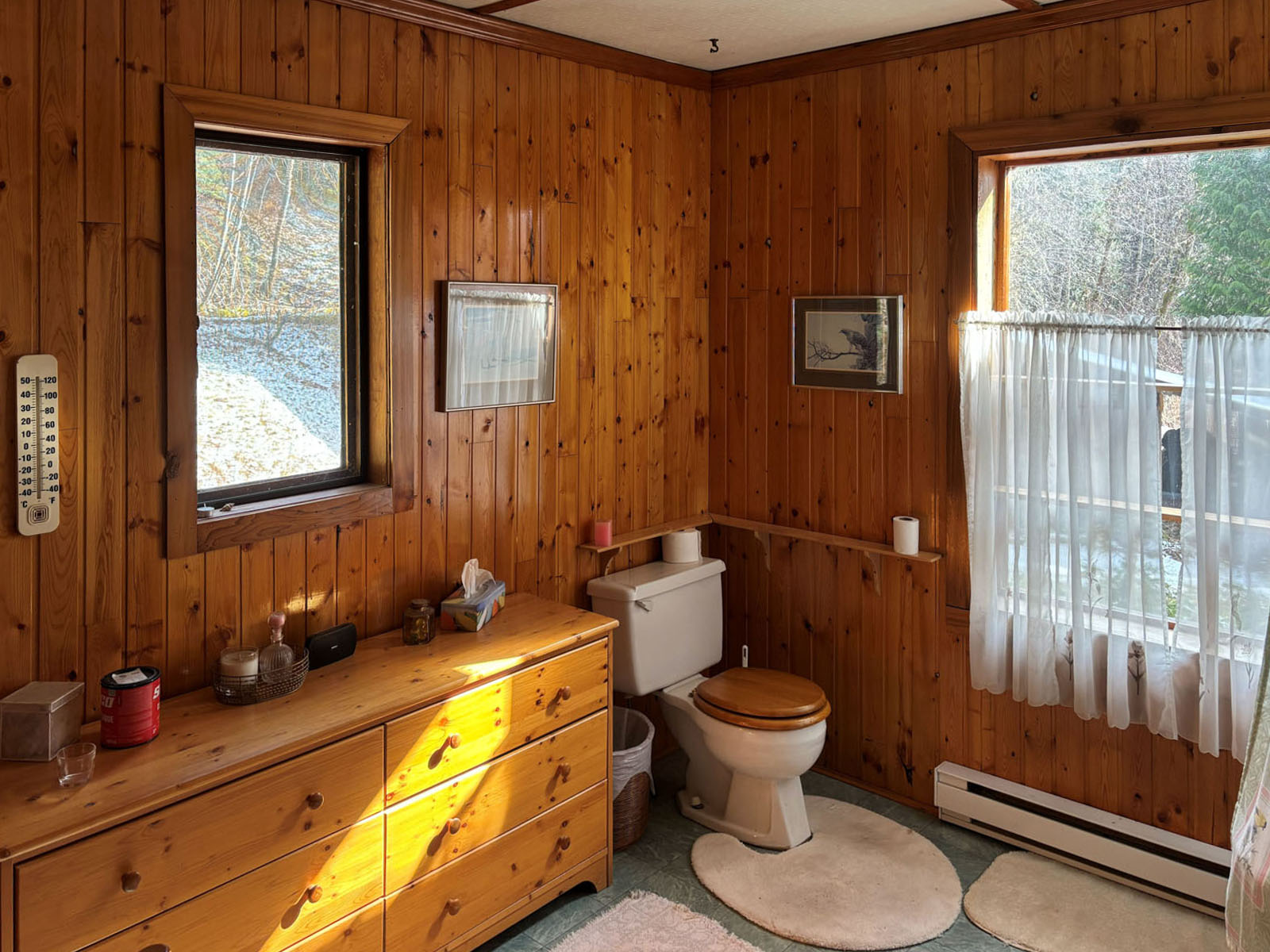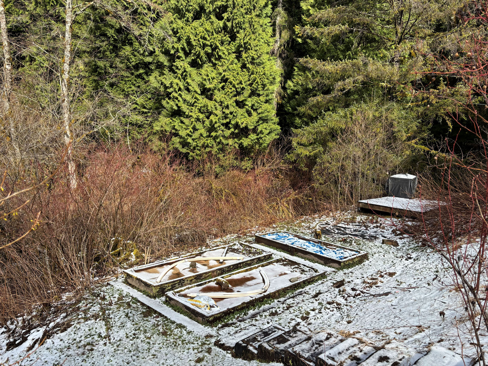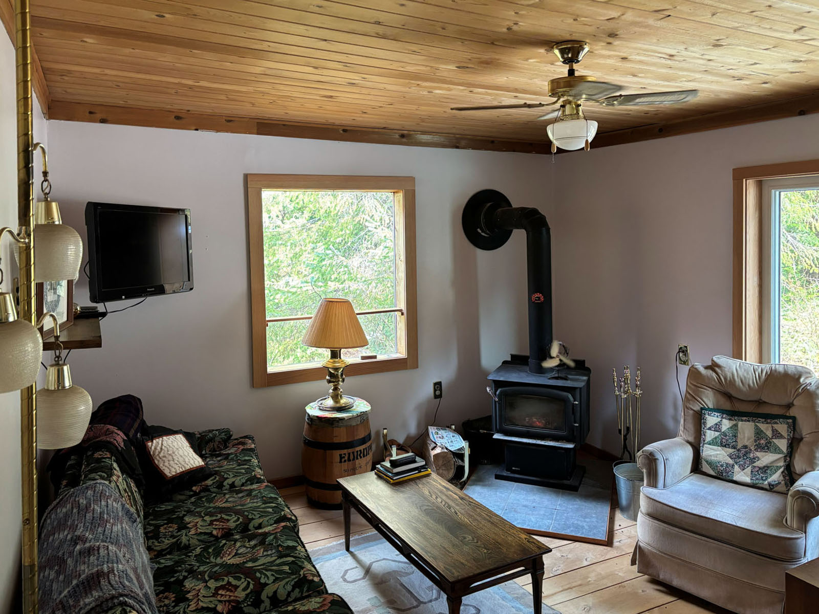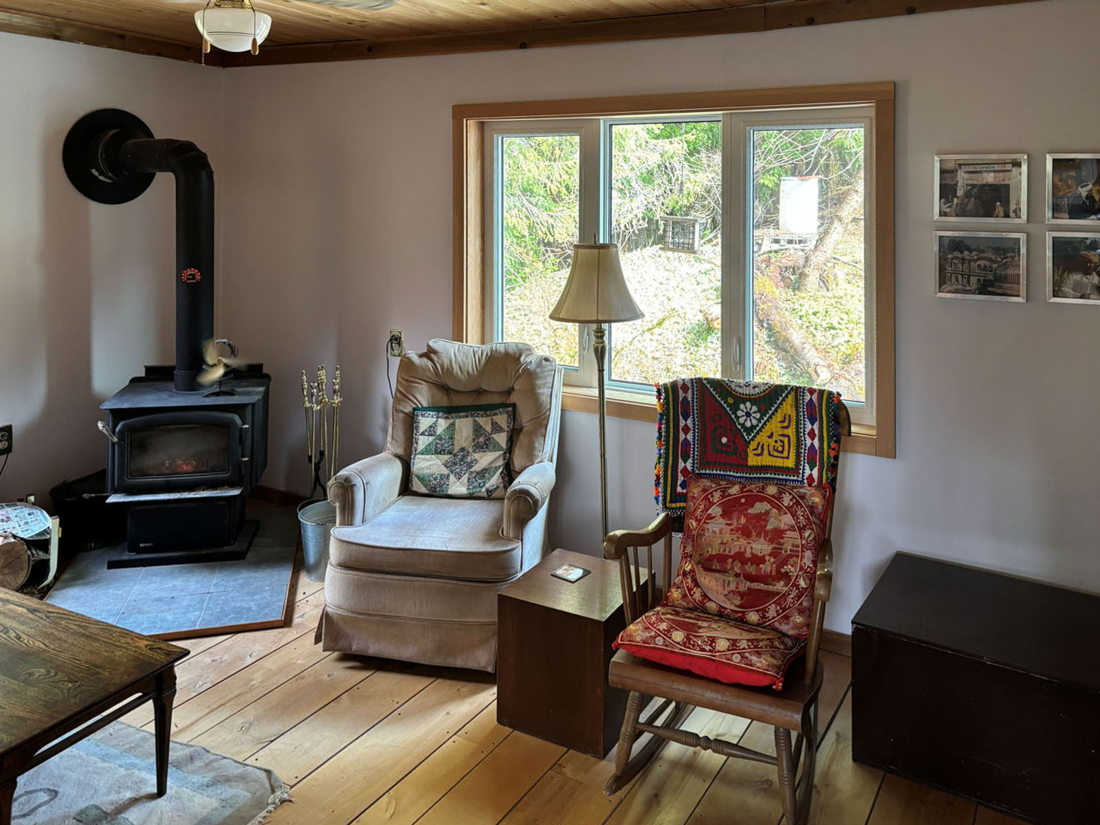 The cozy home has summer cottage vibes and features a wood stove on the main floor, a pellet stove in the basement, and supplemental electric baseboard heating. The main level includes a master bedroom with a nice view over the front of the property, while a second bedroom is located downstairs, along with a functional workshop area, laundry and deep freeze. Outside, the property is well suited for self-sufficiency, with multiple garden plots, raised beds, and a variety of established plants including blackberries, Saskatoon bushes, apple and cherry trees, currants, and natural medicinal species such as stinging nettle and devil’s club. A former chicken coop/goat house currently serves as a greenhouse, and a conveniently plumbed sink is located near the garden beds.