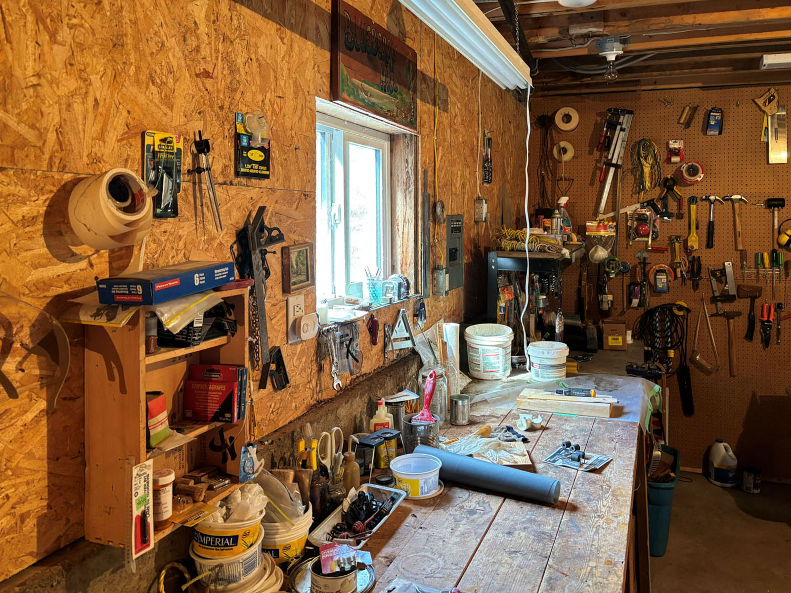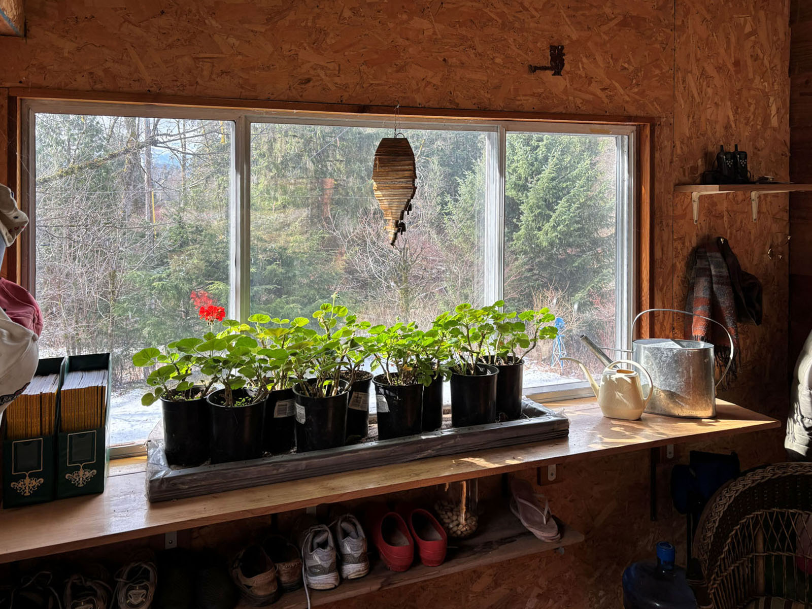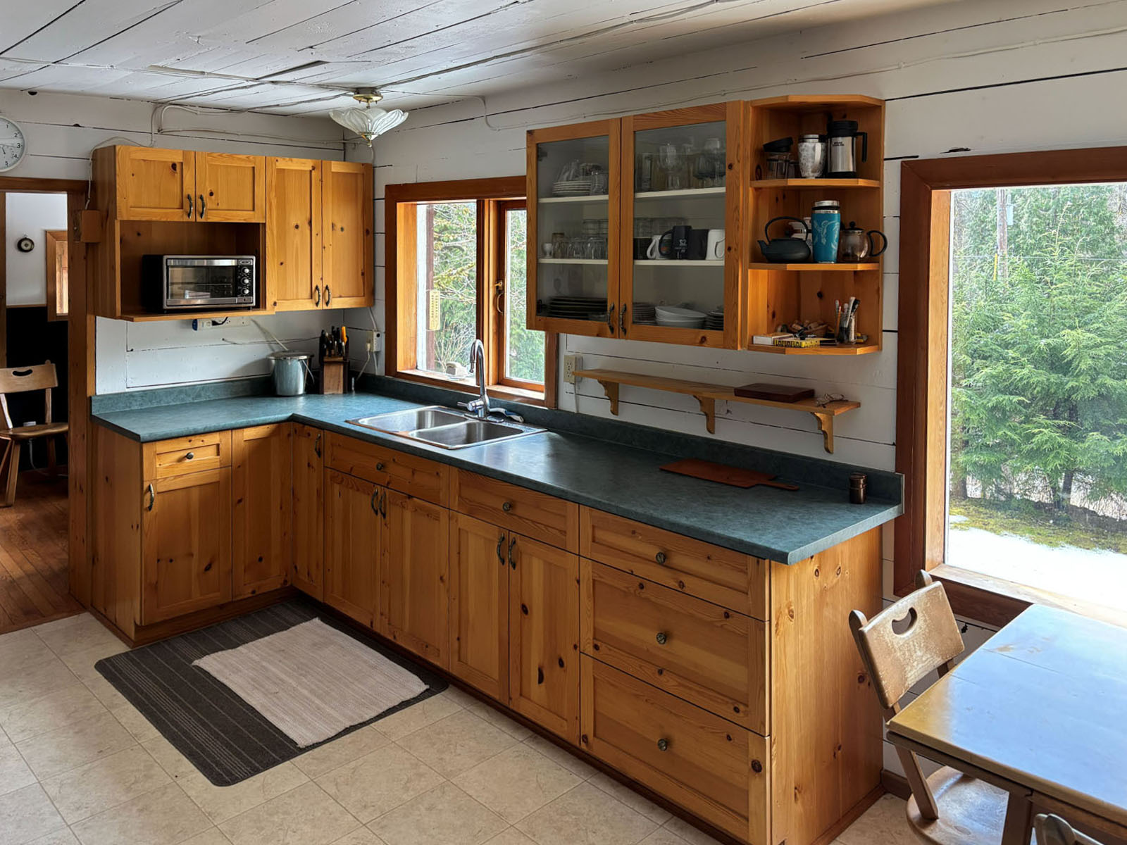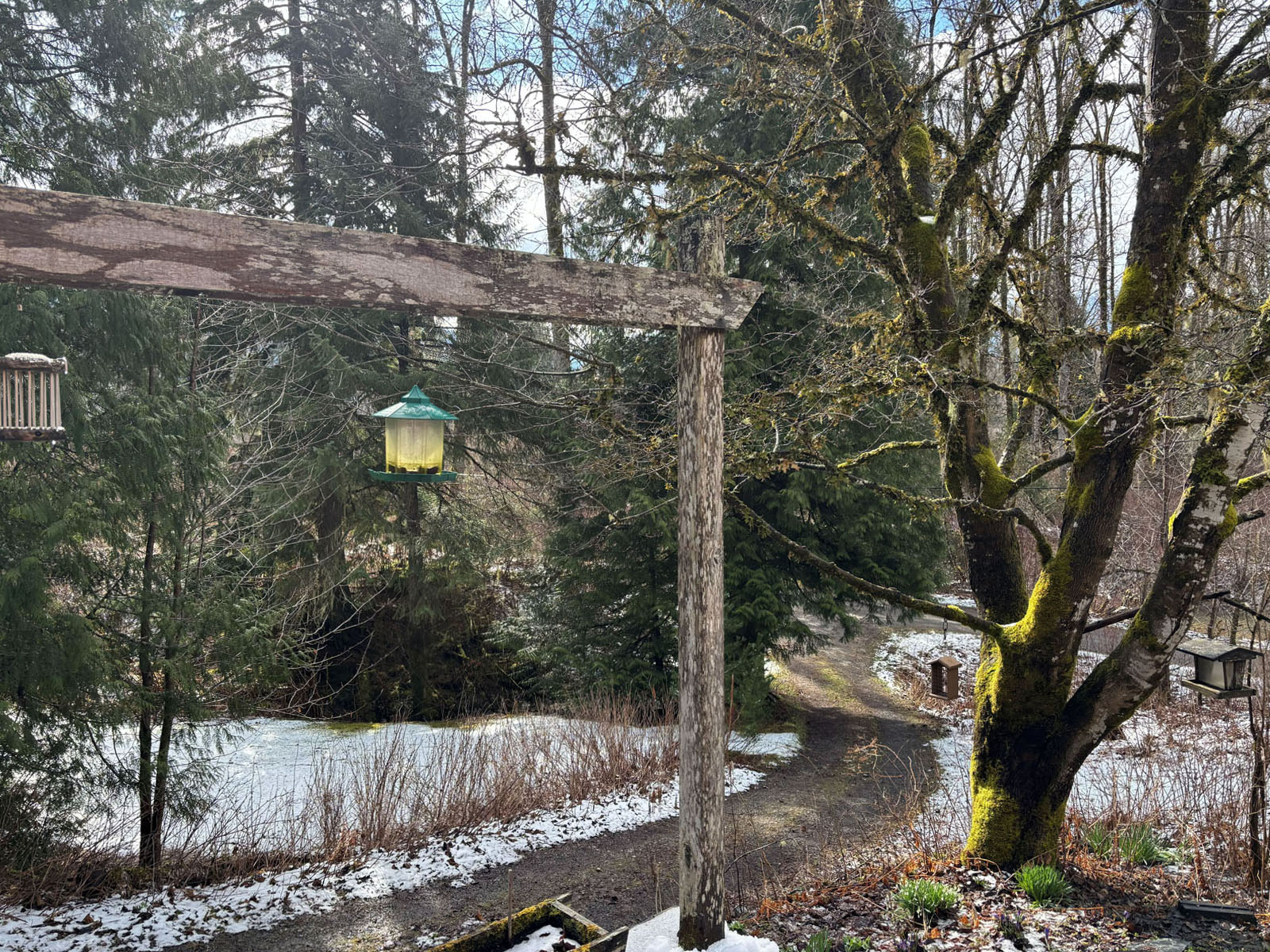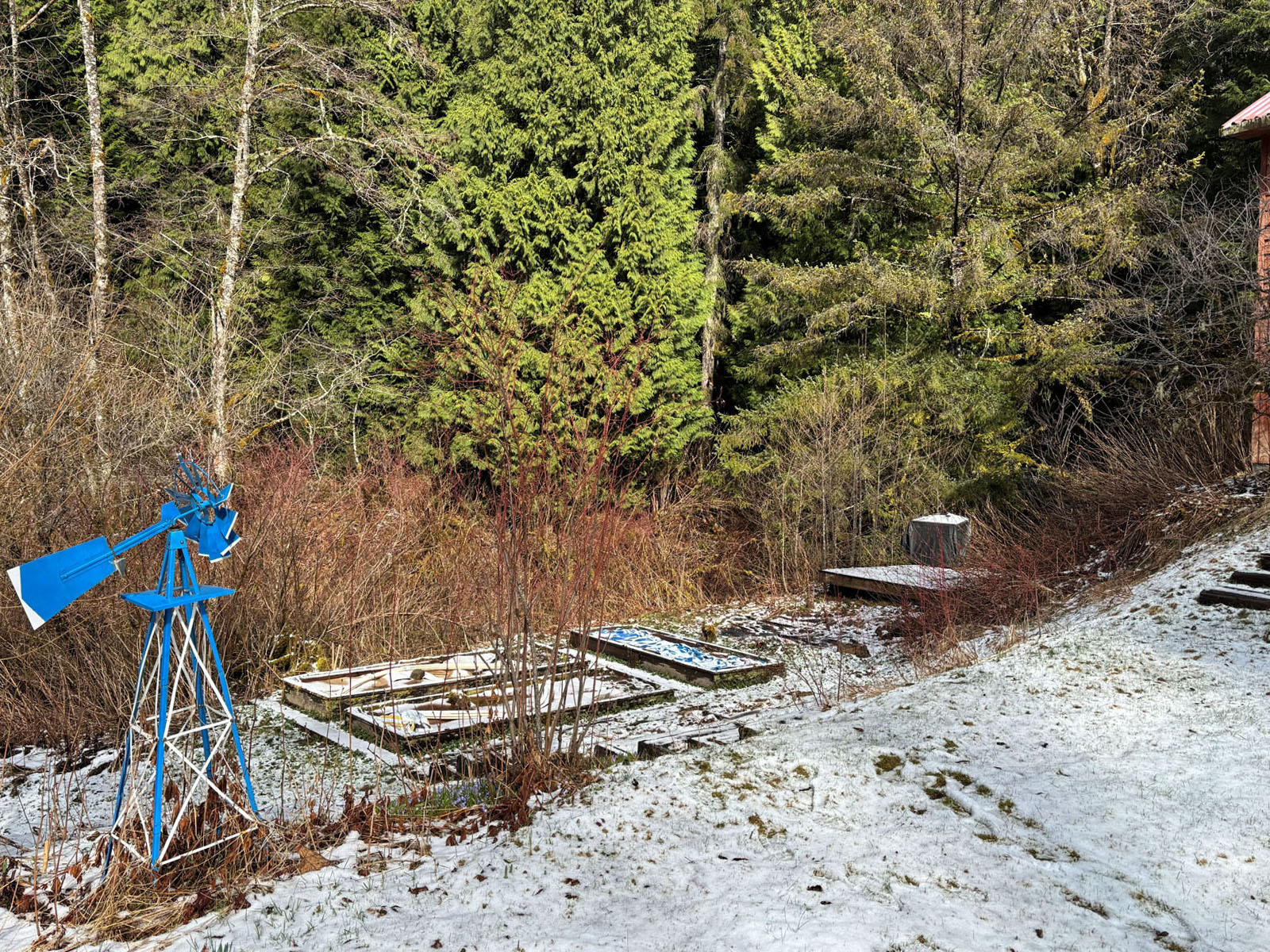 The cozy home has summer cottage vibes and features a wood stove on the main floor, a pellet stove in the basement, and supplemental electric baseboard heating. The main level includes a master bedroom with a nice view over the front of the property, while a second bedroom is located downstairs, along with a functional workshop area, laundry and deep freeze. Outside, the property is well suited for self-sufficiency, with multiple garden plots, raised beds, and a variety of established plants including blackberries, Saskatoon bushes, apple and cherry trees, currants, and natural medicinal species such as stinging nettle and devil’s club. A former chicken coop/goat house currently serves as a greenhouse, and a conveniently plumbed sink is located near the garden beds.