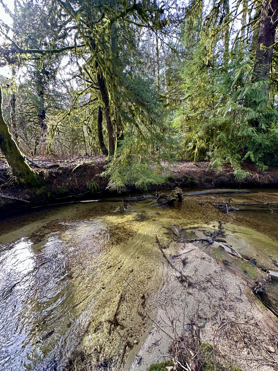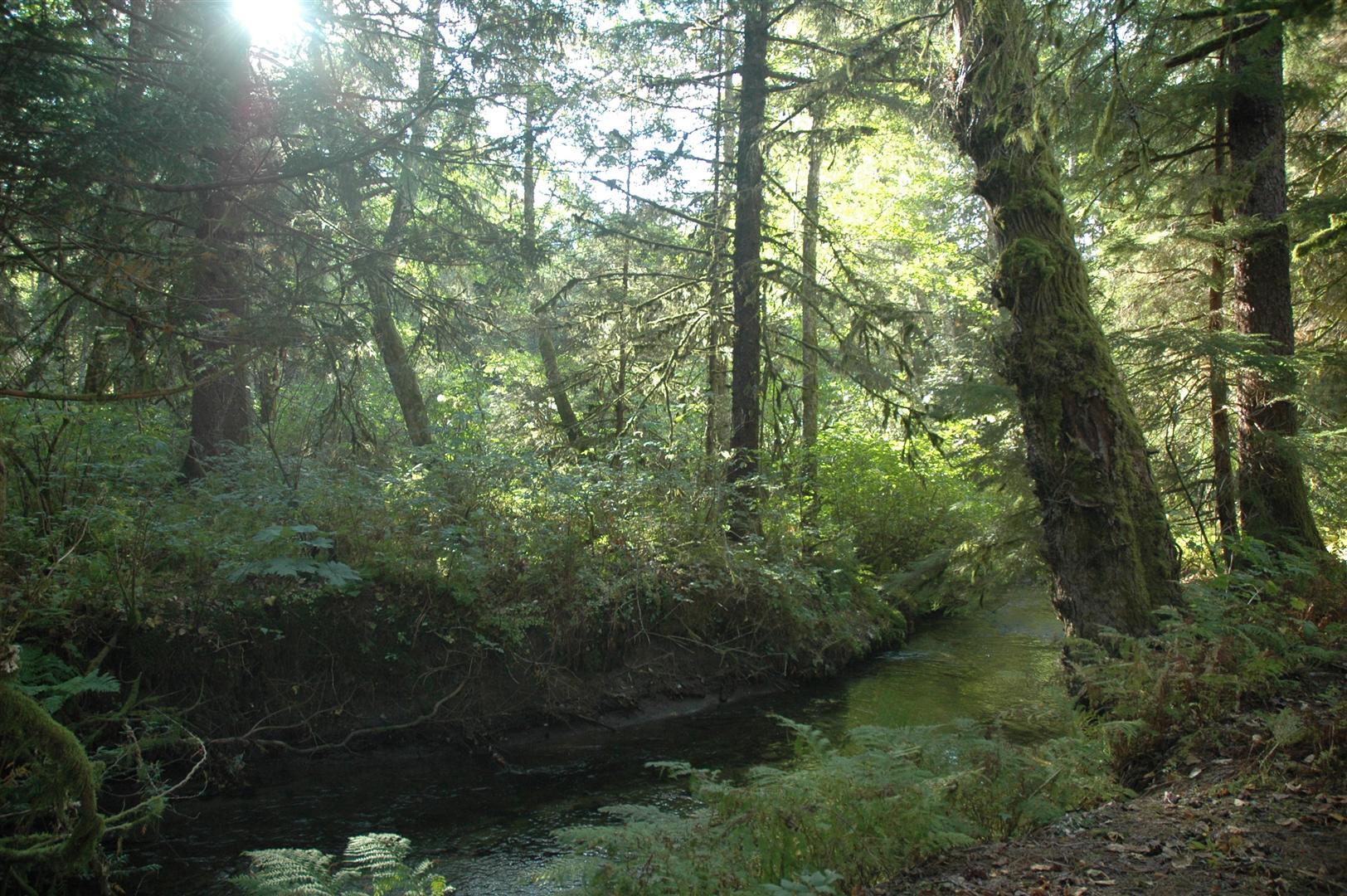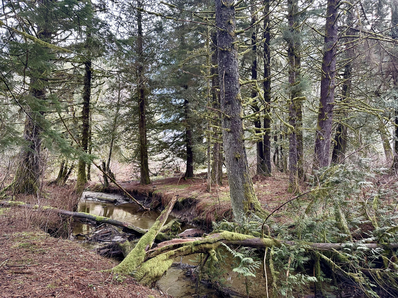 The treed portion of the property features a lush coastal forest with a mix of mature evergreens including cedar and spruce. The ground cover consists of ferns, shrubs, and fallen branches, creating a natural and untouched setting along the clear, gently flowing creek. The cleared half of the property is open and grassy, offering a maintained lawn area that provides space for recreation or future development. This mix of forest and open land creates a diverse and scenic landscape.