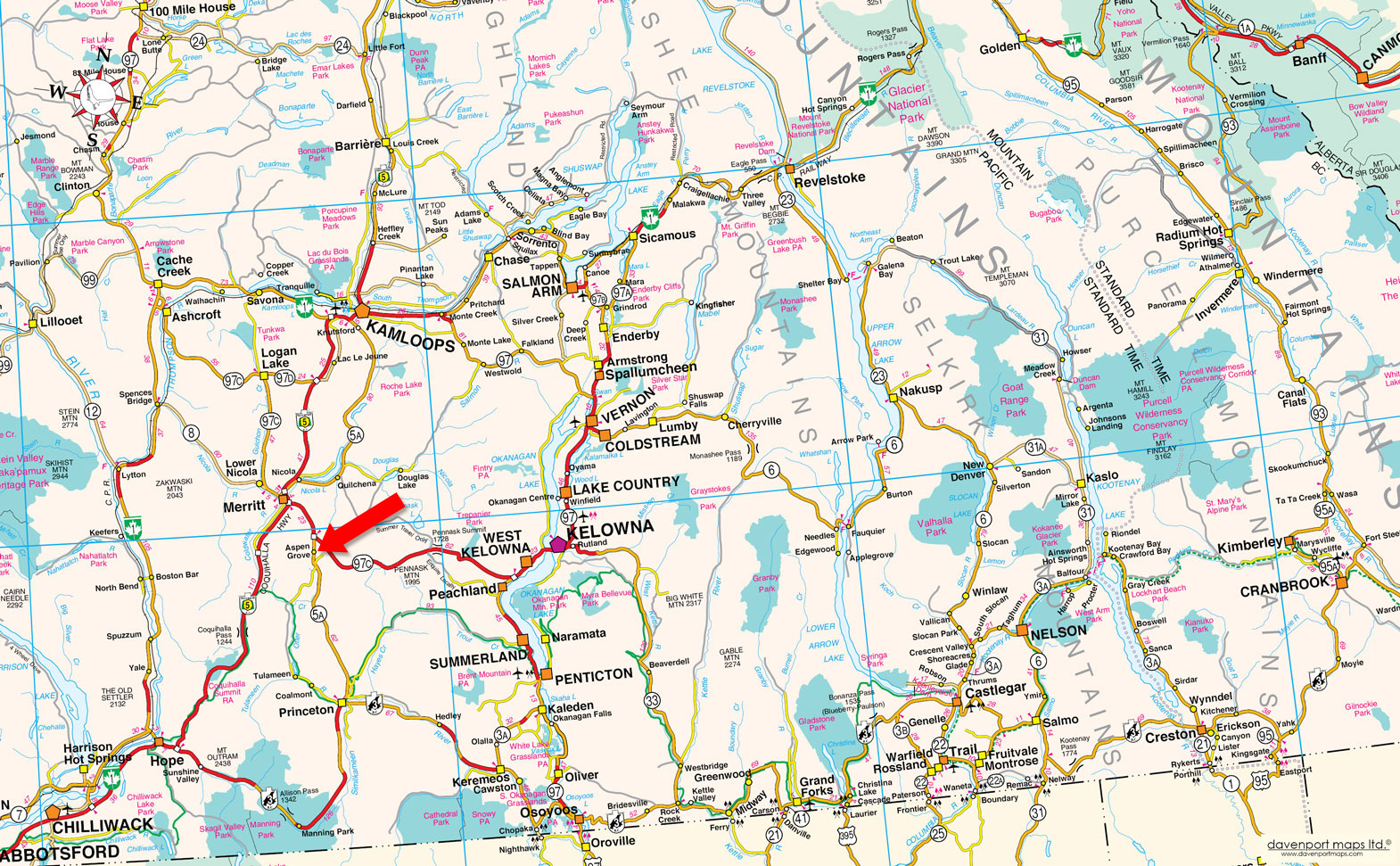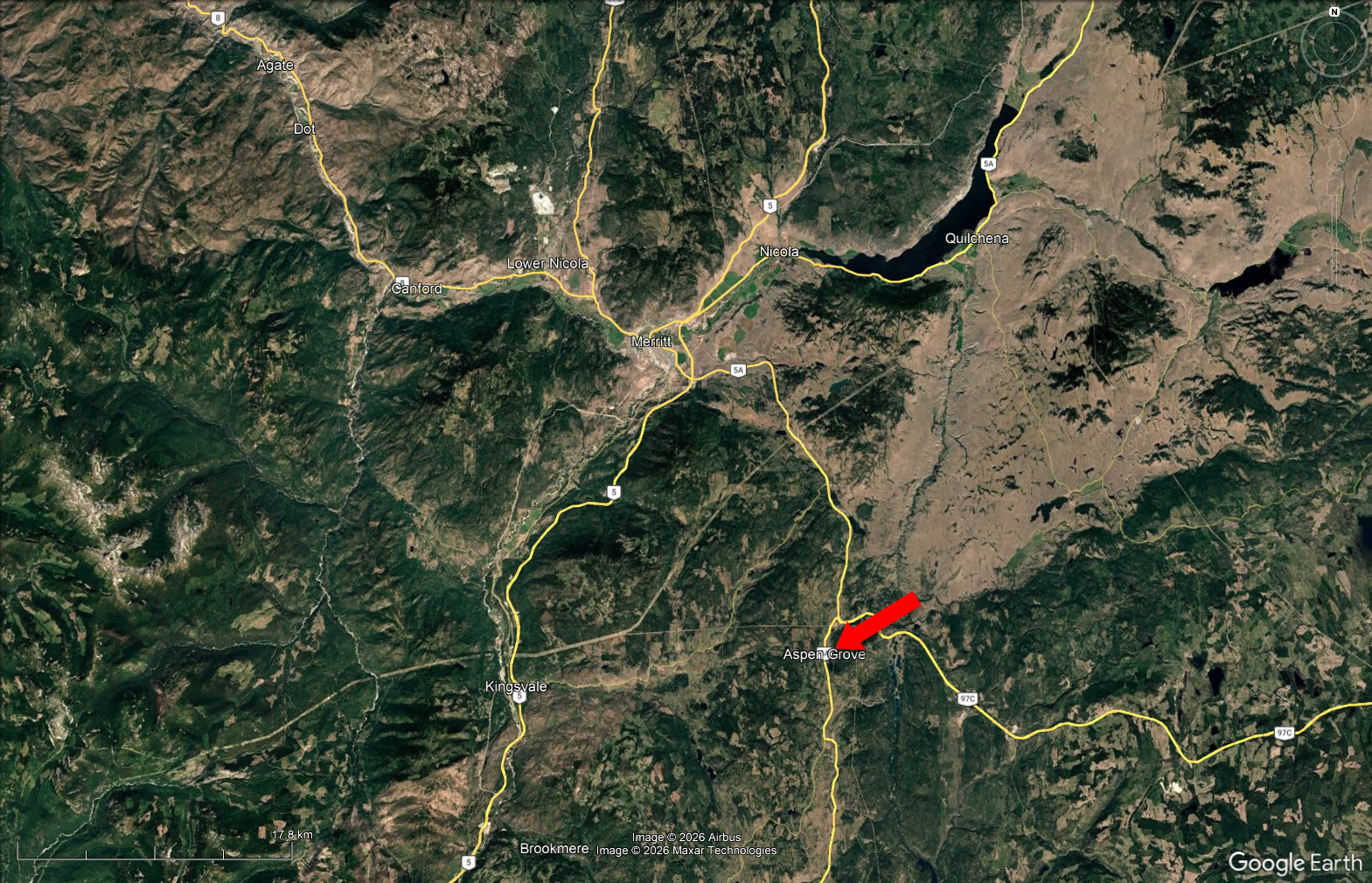 Aspen Grove is a quiet rural community located in the Thompson-Nicola region of south-central British Columbia, about 20 minutes southeast of Merritt and approximately 45 minutes from both Princeton and West Kelowna. Sitting at an elevation of roughly 1,100 metres (3,600 feet) above sea level, the area enjoys expansive views of rolling ranch lands, forests, and surrounding mountains. The landscape is known for its open grasslands, pine forests, and beautiful stands of trembling aspen trees that give the community its name.