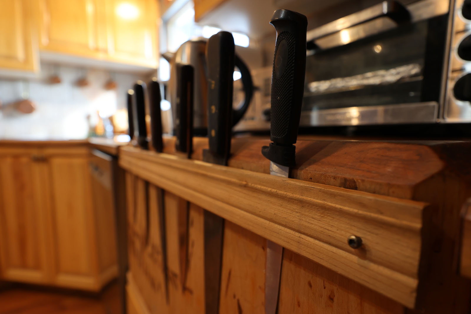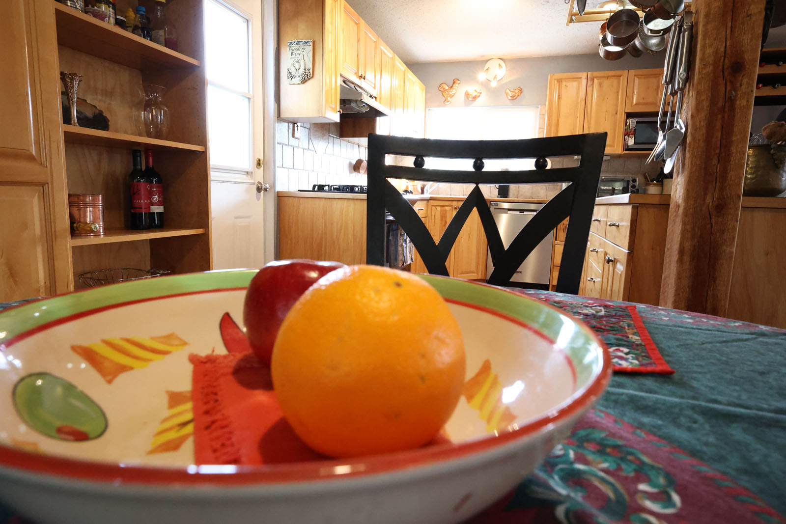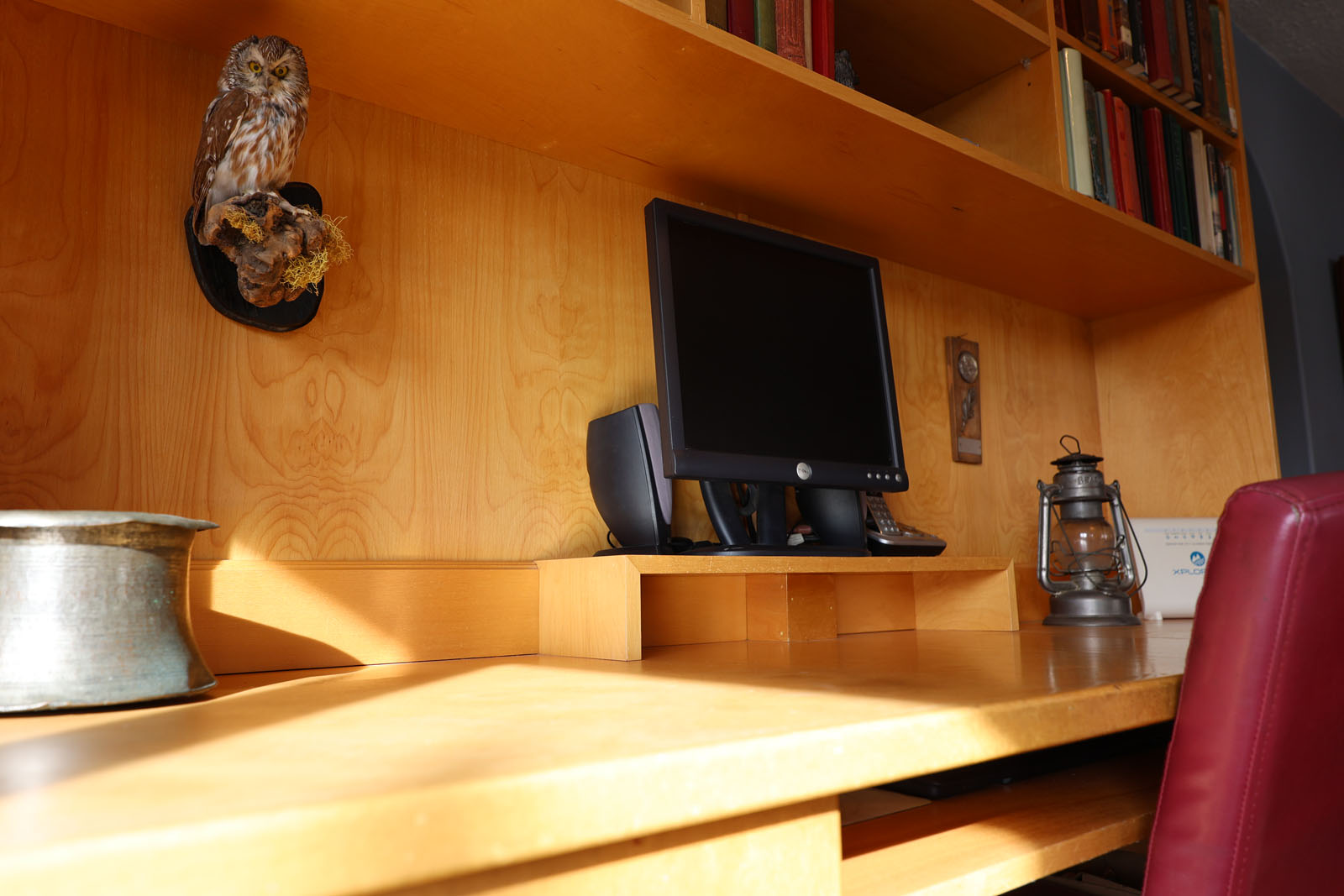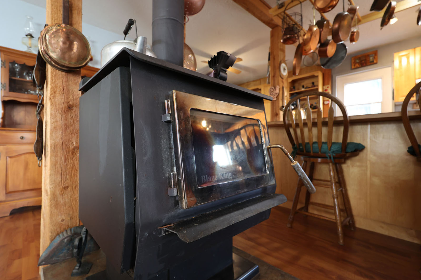 The living room is a cozy yet functional space, highlighted by a charming wood stove that provides warmth and ambiance during cooler months. Custom built-in shelving and a desk area add both character and practicality. Large windows and patio doors frame the beautiful outdoor scenery while filling the home with natural light throughout the day.
