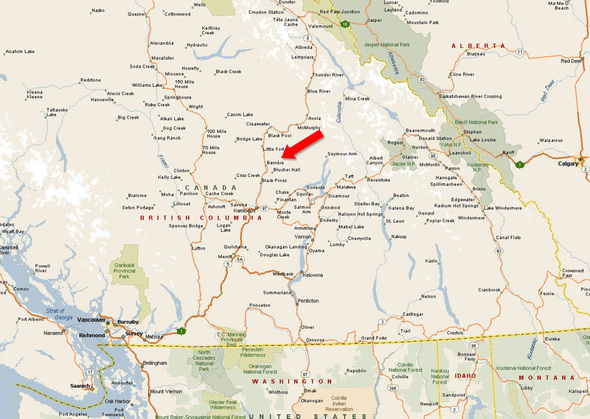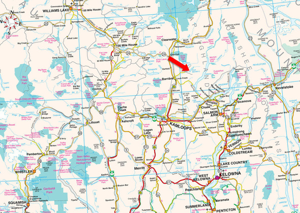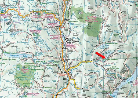 Travel north or south to Barriere, BC, via Highway 5. Turn northeast onto Barriere Town Road until you reach Barriere Lakes Road, travel east for 21 km, then turn north (left) onto Fir Road, which turns into Russel Creek Forest Service Road (FSR). Follow this road until there is a fork in the road and turn right to Barriere Ridge Resort. From Fir Road, the way to the resort is well-marked. A gate is at the upper end of the resort that requires a combination to enter.