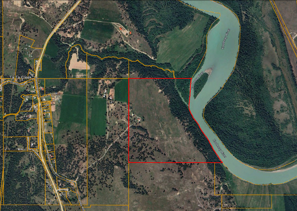 The land transitions from open, productive ground to treed river edges, giving both working and recreational value. There is a nice flat bench right above the river, the kind of spot that could host a private hideaway cabin. With nearly 3,000 feet of frontage, owners can enjoy fishing, boating, or simply taking in the scenery from their own property.