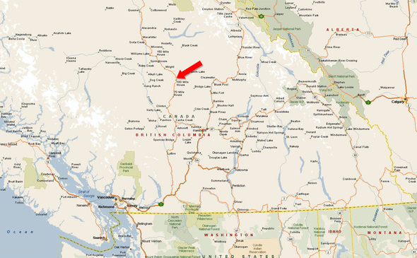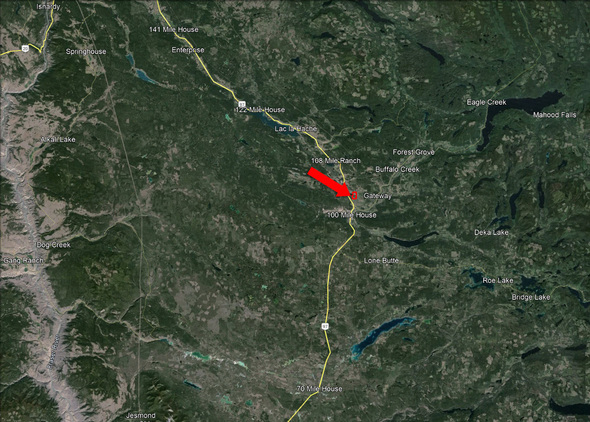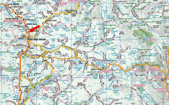 Take the Trans-Canada Highway (Highway 1) west for 75 km (46.5 mi) to the community of Cache Creek. Turn north (right) onto Highway 97 and travel through the community of Clinton and keep following north through 100 Mile House until you get to 103 Mile House.