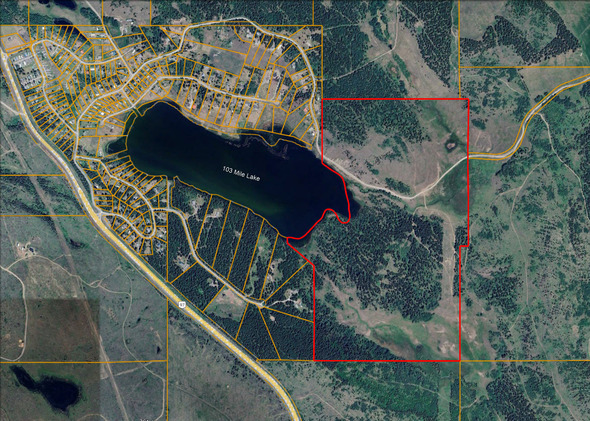 280-acre ranch. Prime west-facing waterfront on 103 Mile Lake. Only 5 minutes to town. Rolling grassland with grazing for cattle or horses. Plenty of treed area. Lakefront building sites. A true paradise for horseback riding, ATV, snowmobiling or hiking. Close to amenities, totally private.
