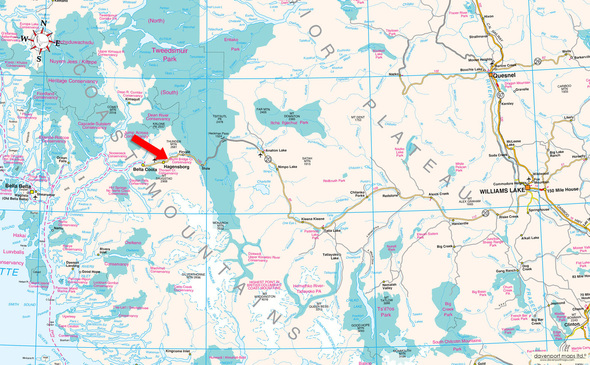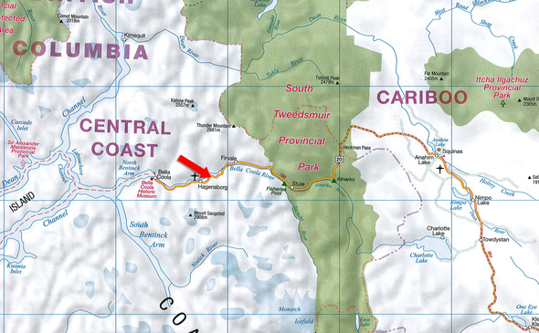From Williams Lake travel Highway 20 West for 477 km. This highway will take you over the Chilcotin Plateau, into Tweedsmuir Provincial Park and down “The Hill” dropping 1,400 metres into the scenic Bella Coola Valley. You then travel alongside the breathtaking Atnarko and Bella Coola Rivers before you cross Nusatsum Bridge. Just a few kilometres past the bridge, you will see the gated property on the left.
