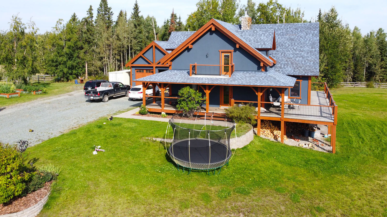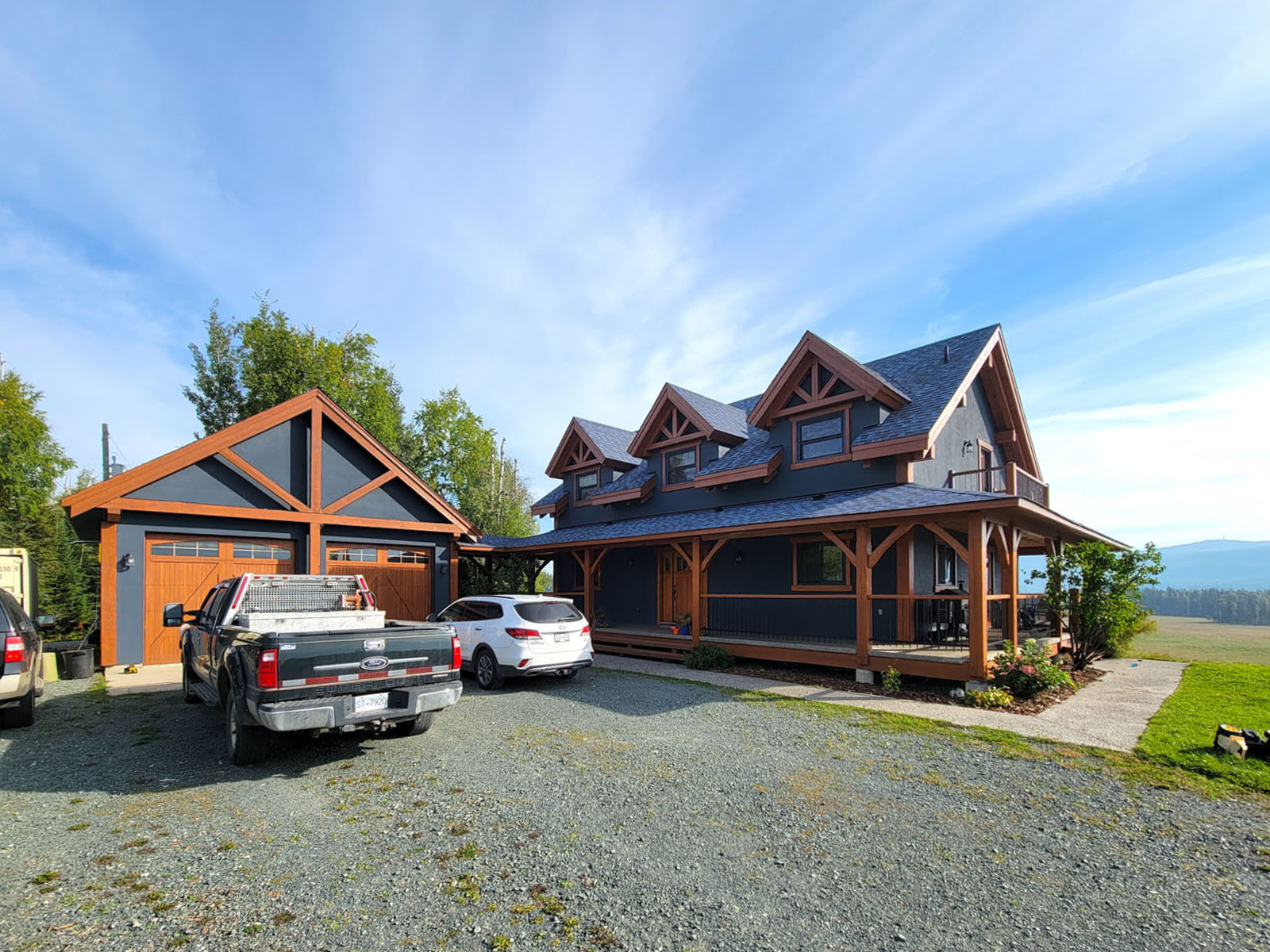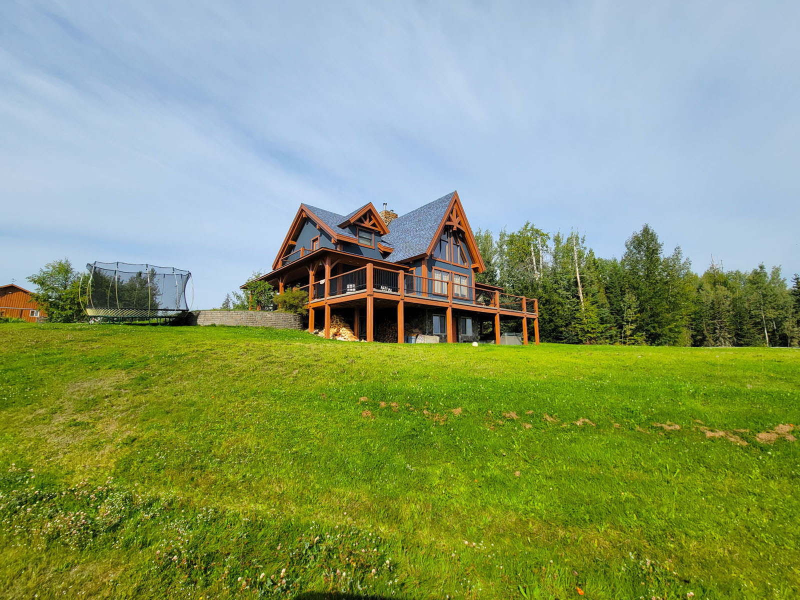 The improvements match the scale and ambition of the land. The main house is a substantial 2,299 square foot two-storey residence on a full basement, built in 2006 to a high standard. Wood frame construction with wood and stucco siding, a concrete perimeter foundation, double-pane vinyl windows, and an asphalt shingle roof provide a solid and well-finished envelope.