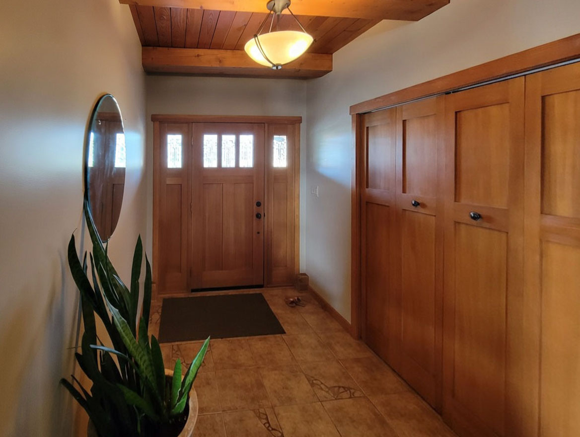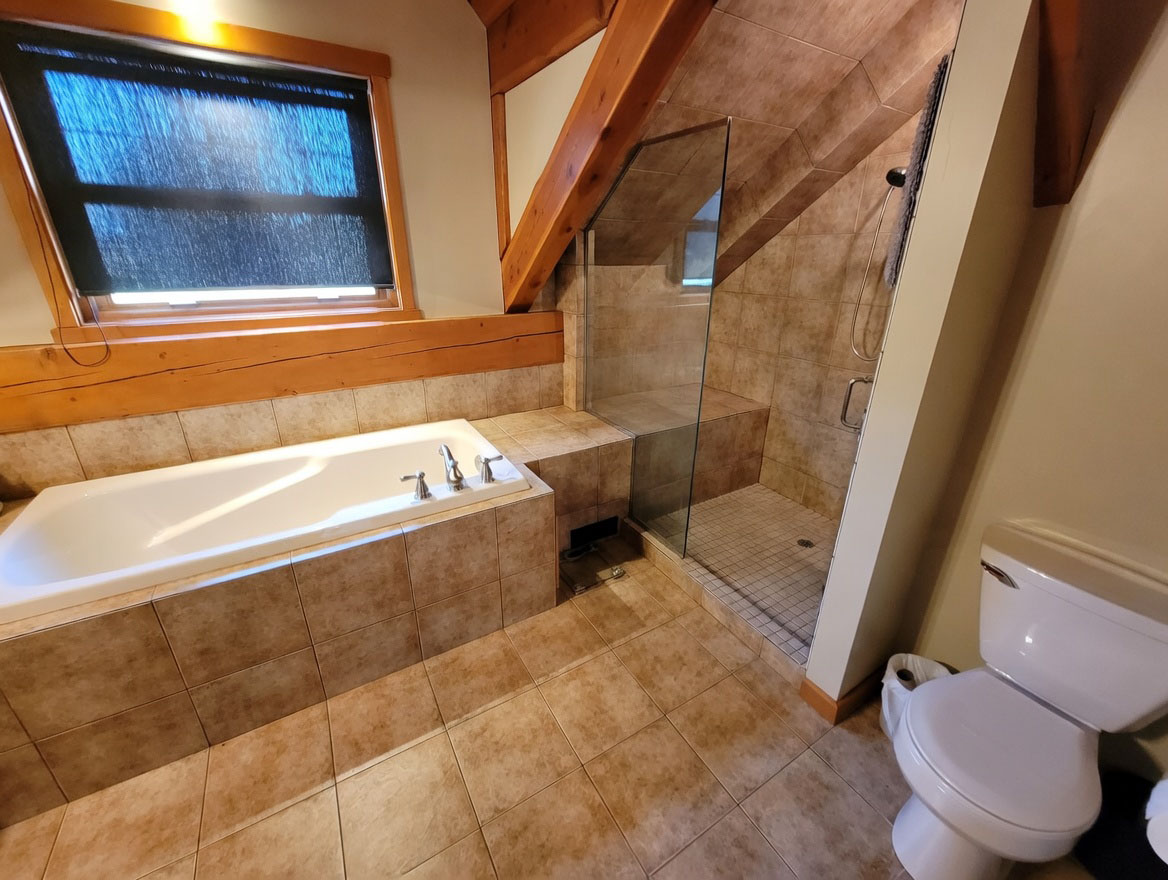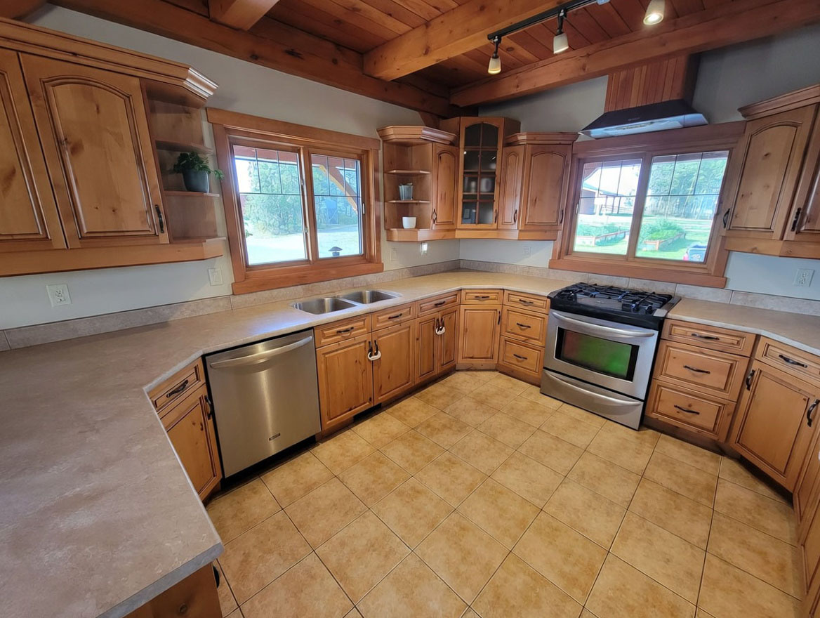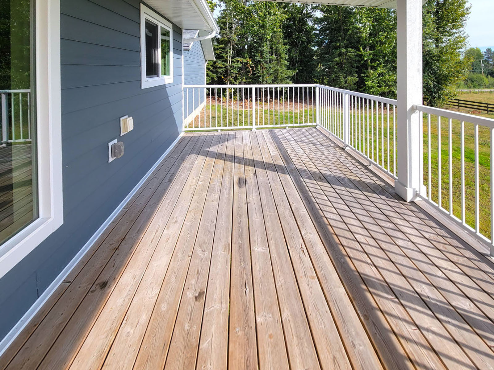The improvements match the scale and ambition of the land. The main house is a substantial 2,299 square foot two-storey residence on a full basement, built in 2006 to a high standard. Wood frame construction with wood and stucco siding, a concrete perimeter foundation, double-pane vinyl windows, and an asphalt shingle roof provide a solid and well-finished envelope.