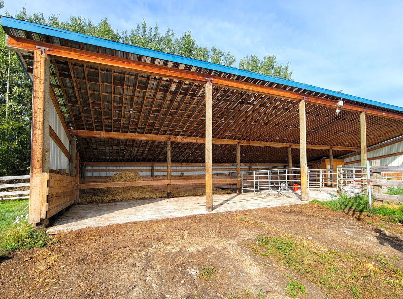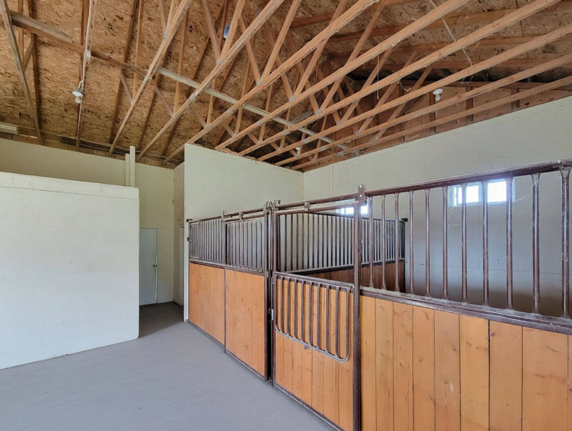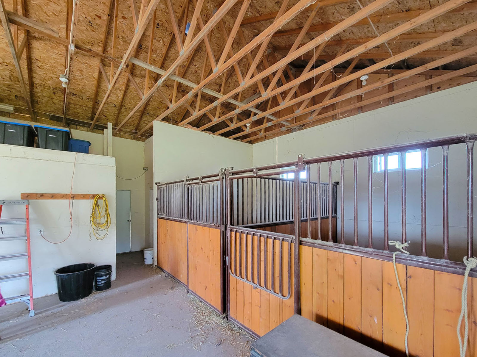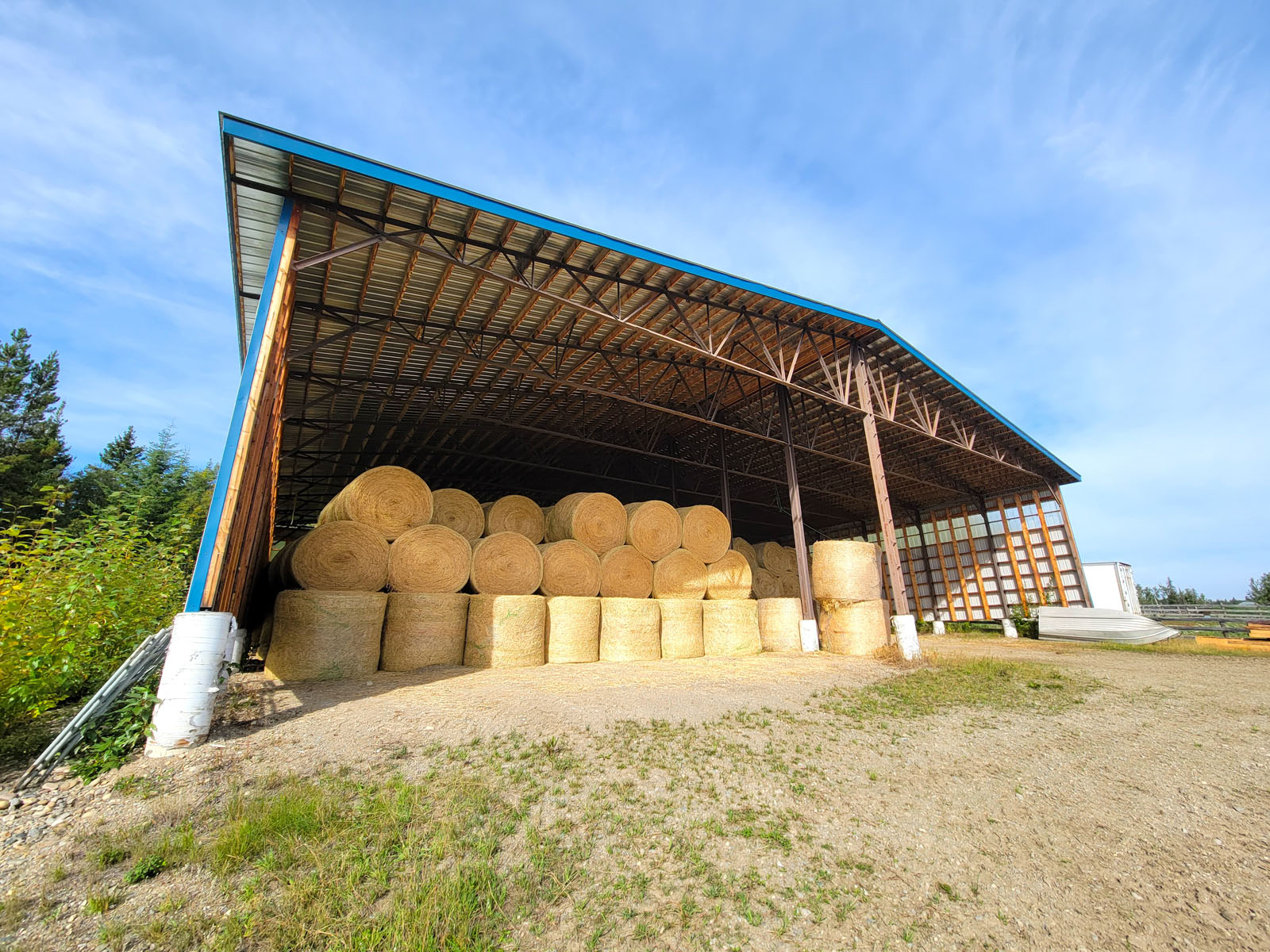The agricultural outbuildings are extensive and purpose-built. A 936 square foot horse barn includes stalls, tack rooms and chicken pens with two lean-to attachments handles day-to-day livestock needs. A 3,200 square foot equipment building with concrete foundation and incorporates an enclosed and heated 20 by 40 ft shop with a concrete floor and floor drain, ideal for equipment maintenance and repairs. A 2,640 square foot five-bay pole shelter with concrete slab provides dedicated animal housing. A commanding 7,200 square foot steel hay storage structure with 21-foot clearance ensures the feed supply is well protected. Five additional lean-to outbuildings round out the support infrastructure.